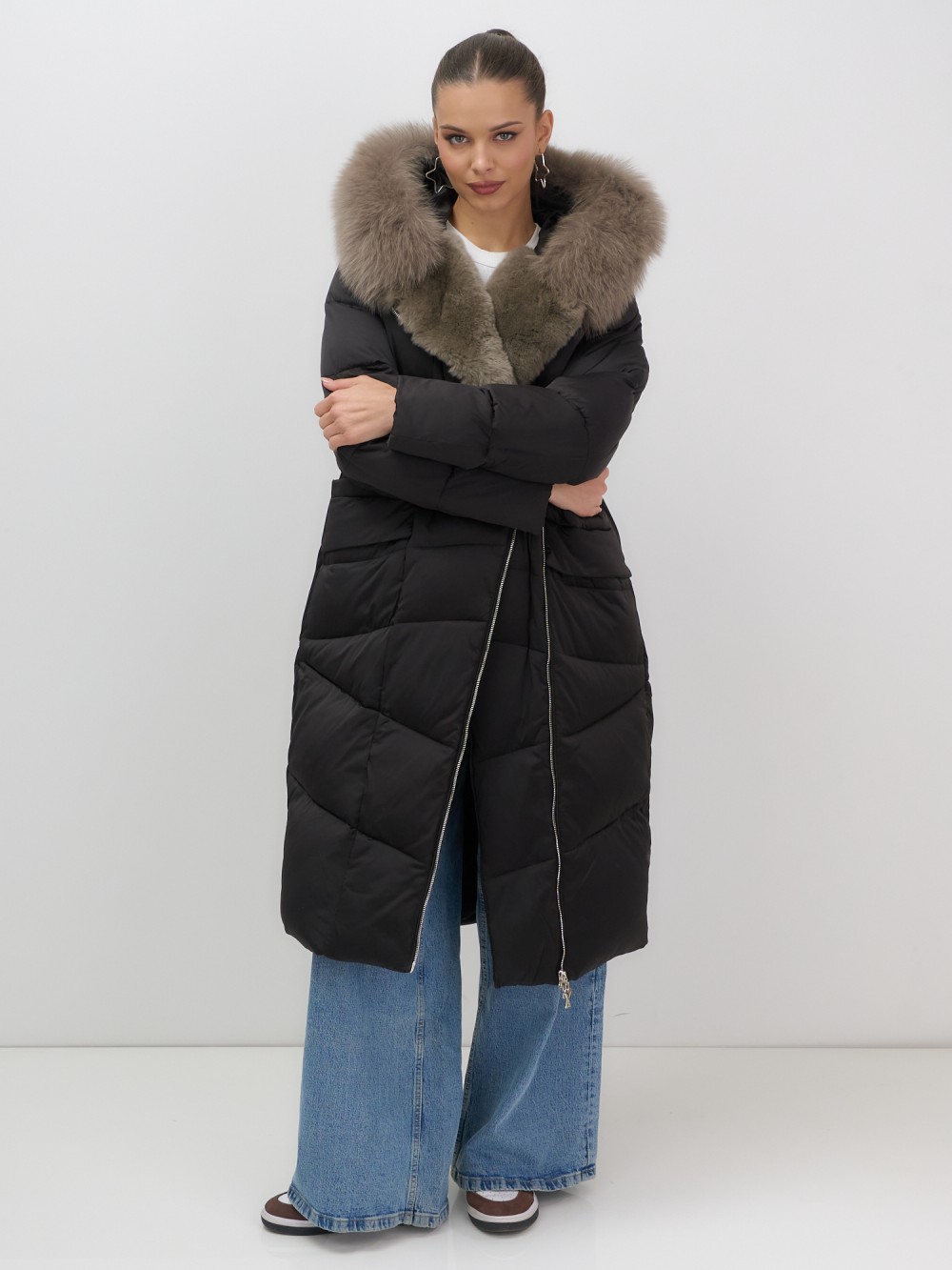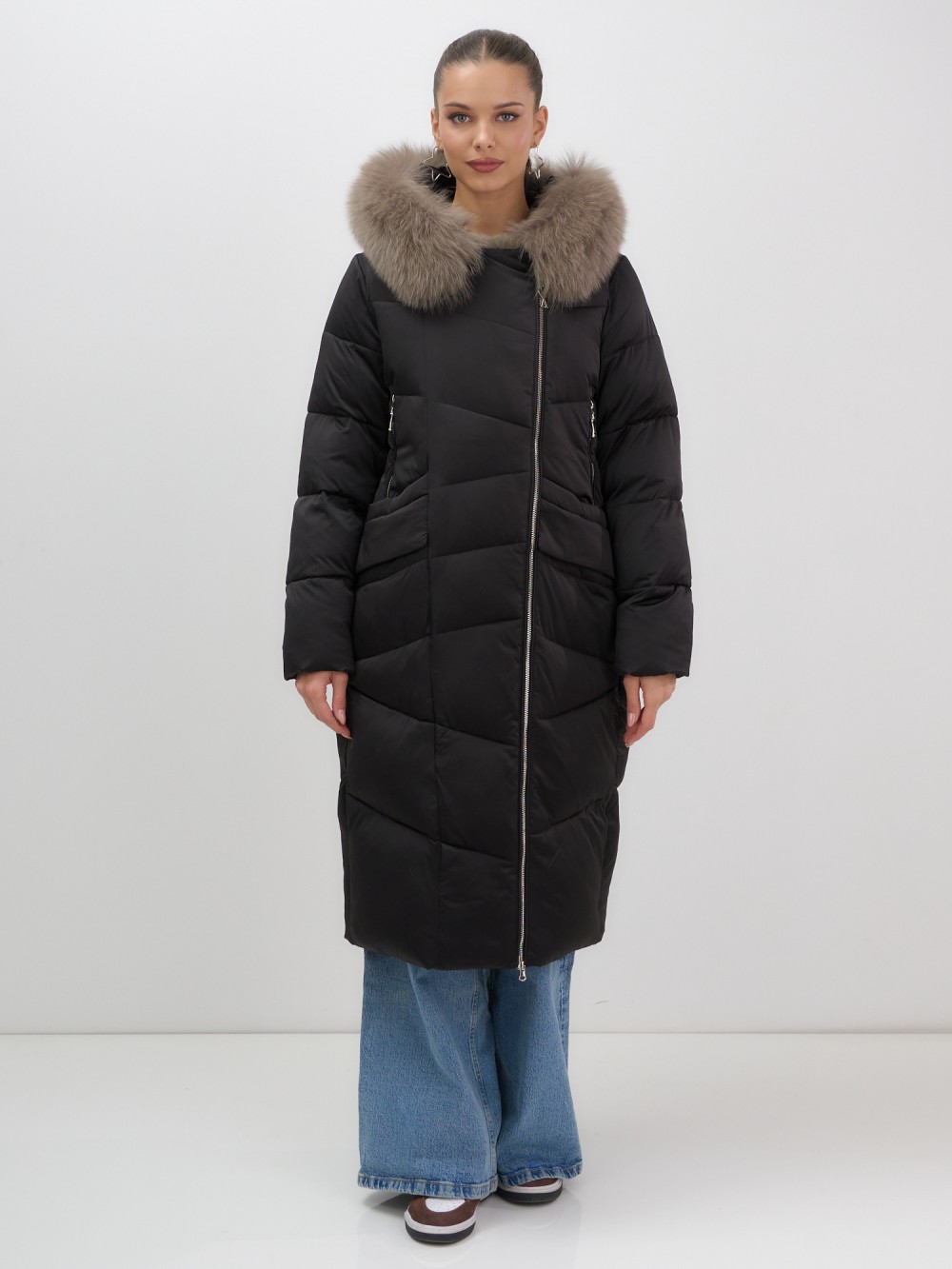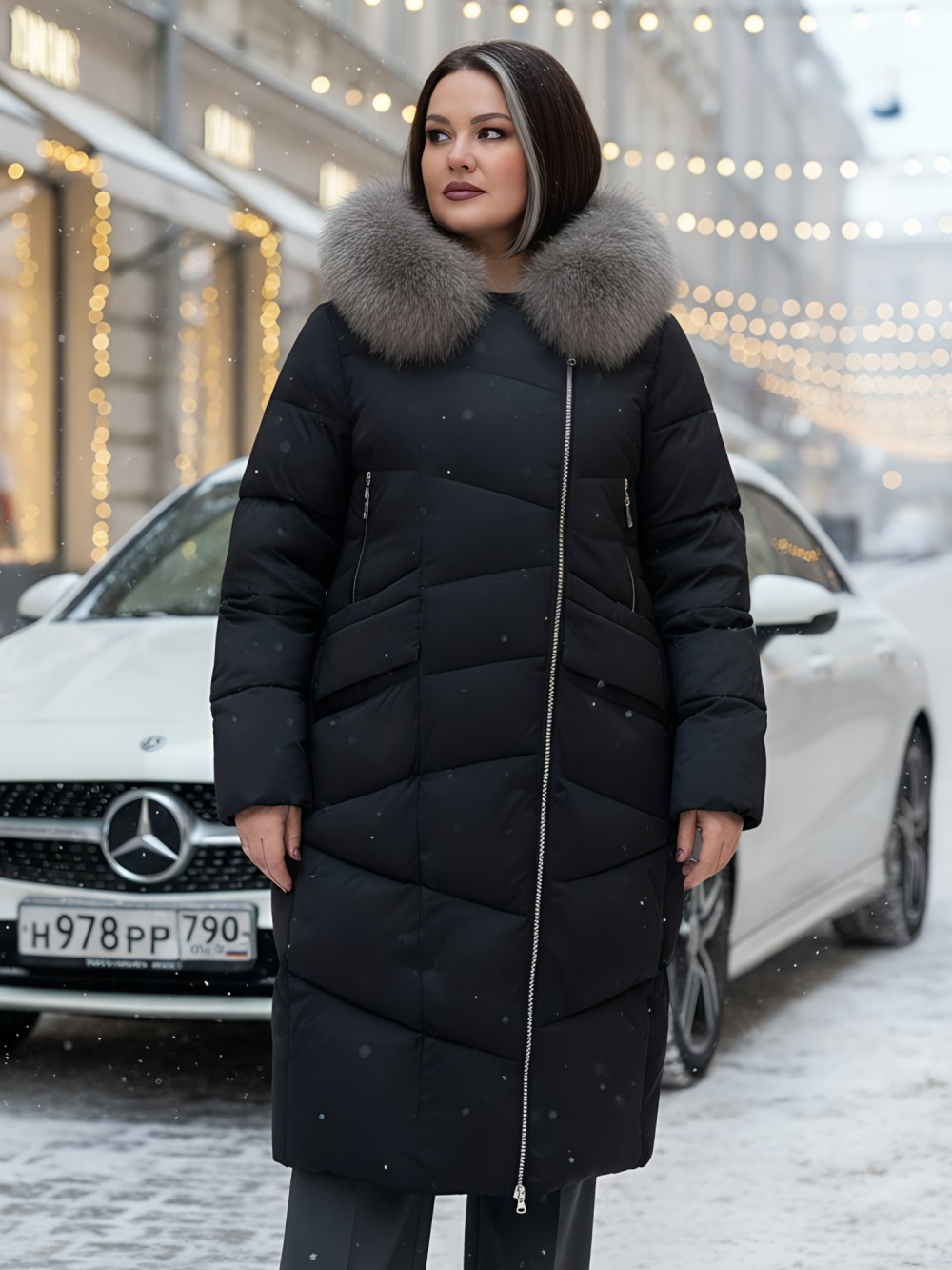 Четыре благородных оттенка коллекции осень-зима 2025 – глубокий черный, роскошный коричневый, изысканный светло-коричневый и элегантный темно-серый – великолепно сочетаются с натуральным мехом. Свободный силуэт идеально подходит для размеров 46-54.