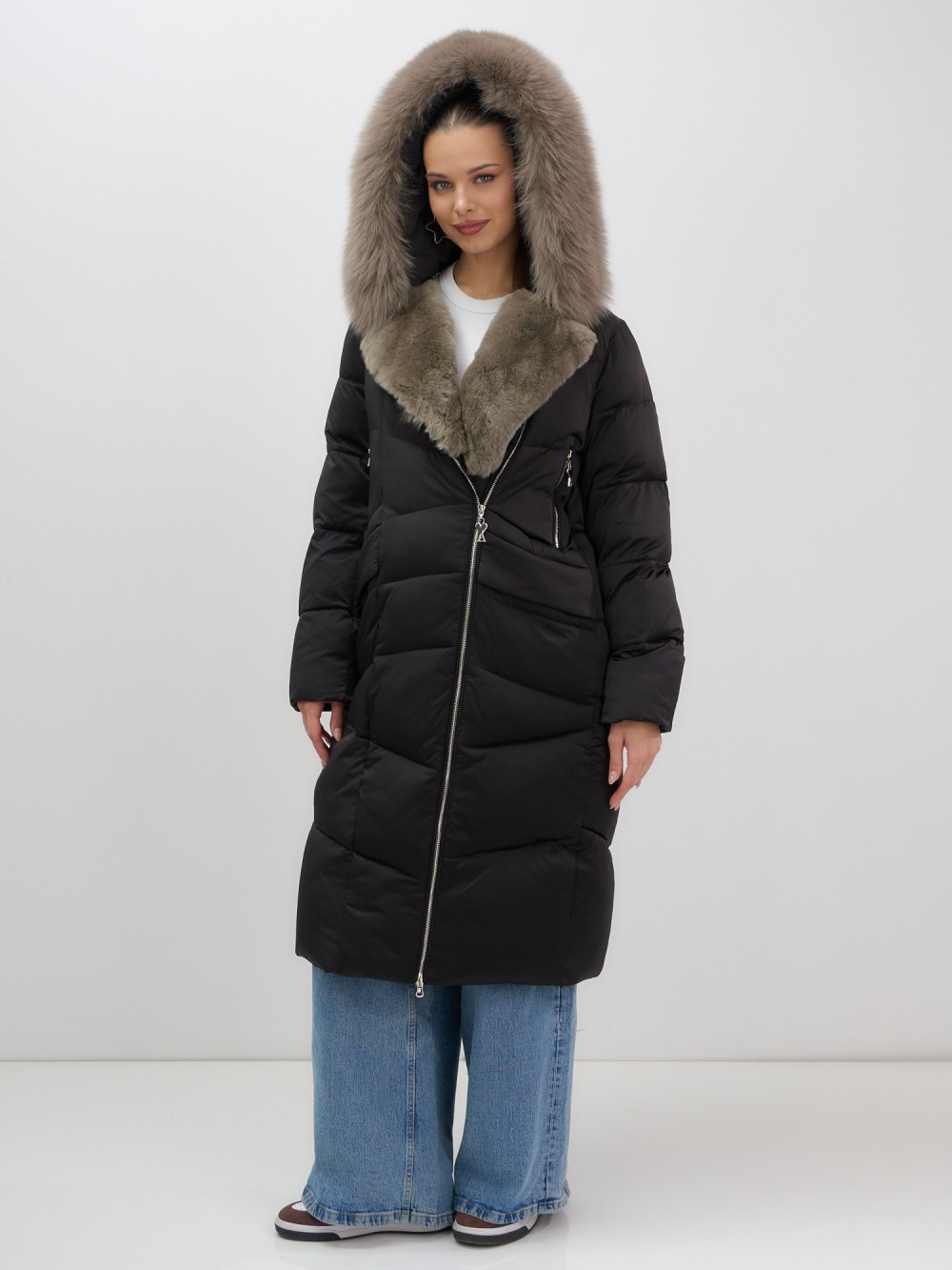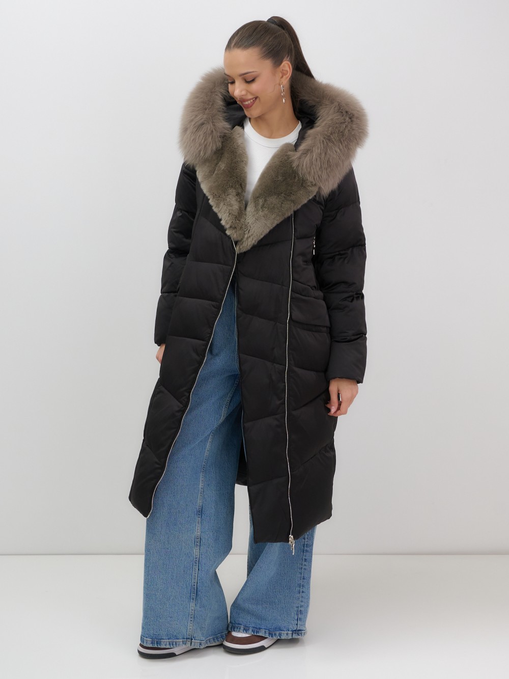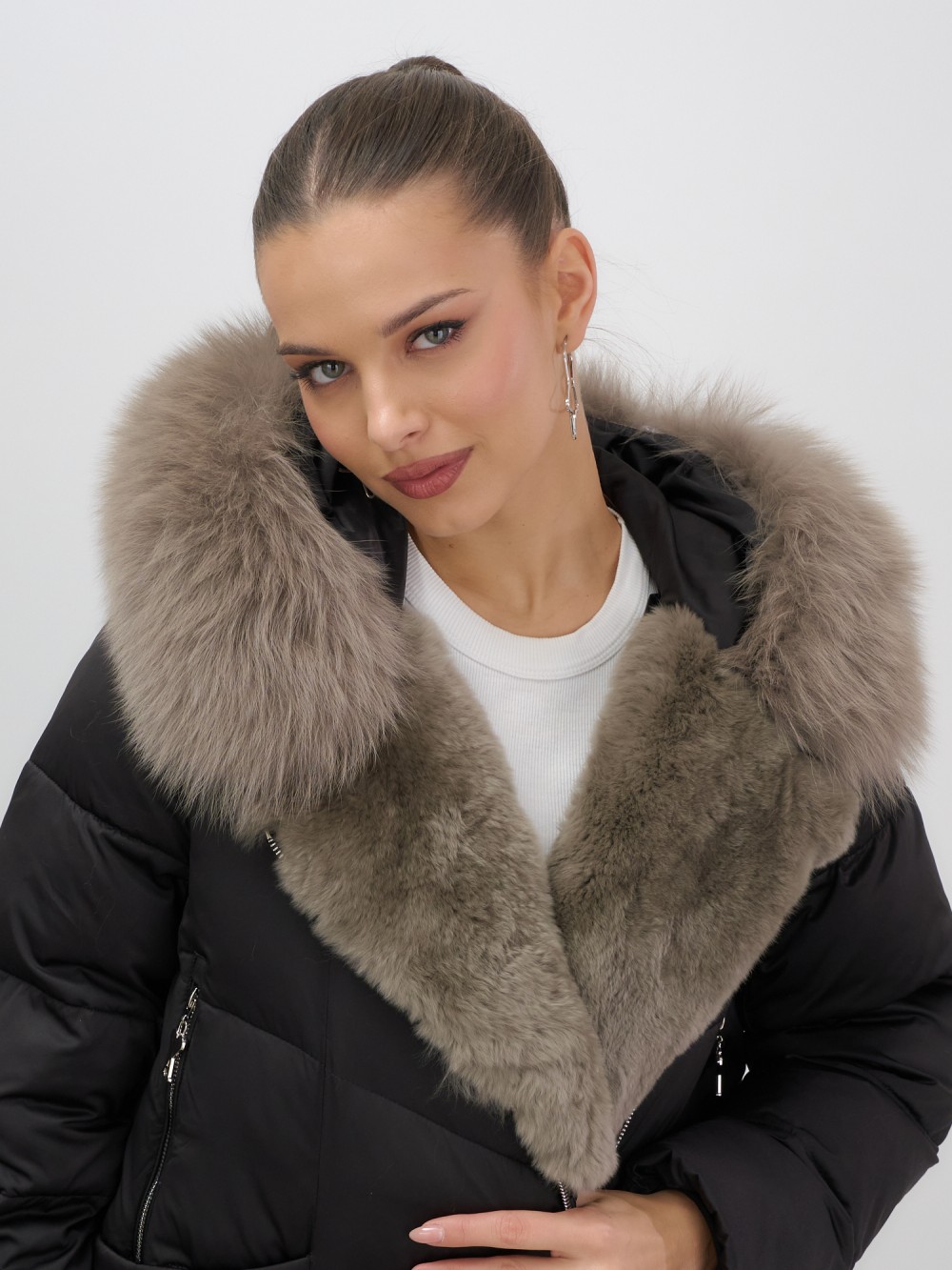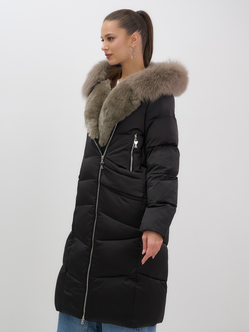 Изысканный английский воротник из натурального меха кролика и роскошная съемная опушка из песца создают неповторимый силуэт. Удлиненный крой ниже колена подчеркивает элегантность линий. Премиальный утеплитель повышенной плотности (640-740 г) обеспечивает максимальную защиту от холода.