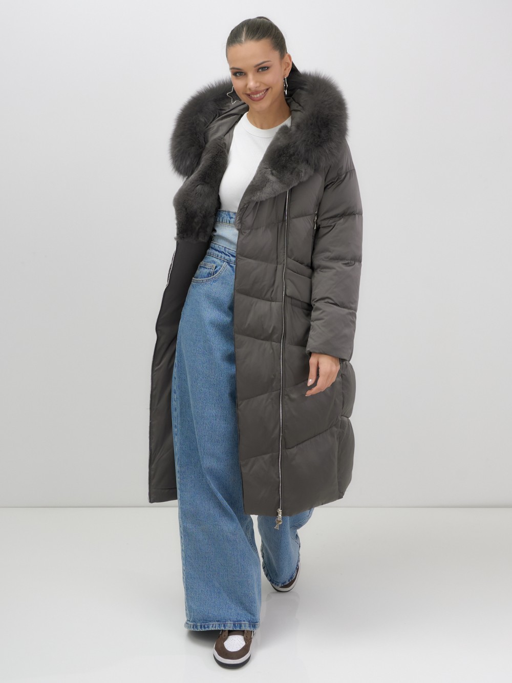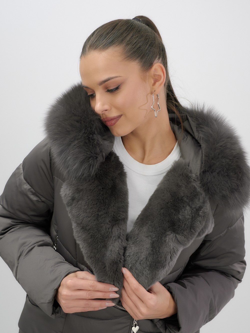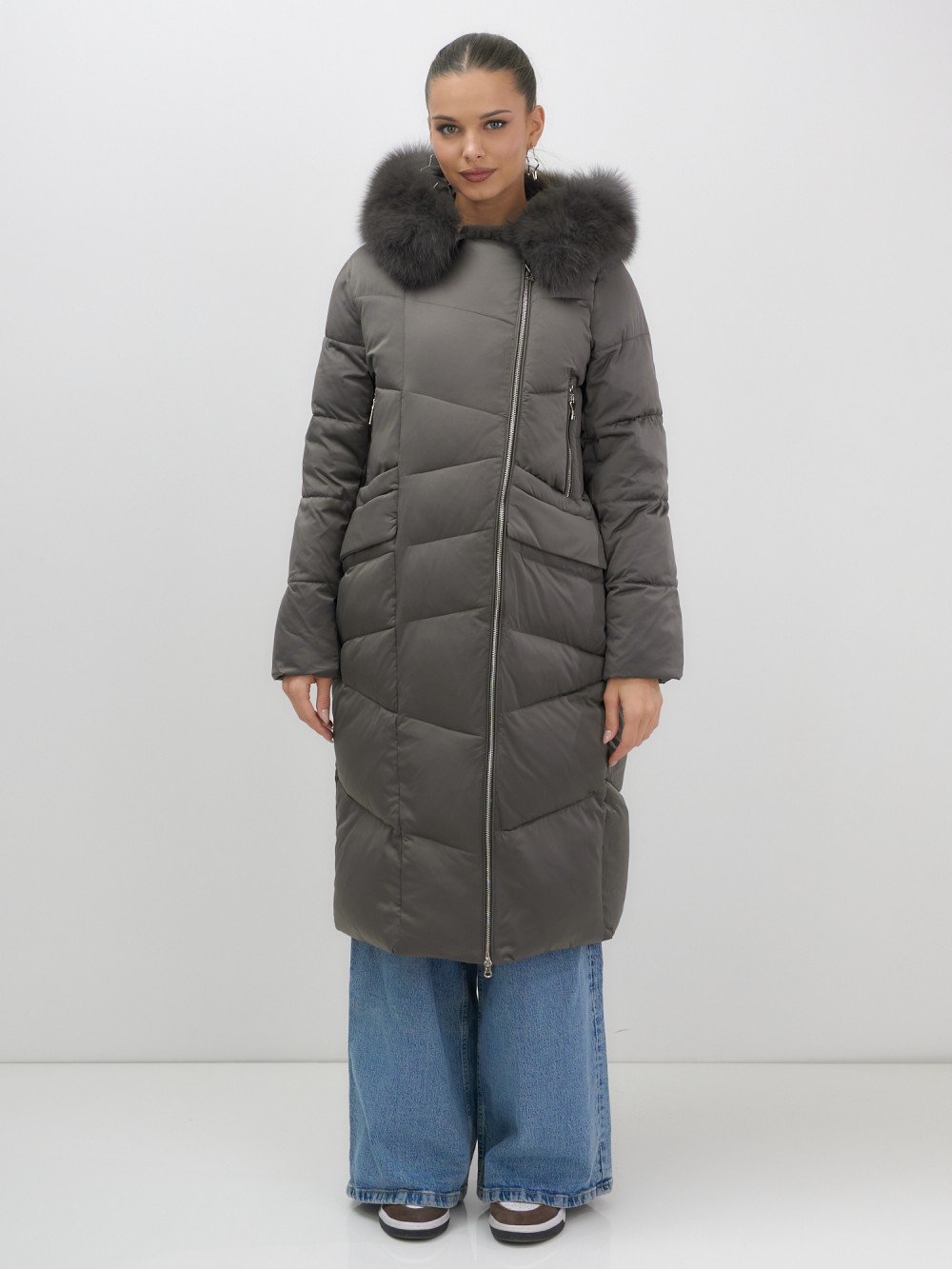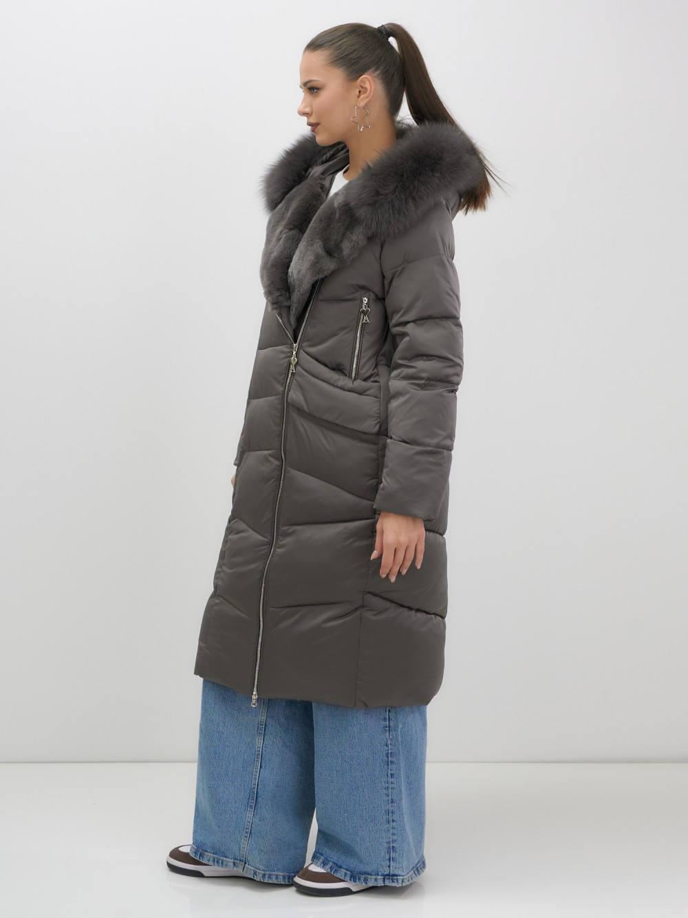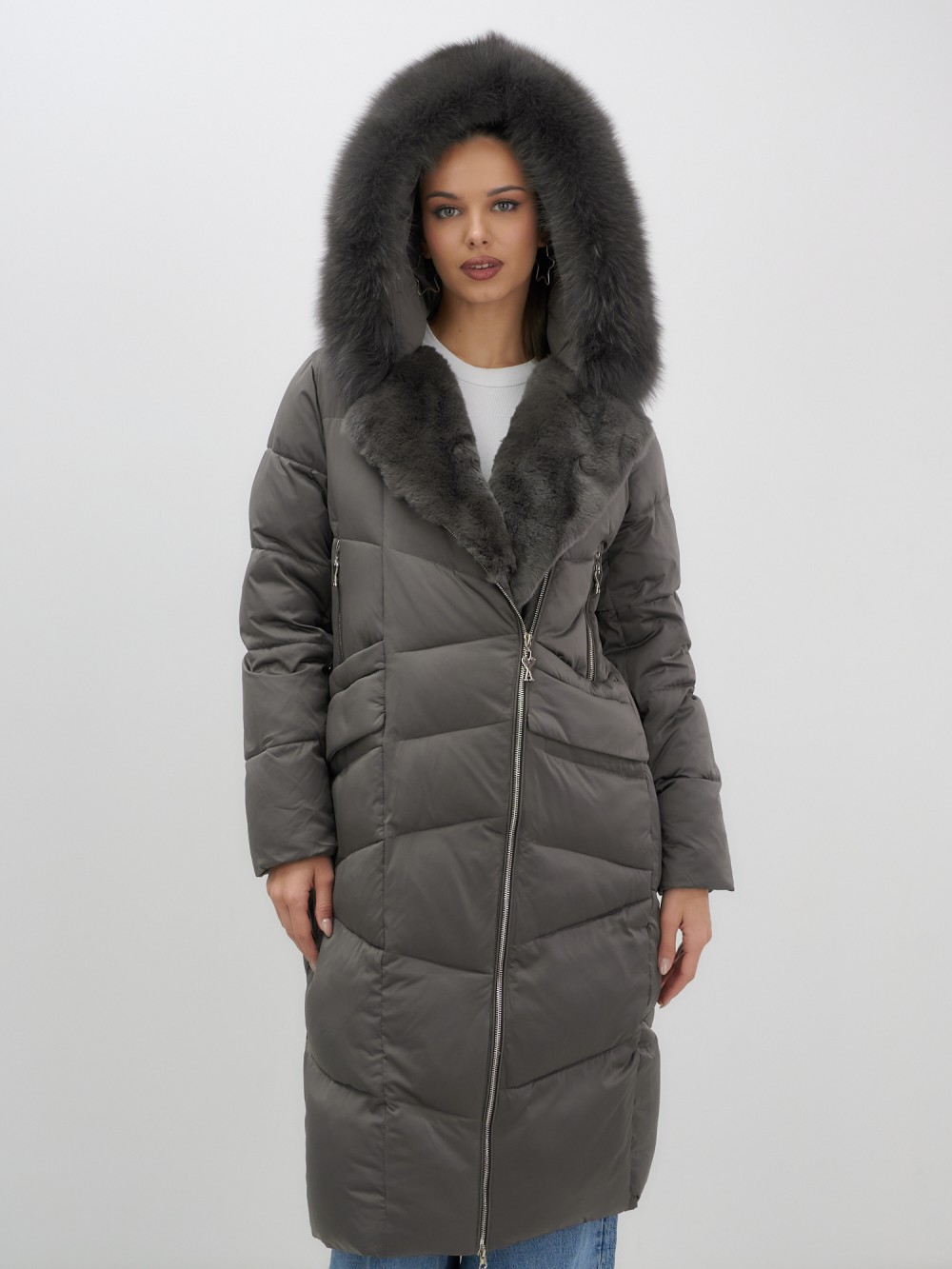 Двубортное пальто зимнее утепленное с мехом и капюшоном темно-серого цвета 7626TC — Visdeer