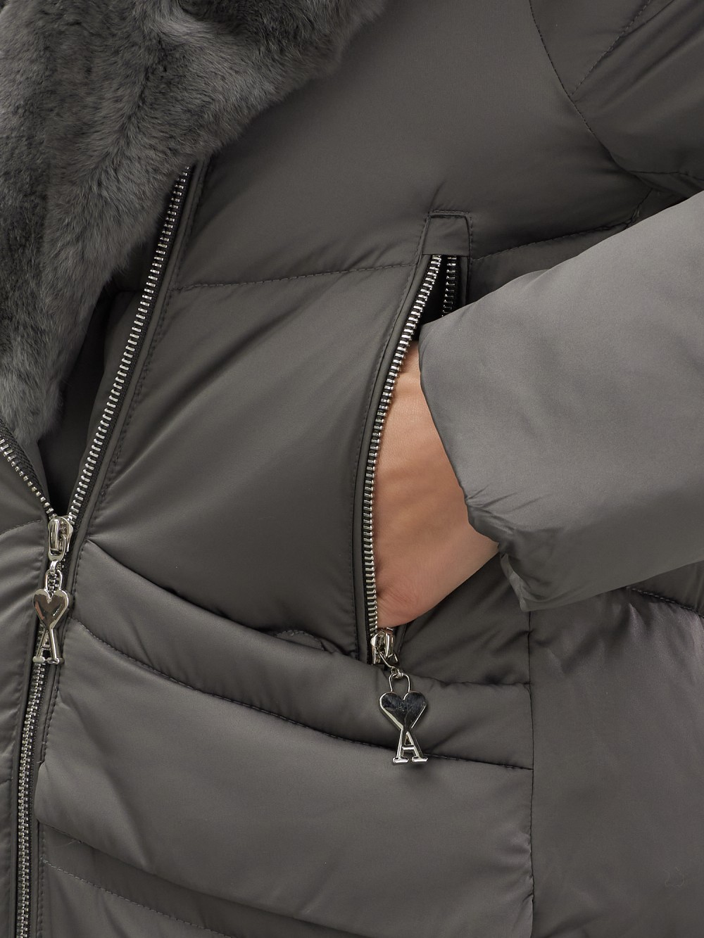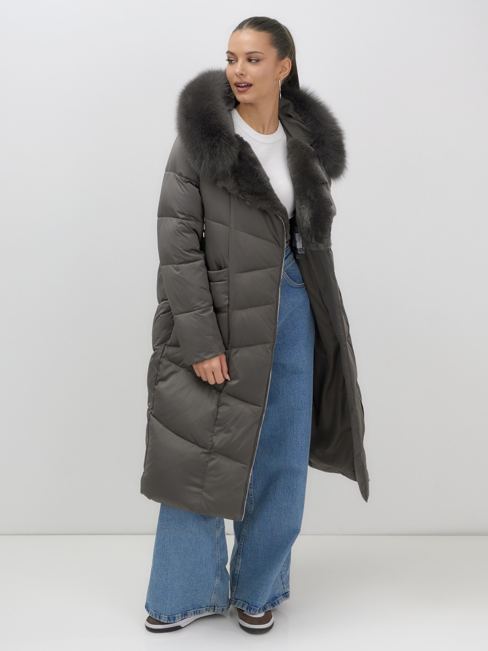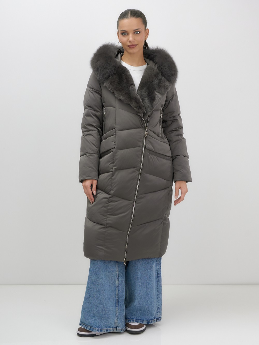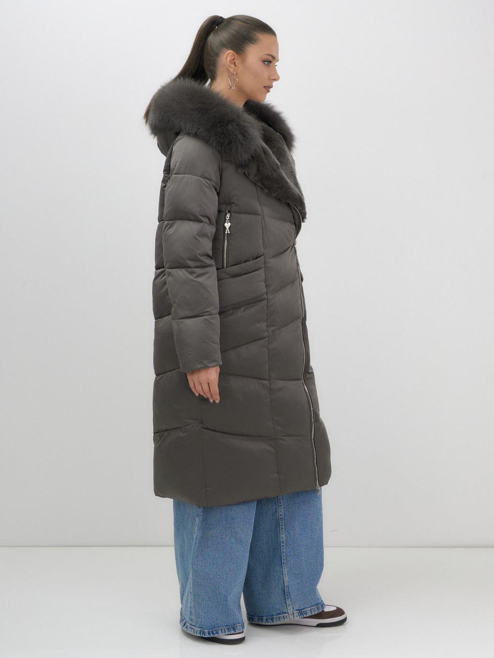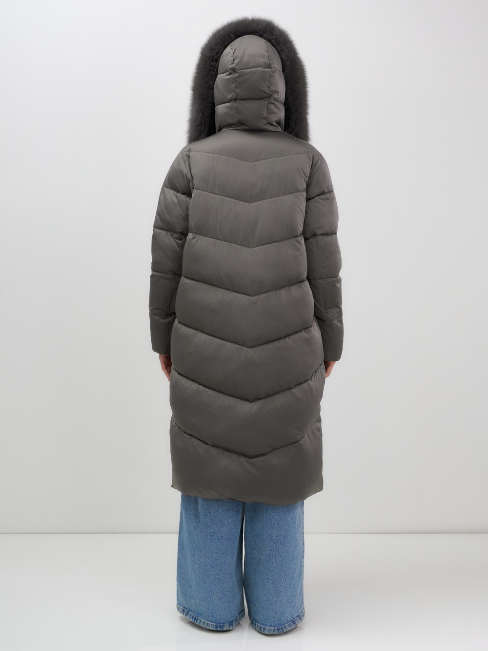 Двубортное пальто зимнее утепленное с мехом и капюшоном темно-серого цвета 7626TC — Visdeer