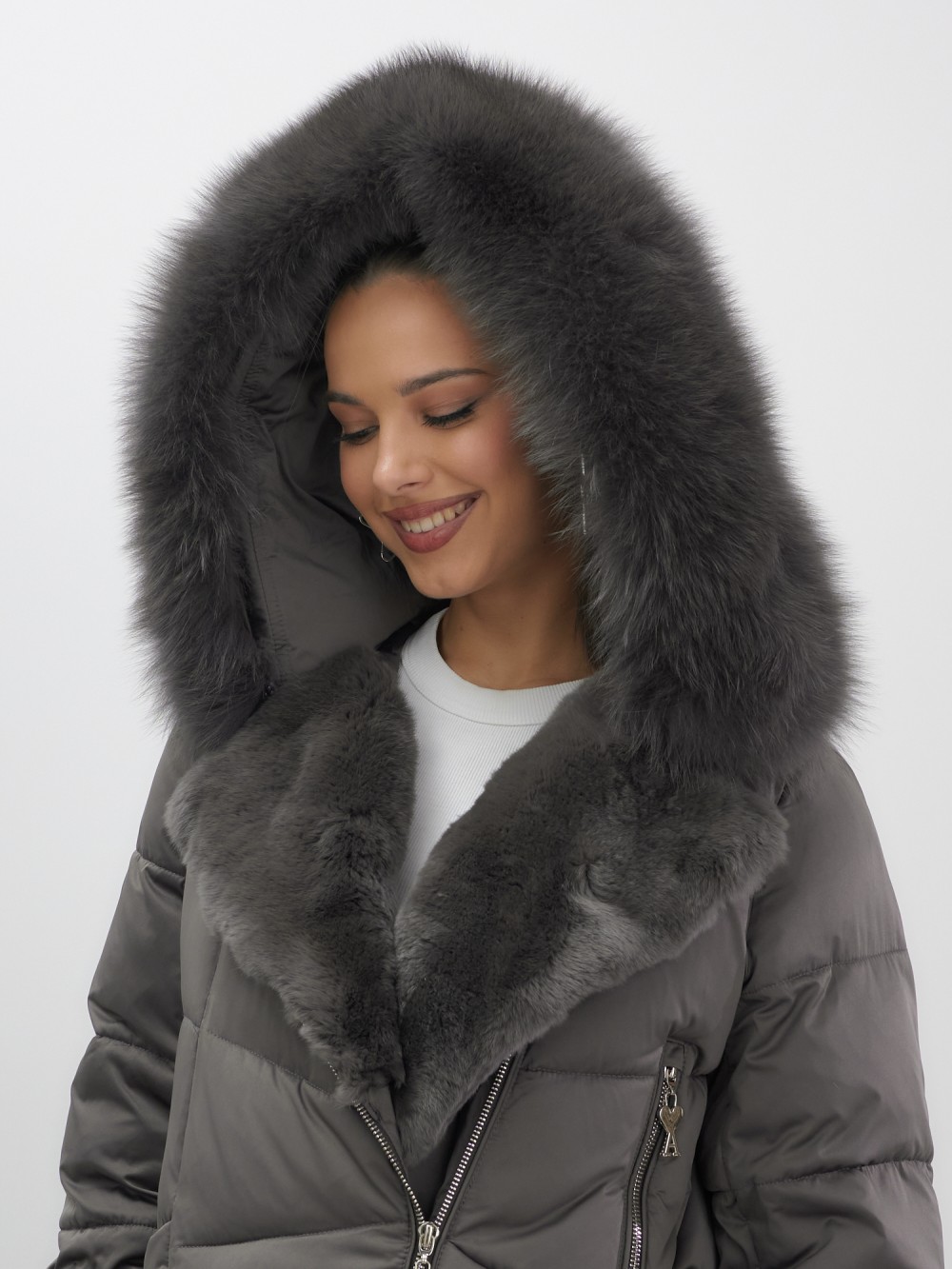 Двубортное пальто зимнее утепленное с мехом и капюшоном темно-серого цвета 7626TC