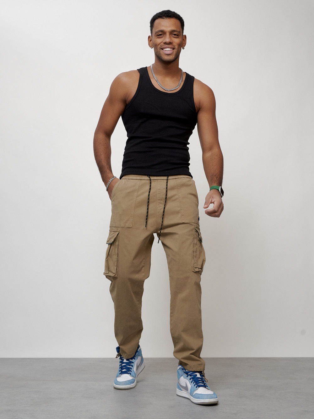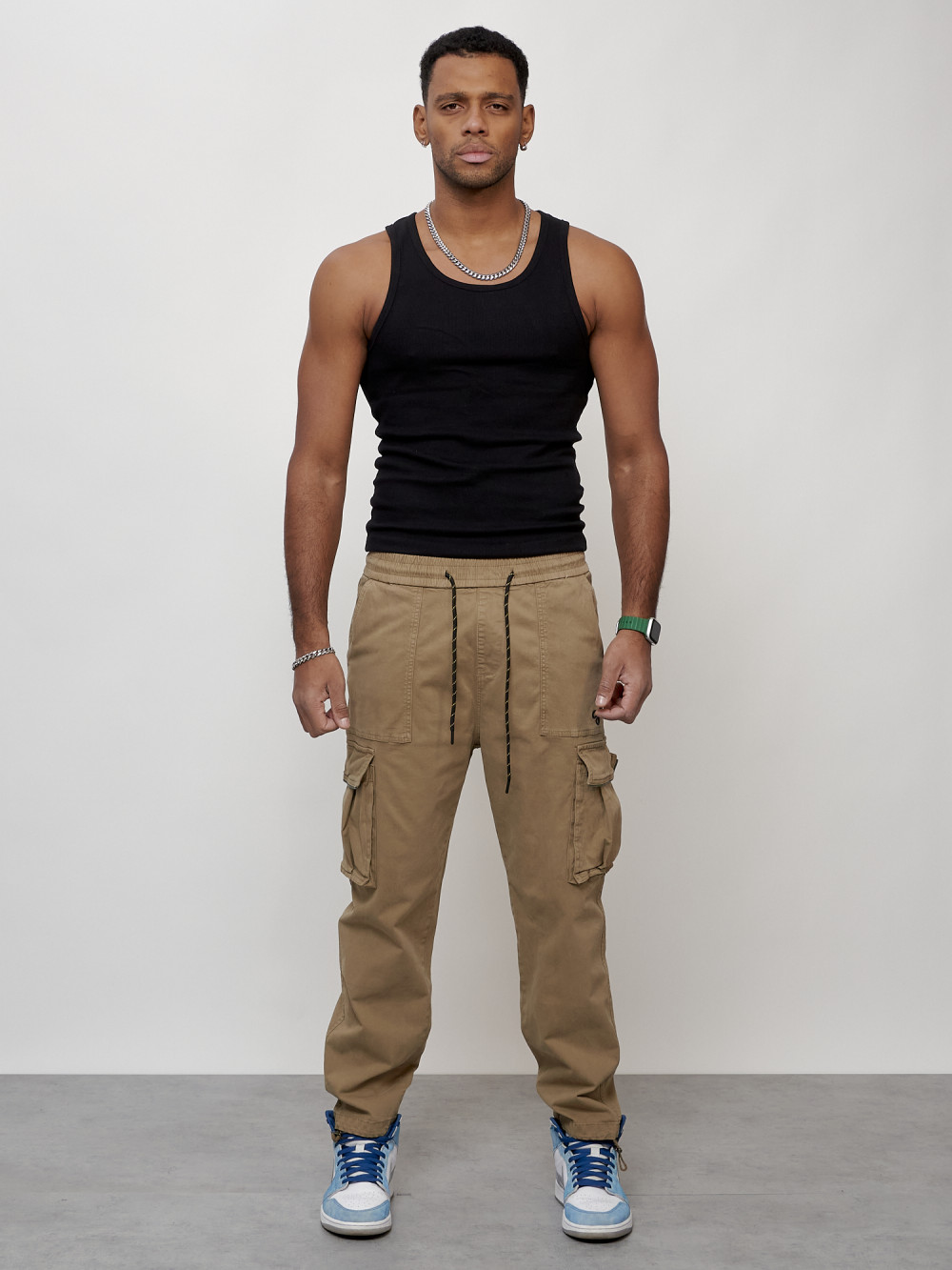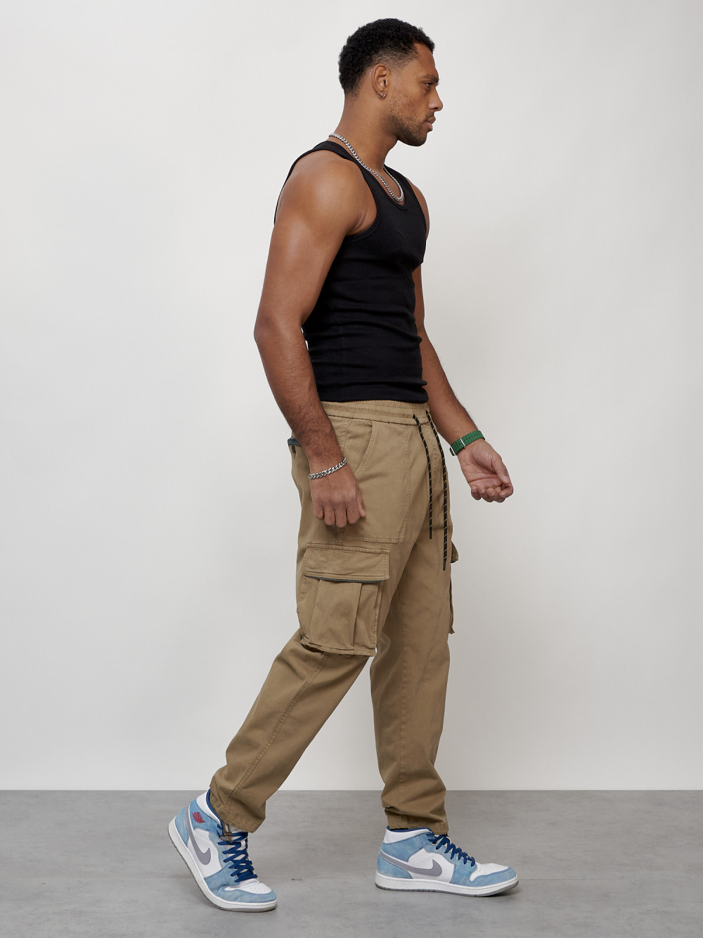 Джинсы карго мужские с накладными карманами бежевого цвета 2424B