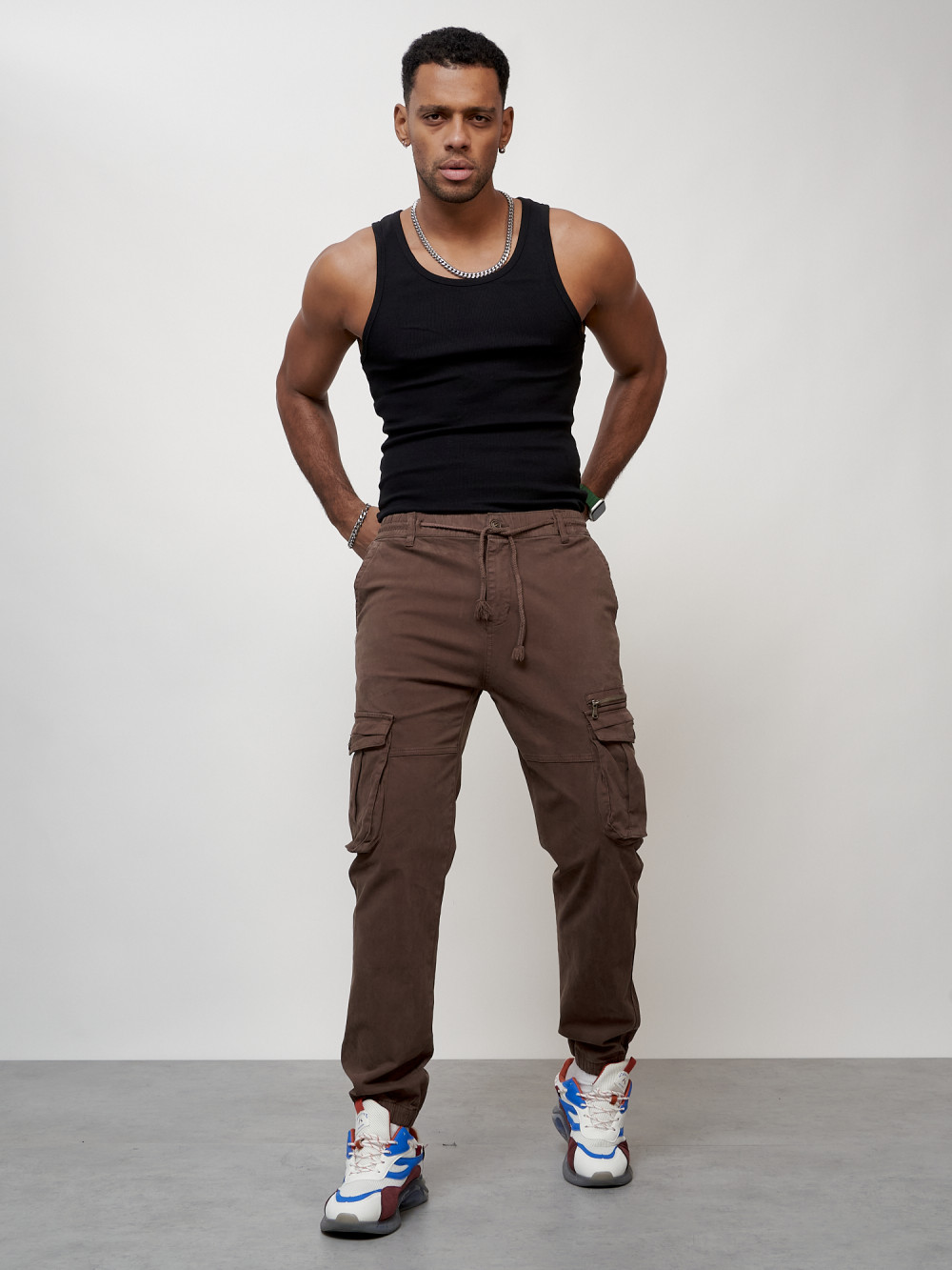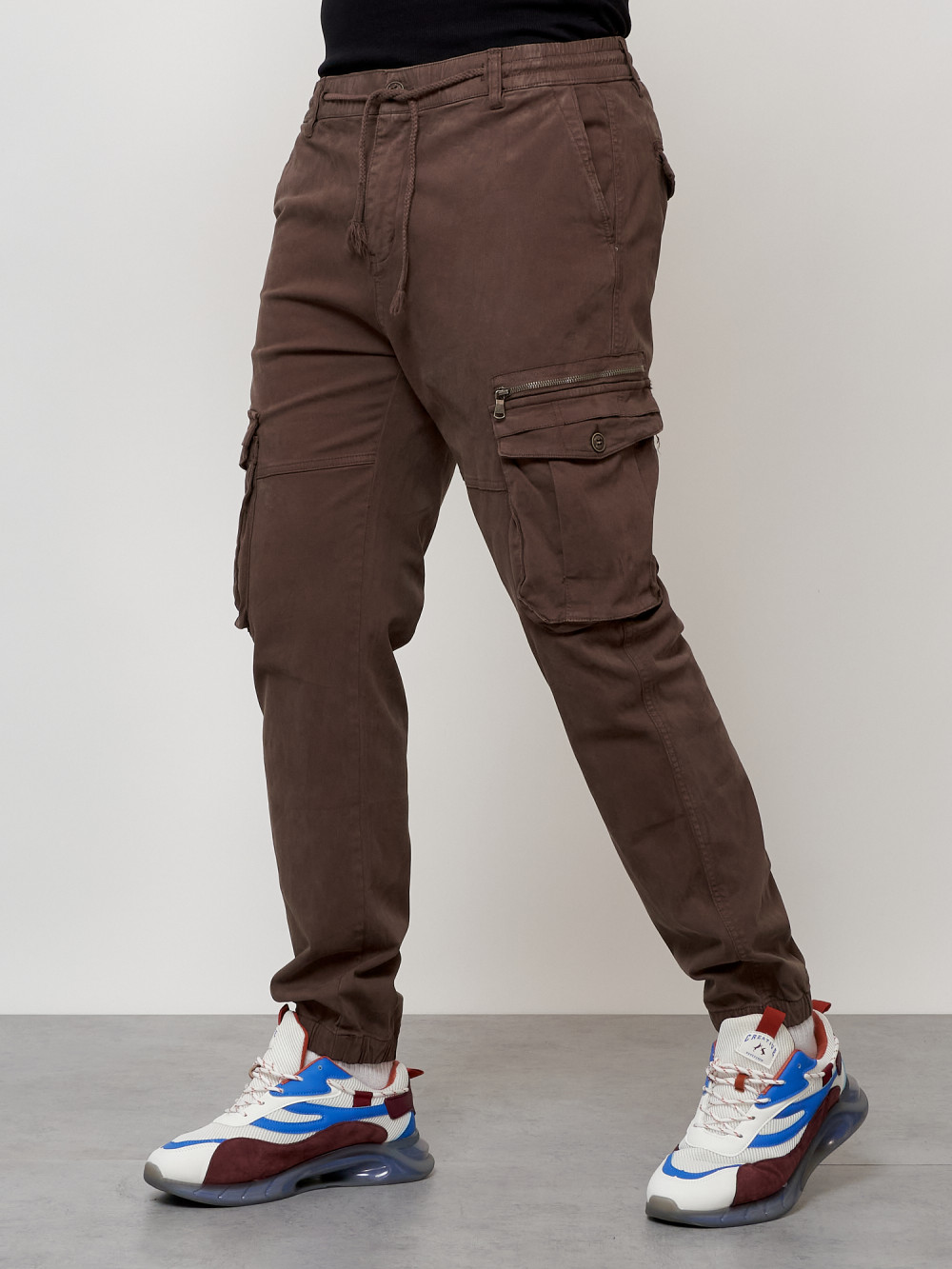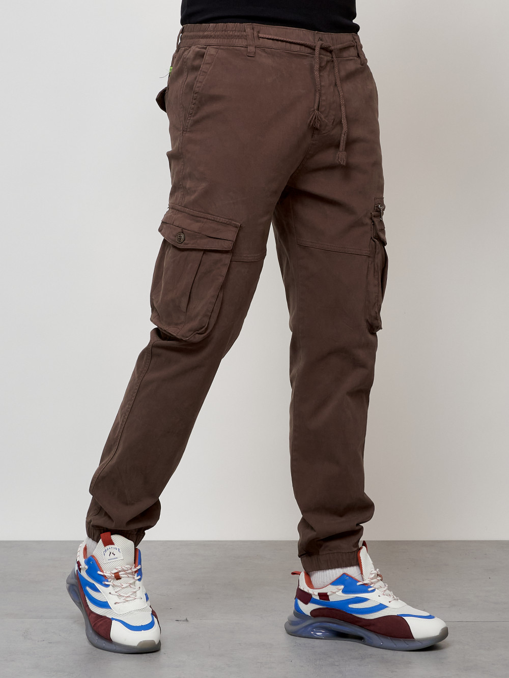 Джинсы карго мужские с накладными карманами коричневого цвета 2402K
