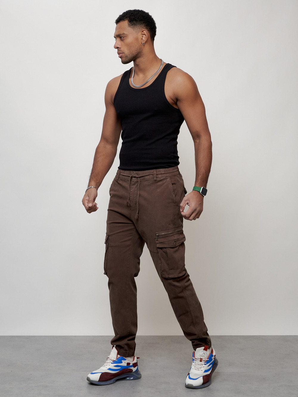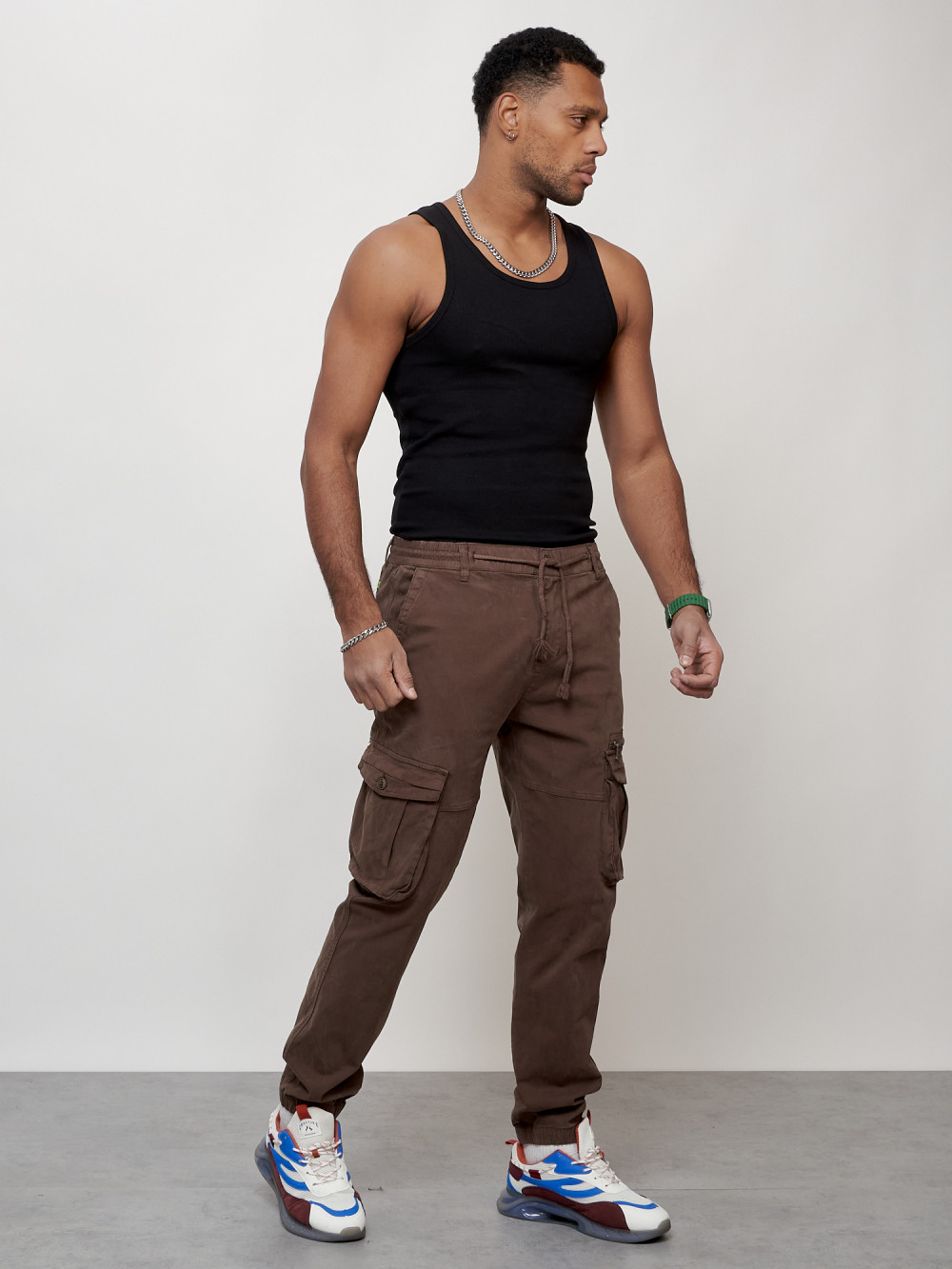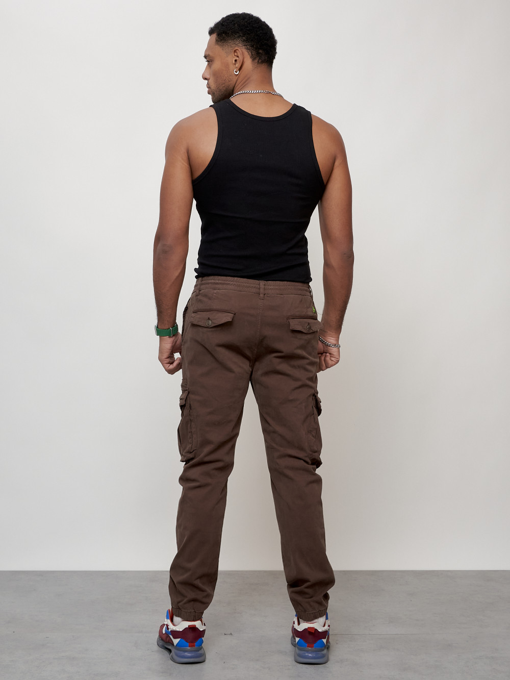 Джинсы карго мужские с накладными карманами коричневого цвета 2402K