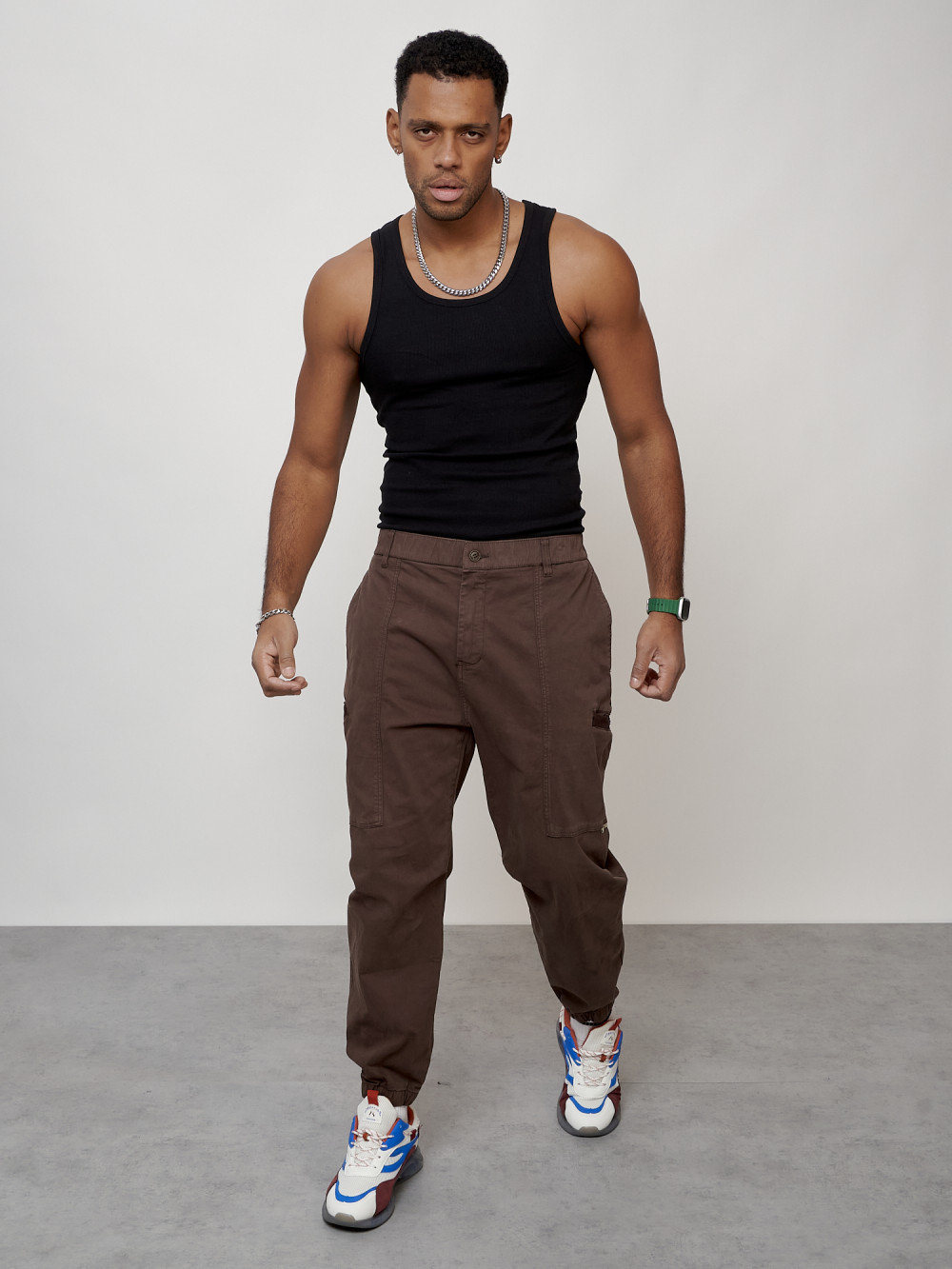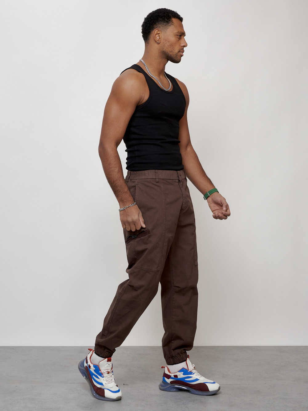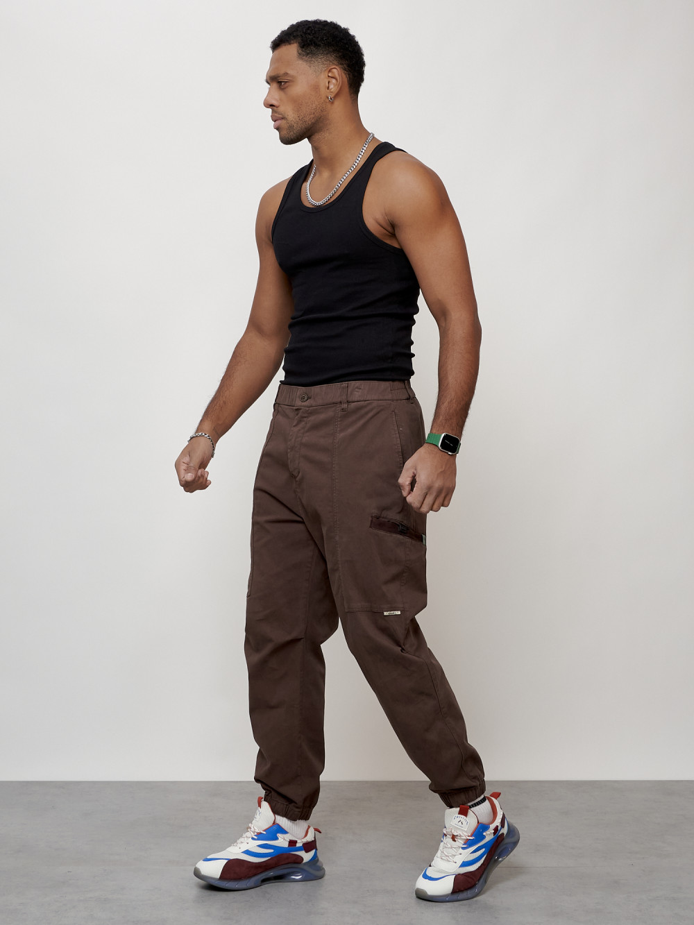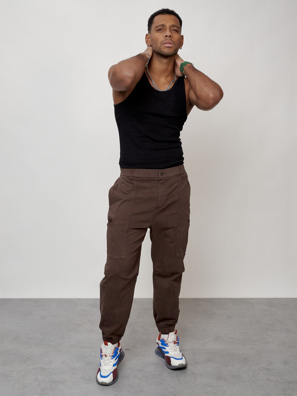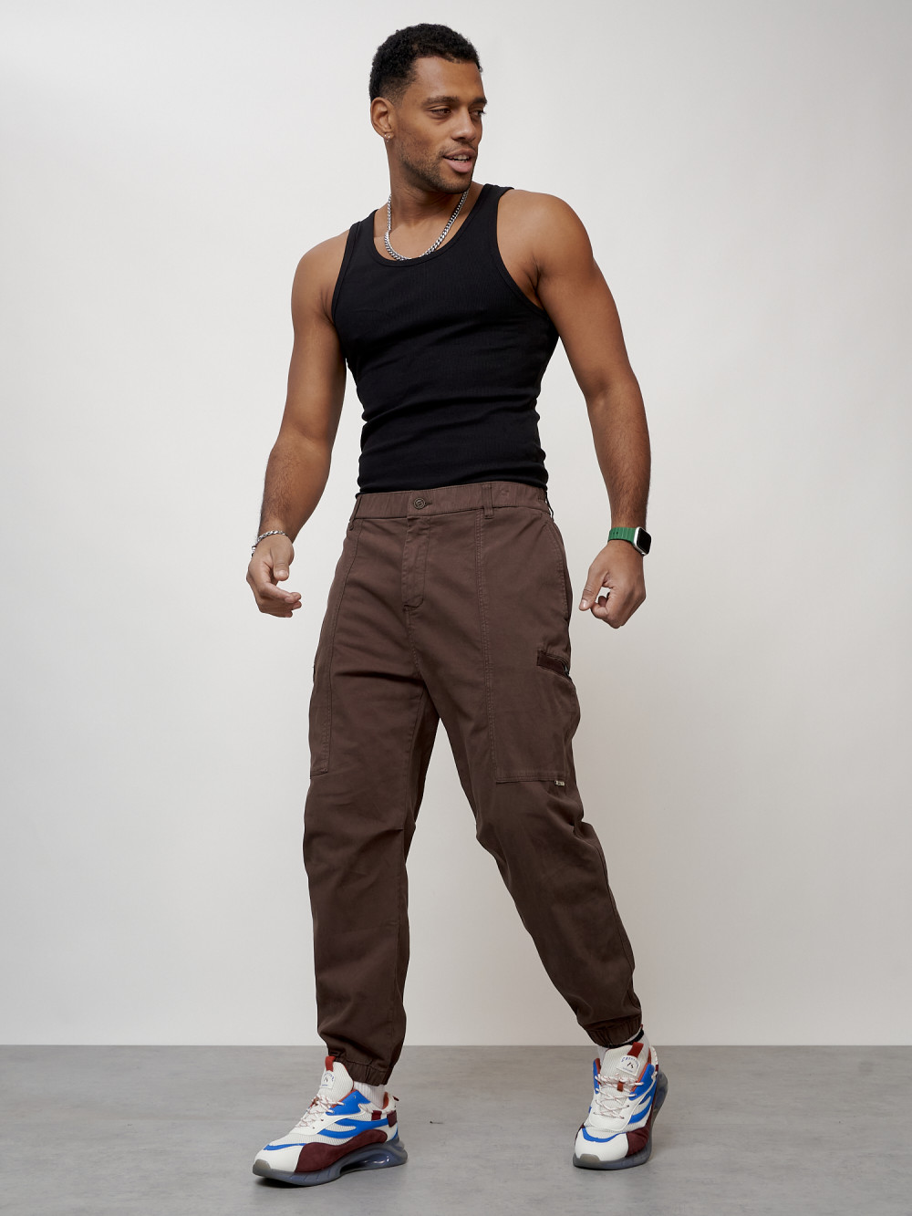 Джинсы карго мужские с накладными карманами коричневого цвета 2419K