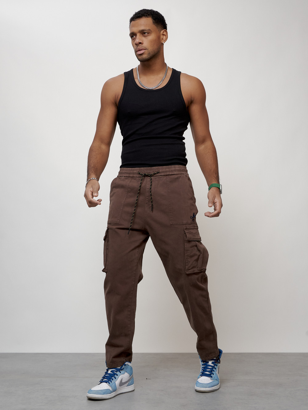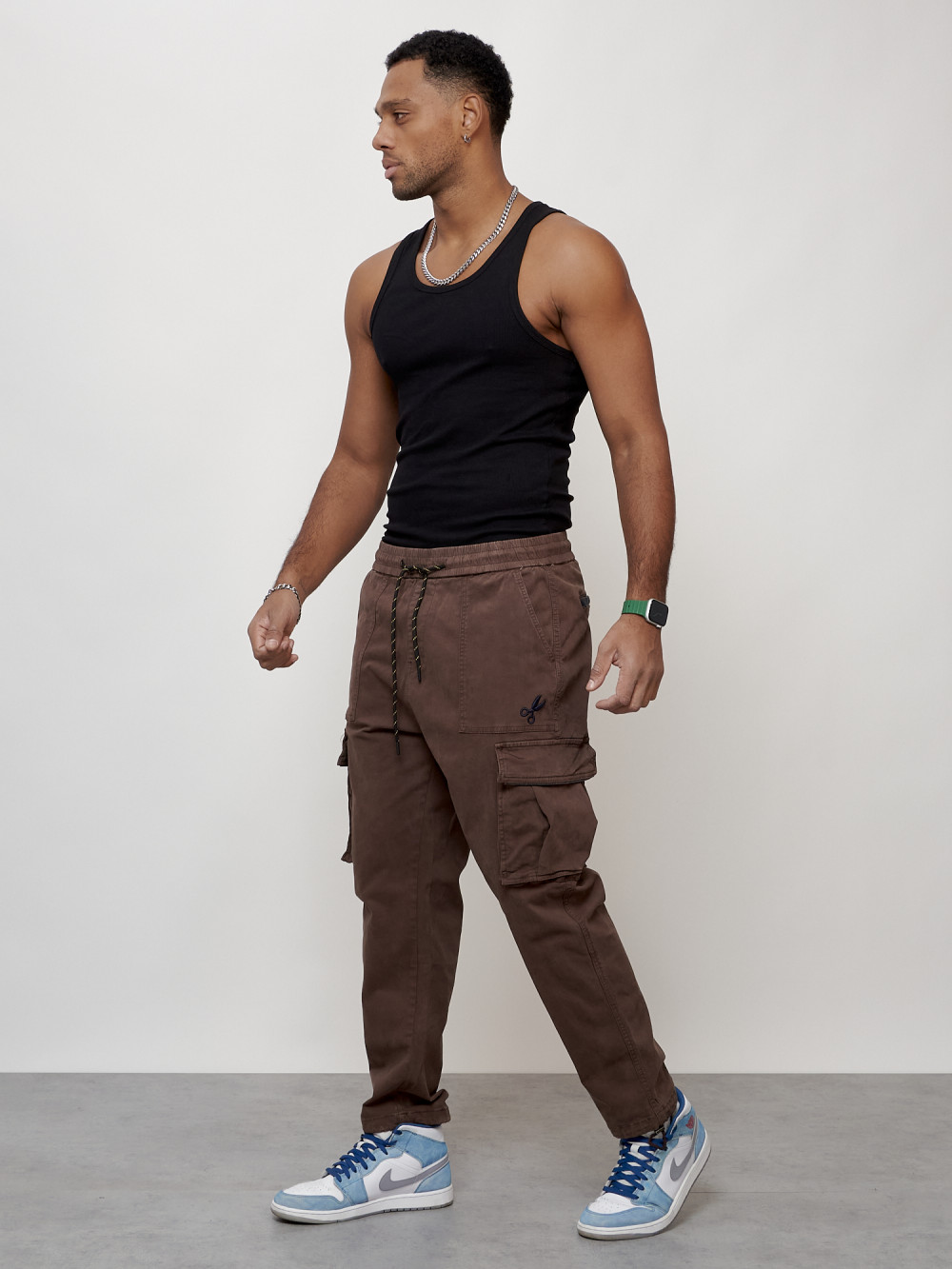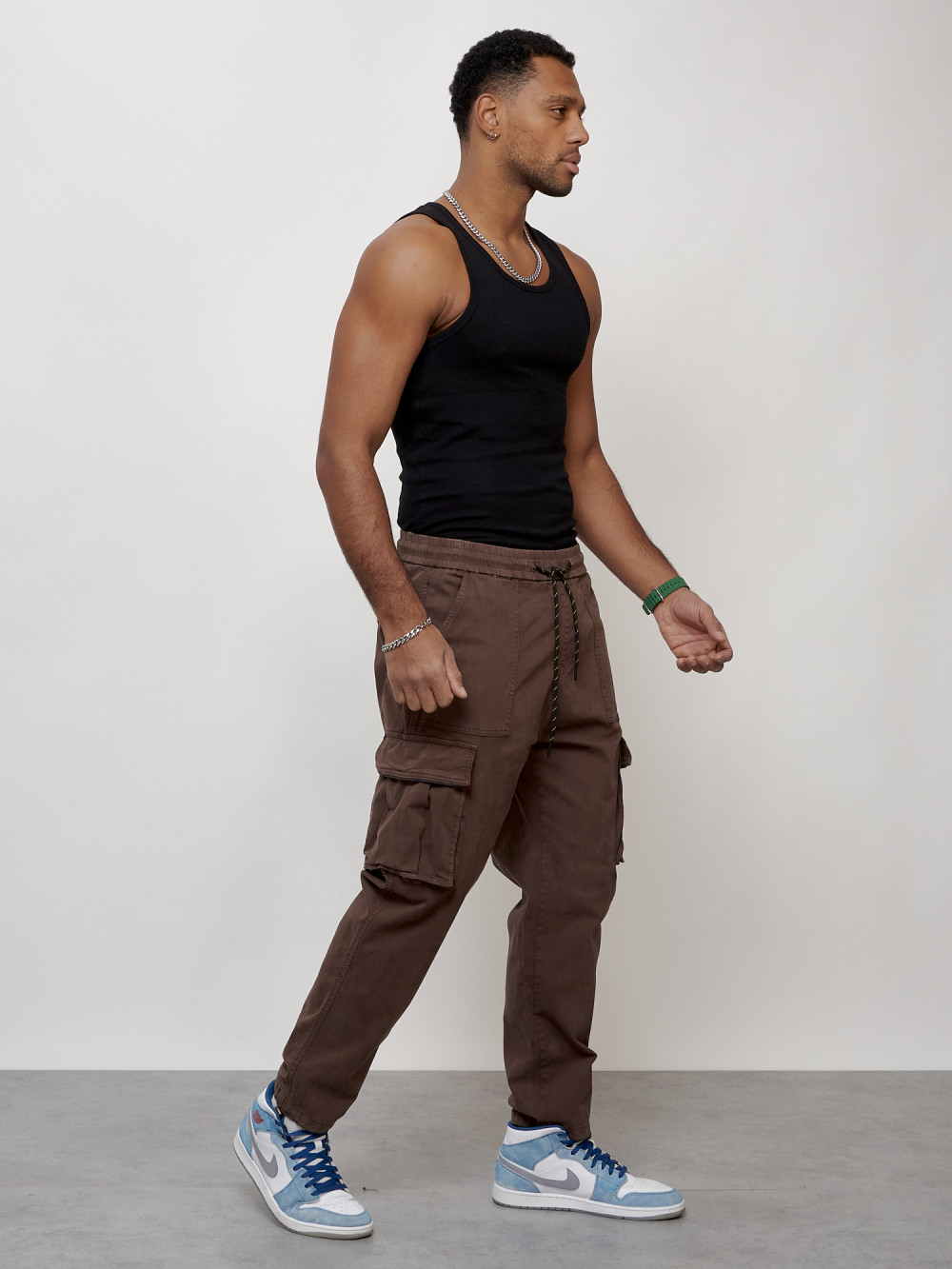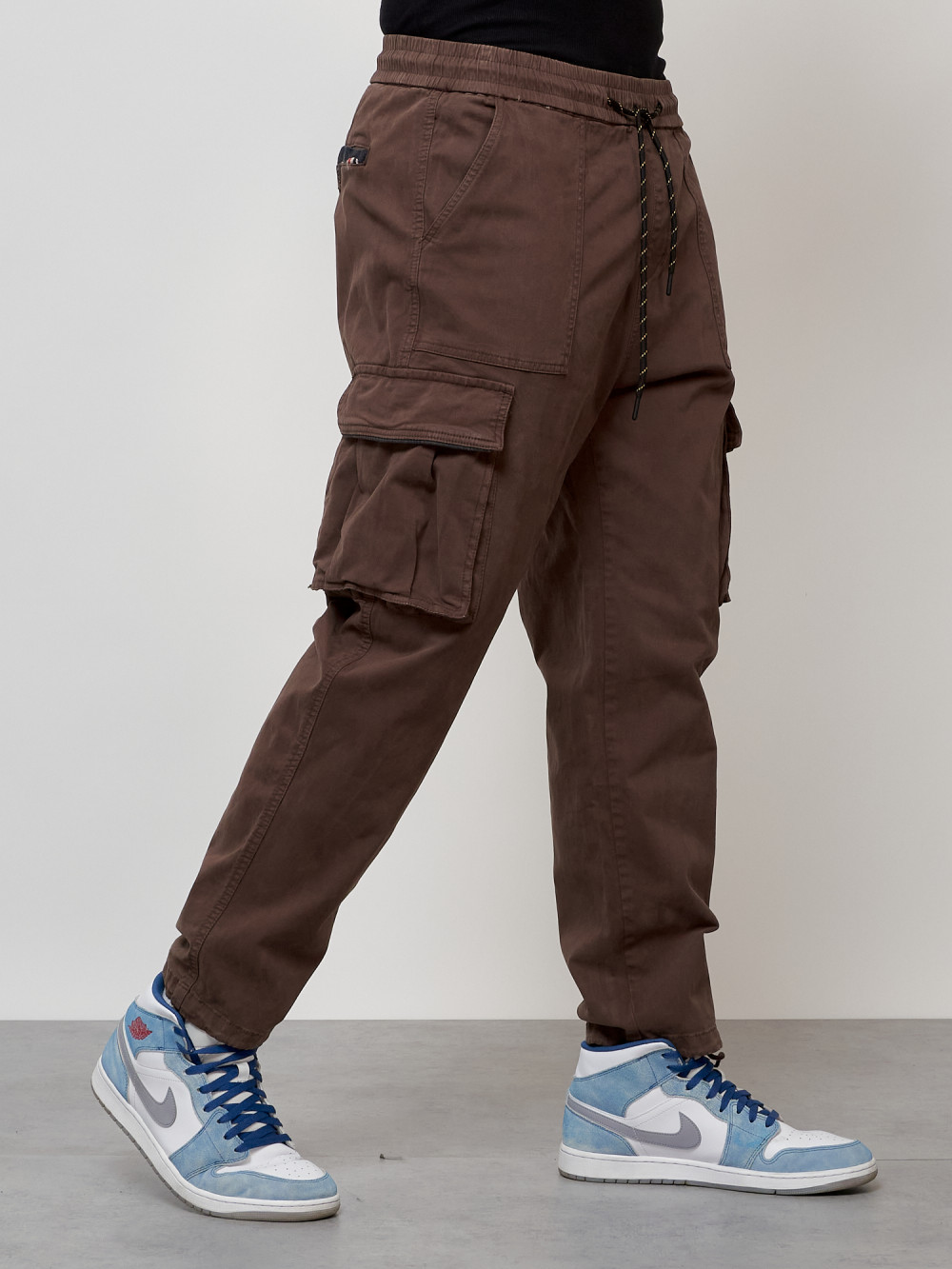 Джинсы карго мужские с накладными карманами коричневого цвета 2424K