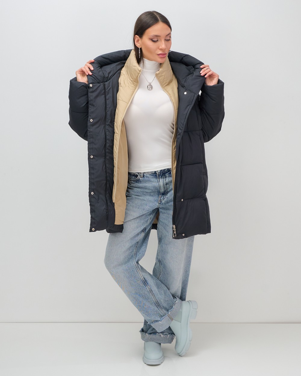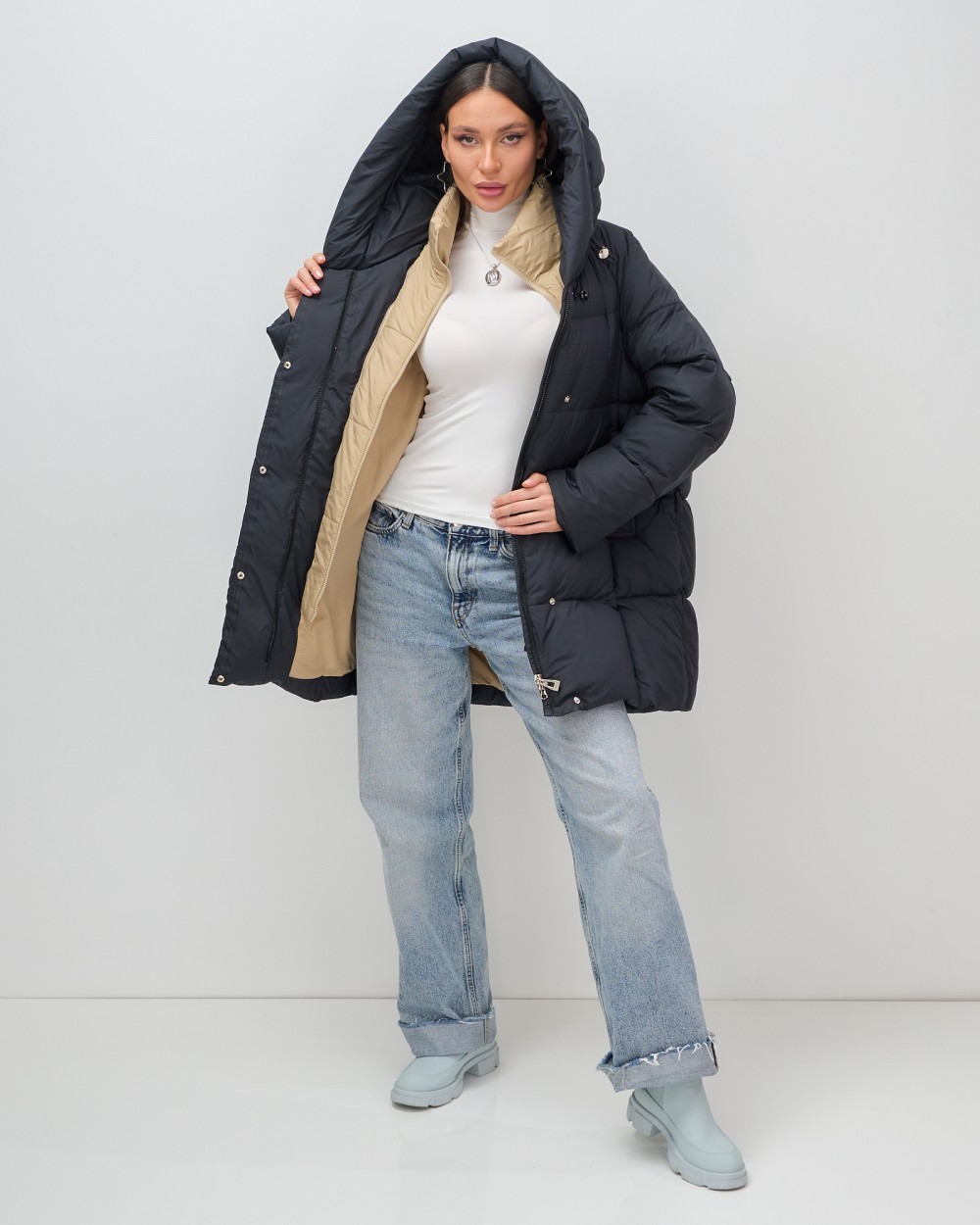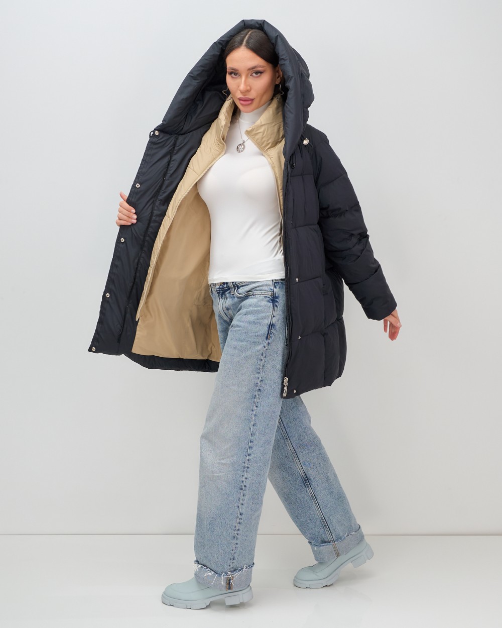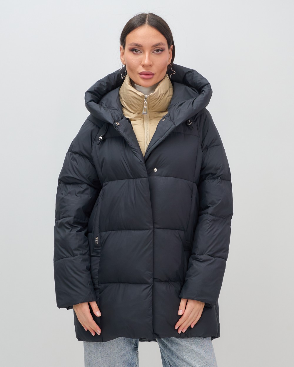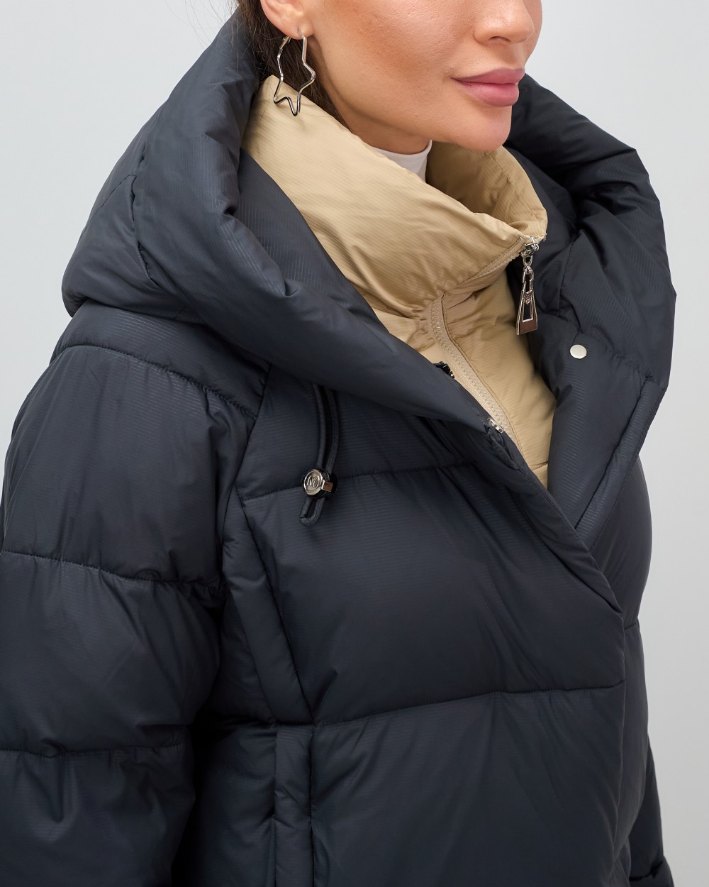 Куртка двубортная женская зимняя с капюшоном черного цвета 7736Ch — Visdeer