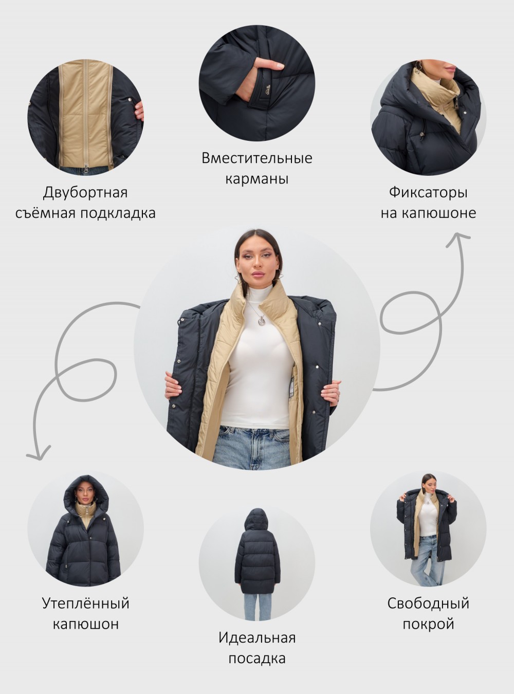 - Декоративные элементы: Воротник, Капюшон, Карманы, Декоративные пуговицы