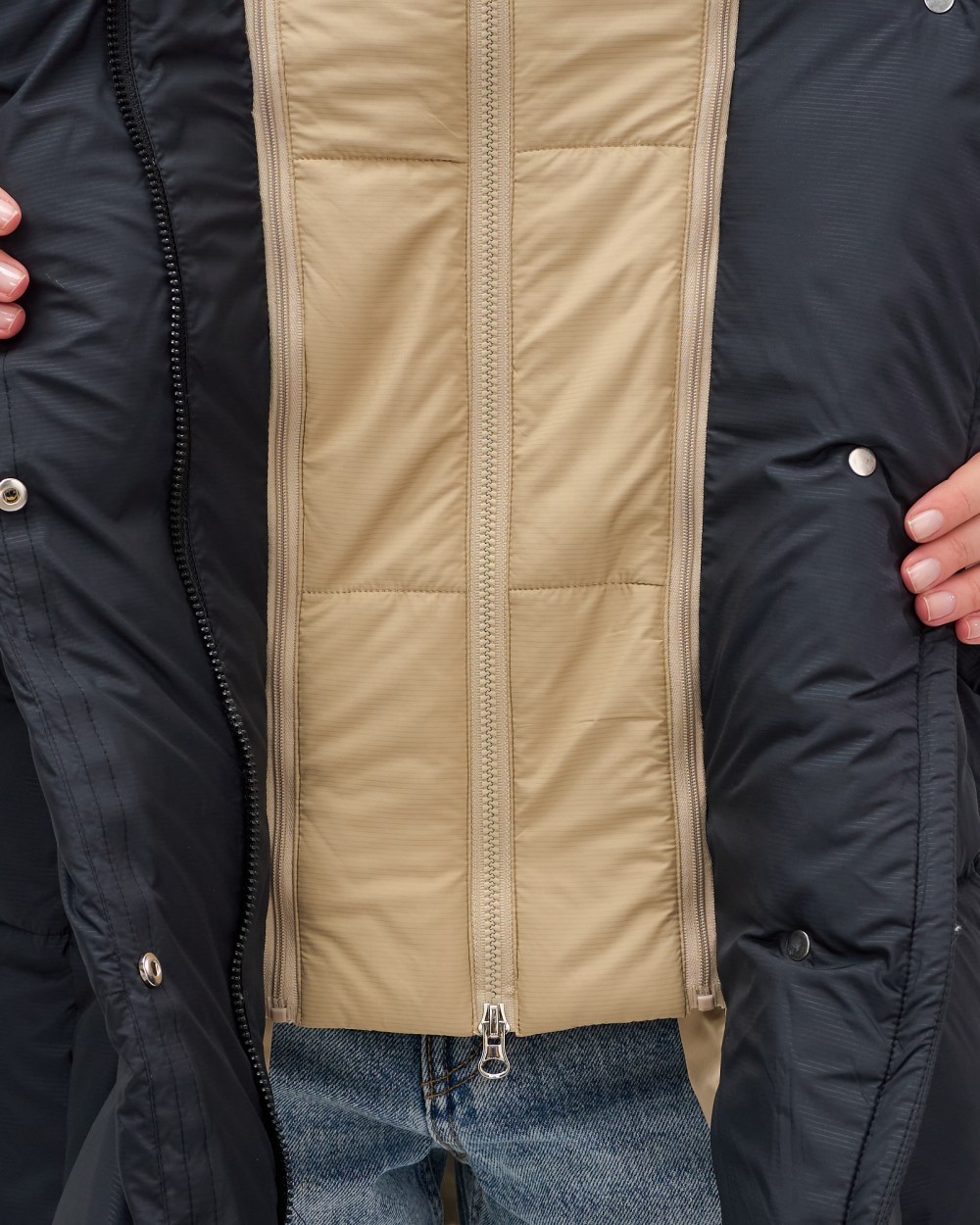 Куртка имеет укороченный подол, внутренние карманы и фиксатор на капюшоне, что добавляет удобства в повседневной носке. Прямой и свободный покрой позволяет сочетать её как с офисным, так и повседневным стилем. Длинные рукава на манжете и съемный воротник придают модели дополнительную функциональность.