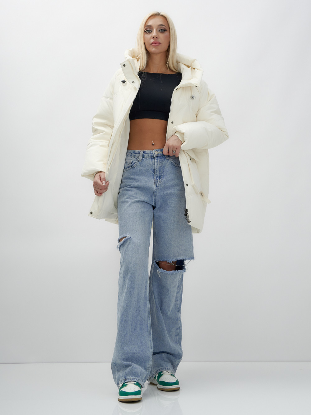 Куртка летучая мышь женская с капюшоном зимняя бежевого цвета 9617B