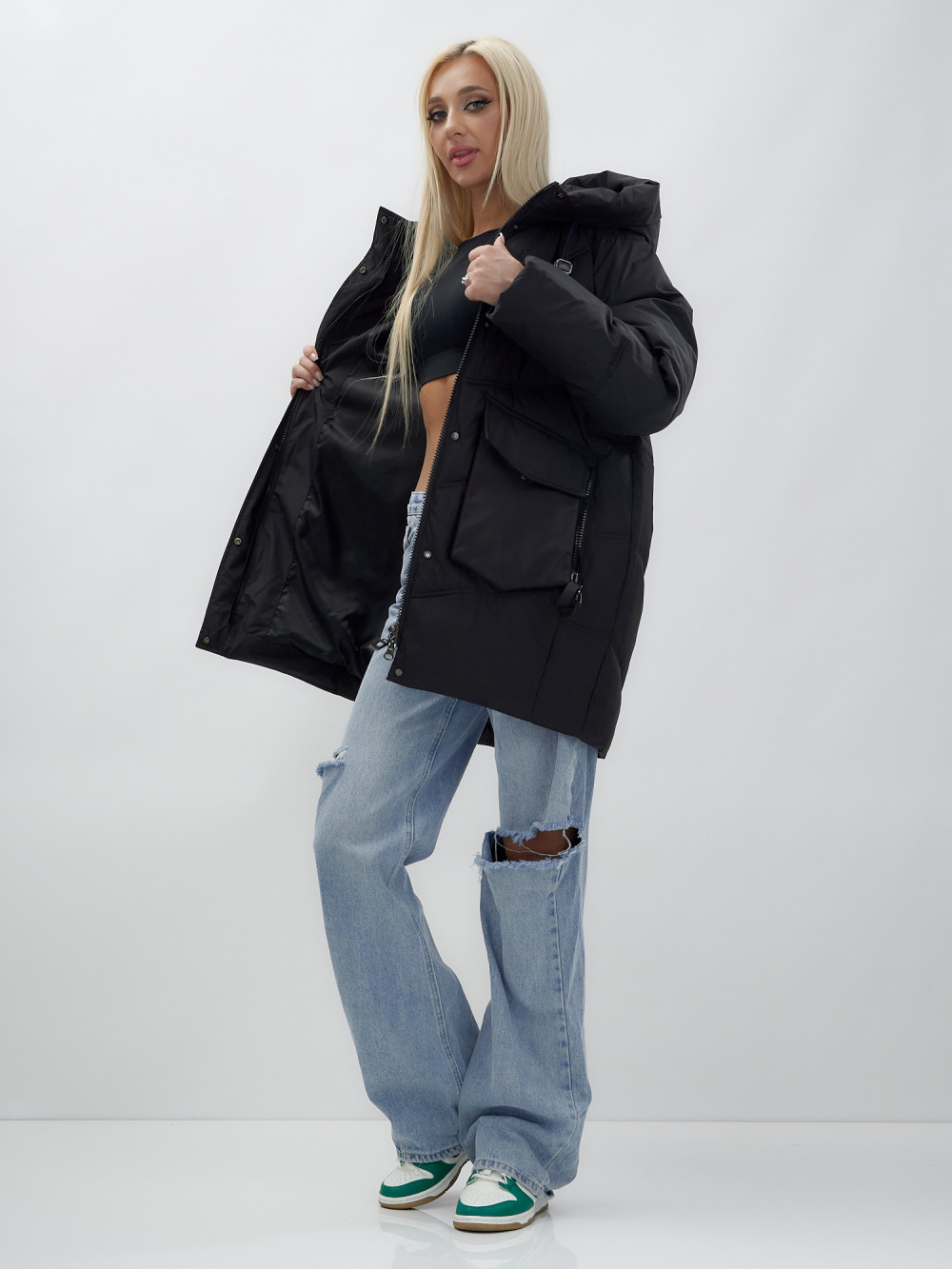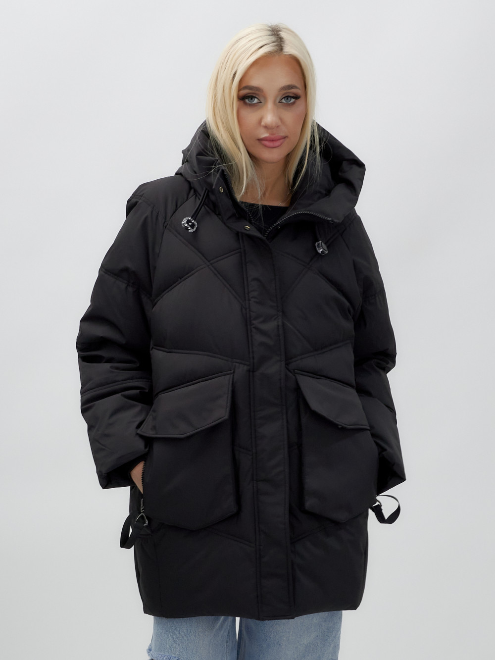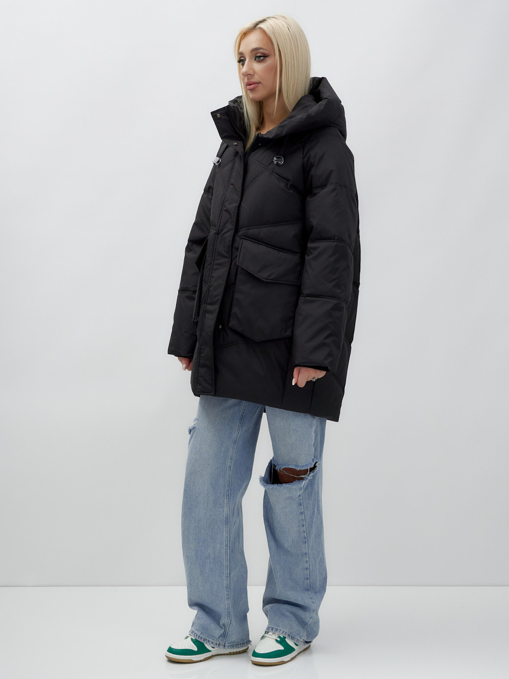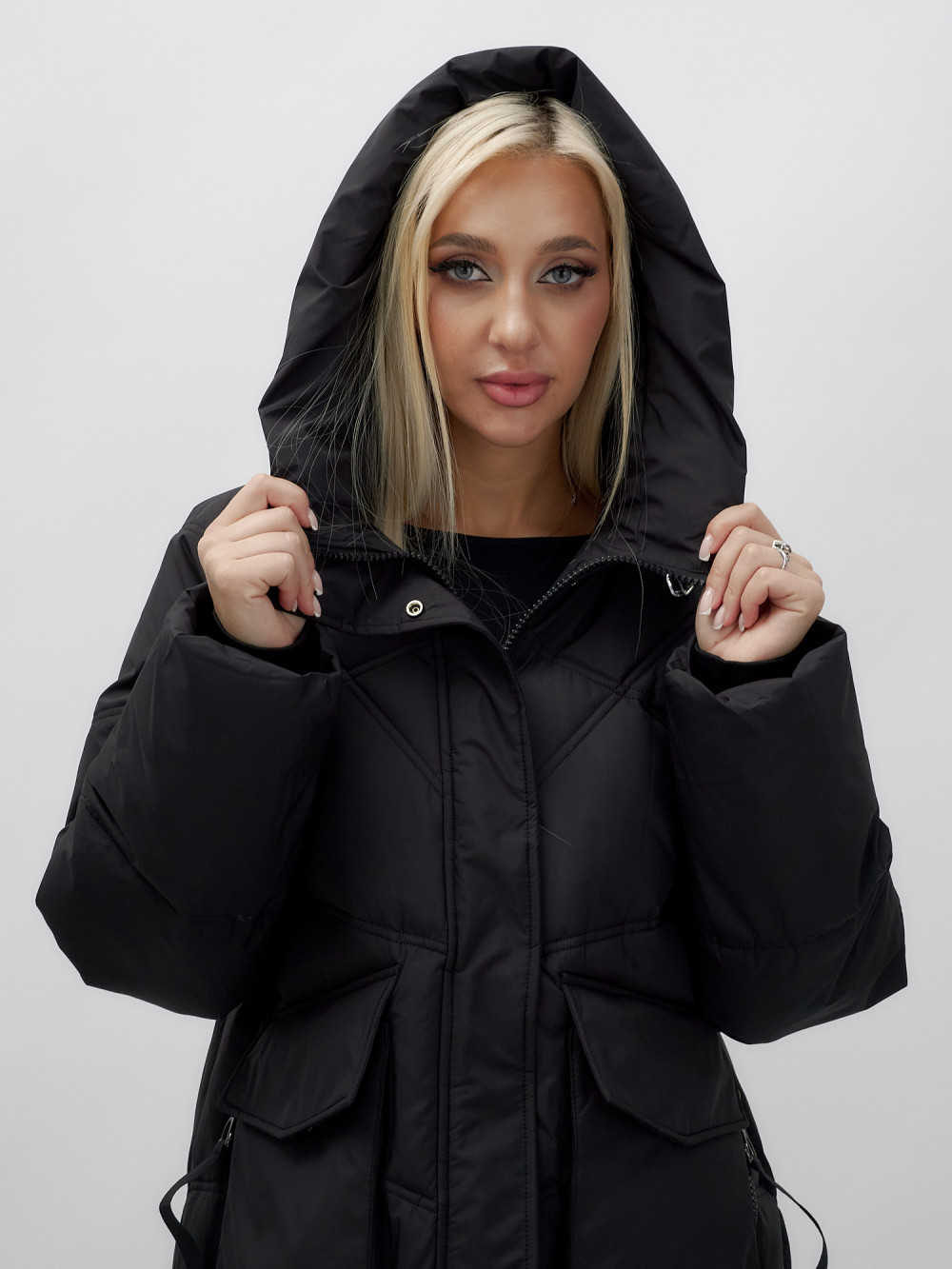 Куртка летучая мышь женская с капюшоном зимняя черного цвета 9617Ch