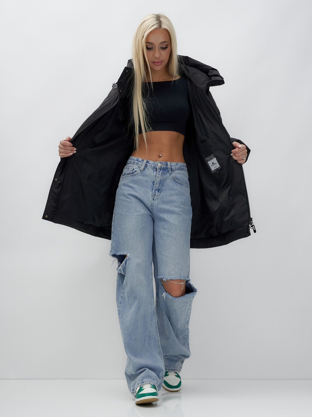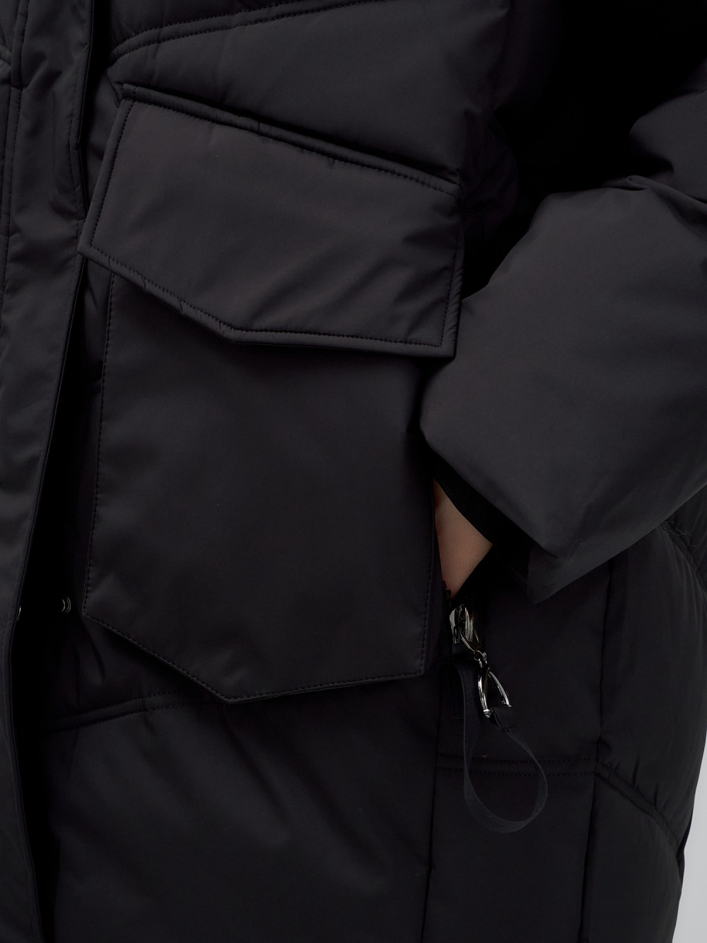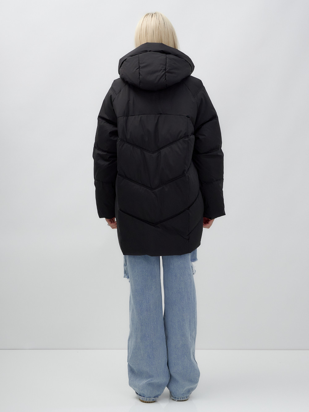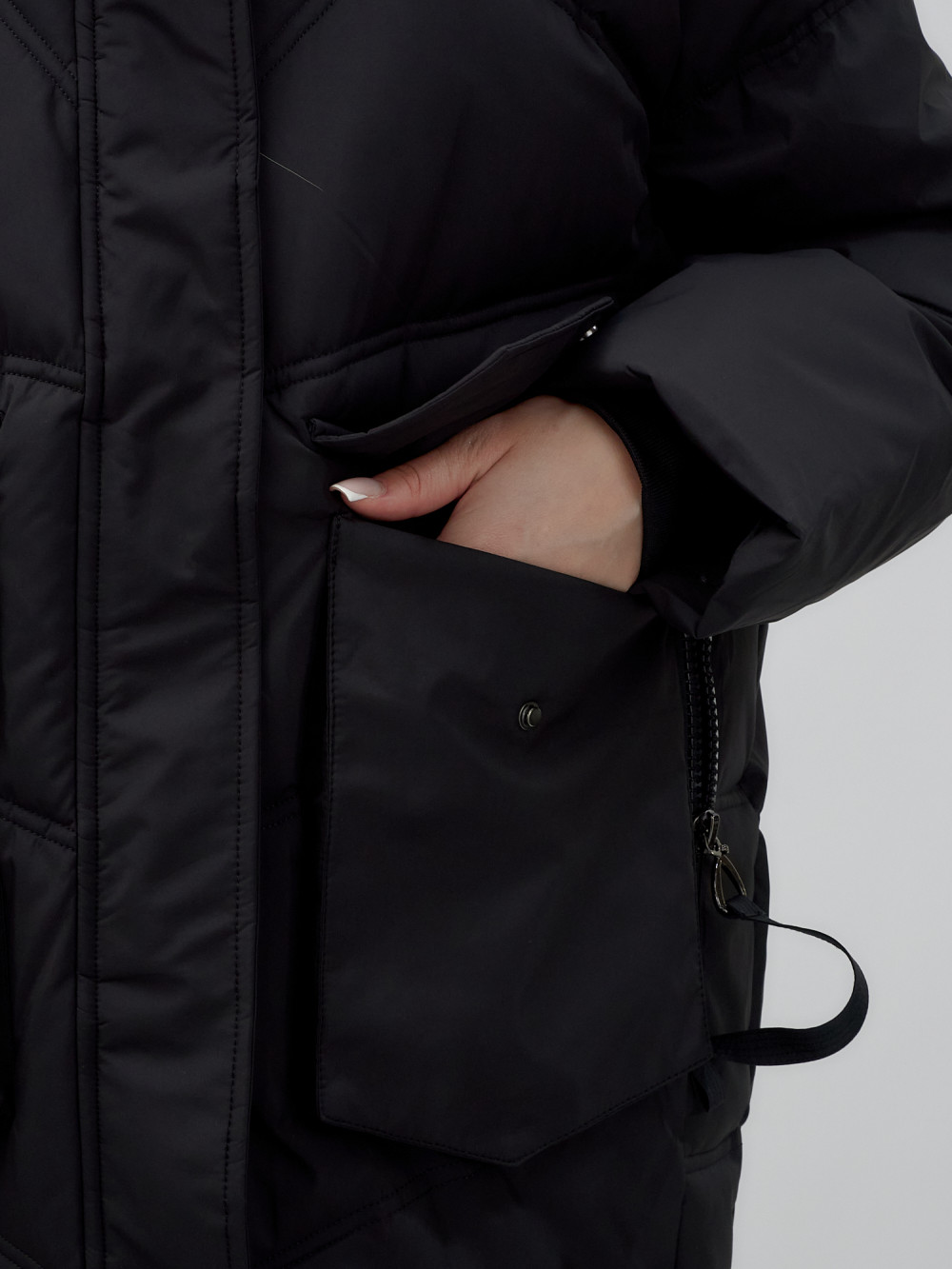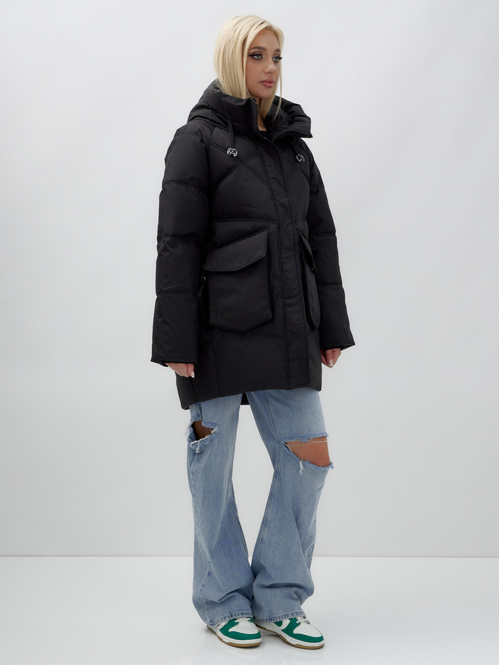 Куртка летучая мышь женская с капюшоном зимняя черного цвета 9617Ch