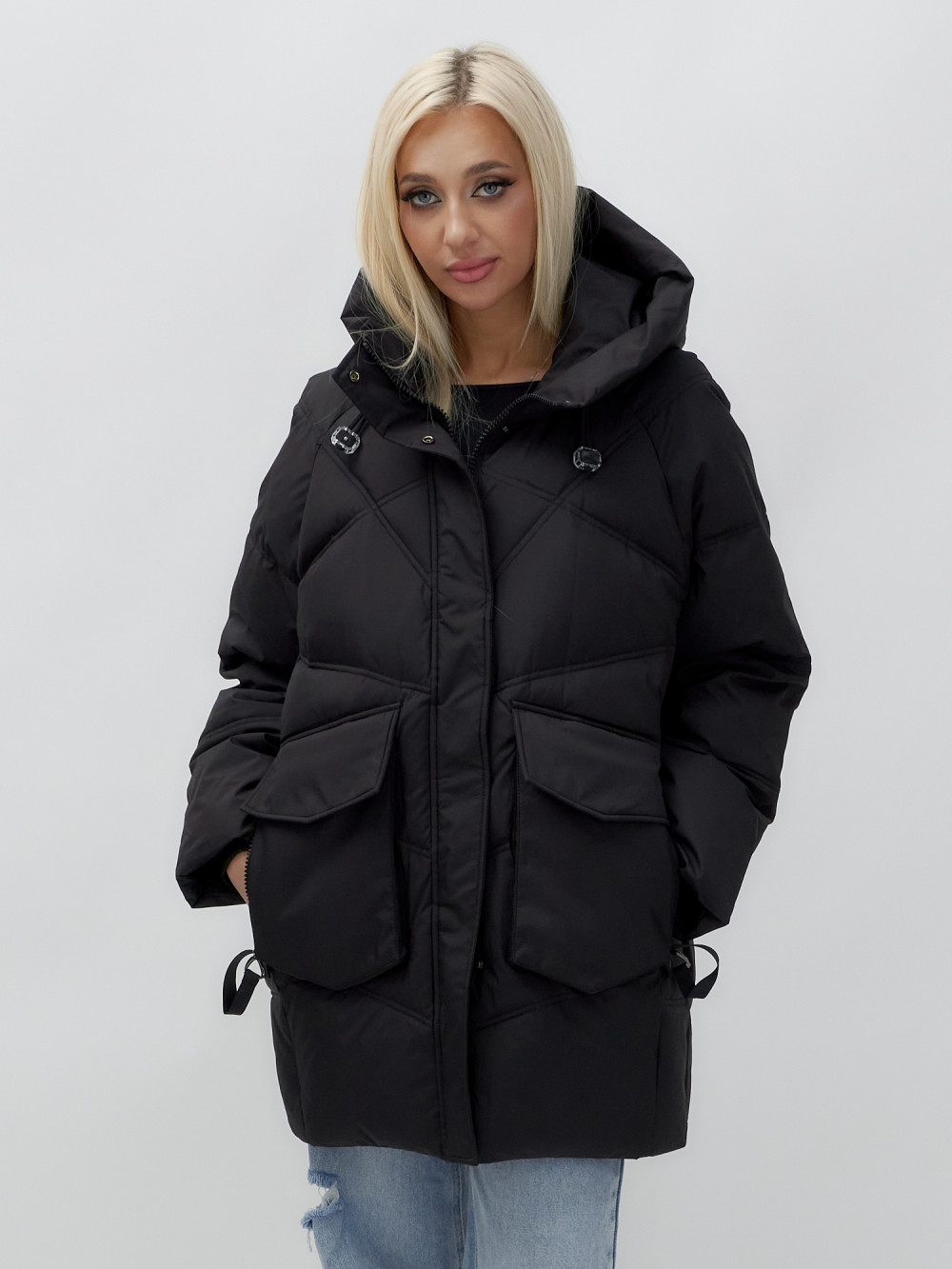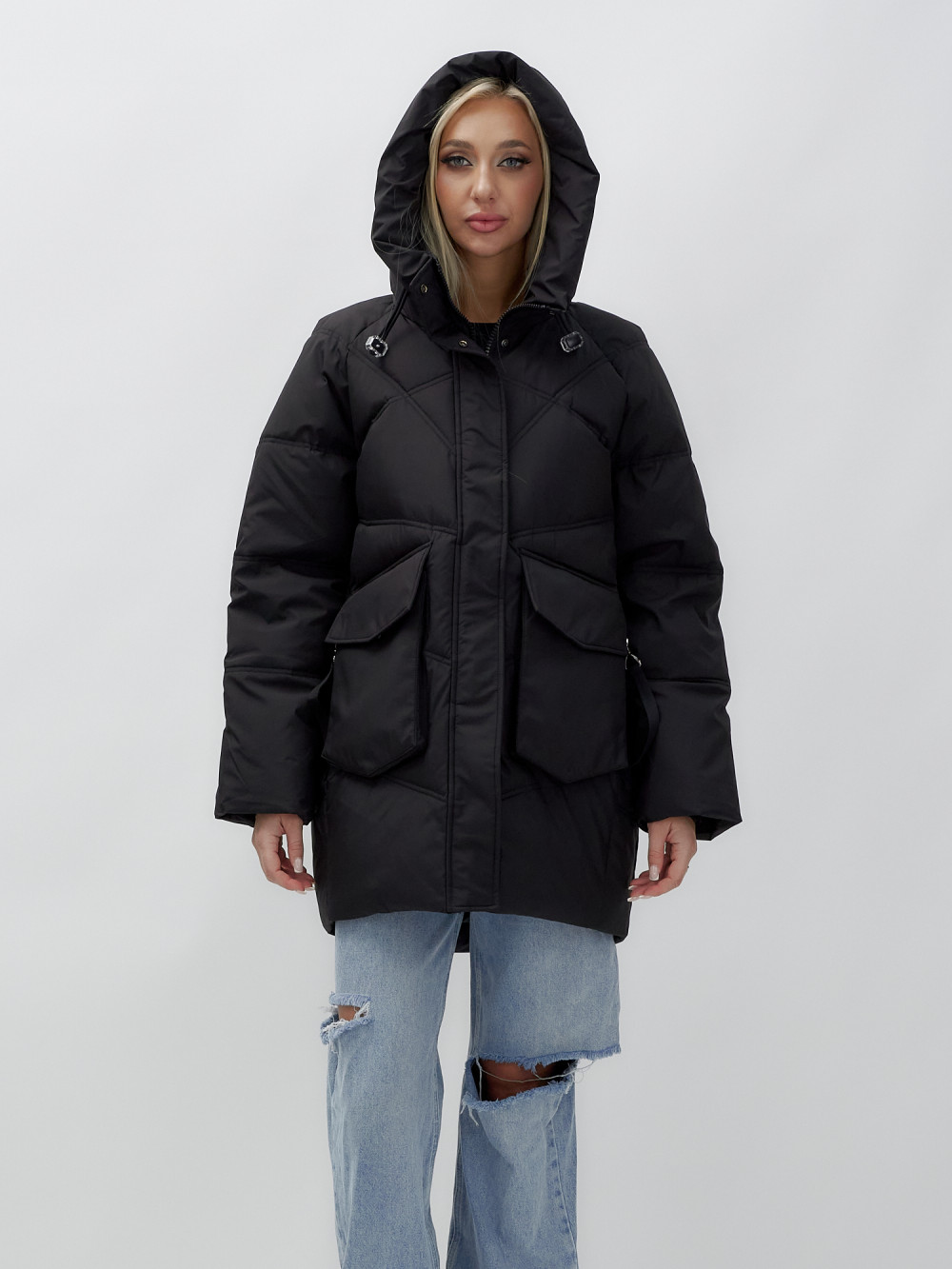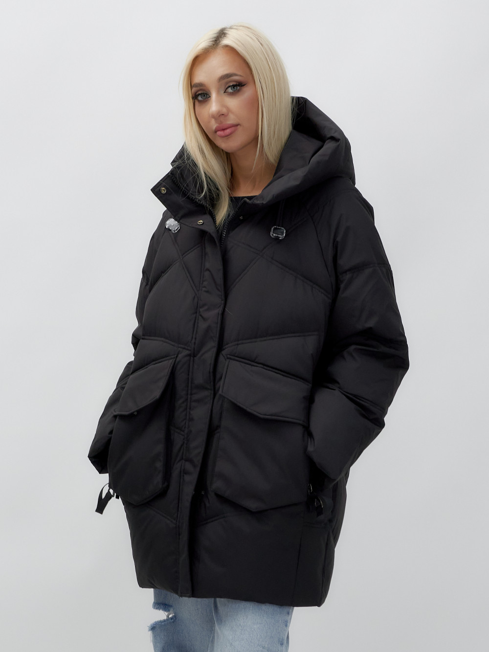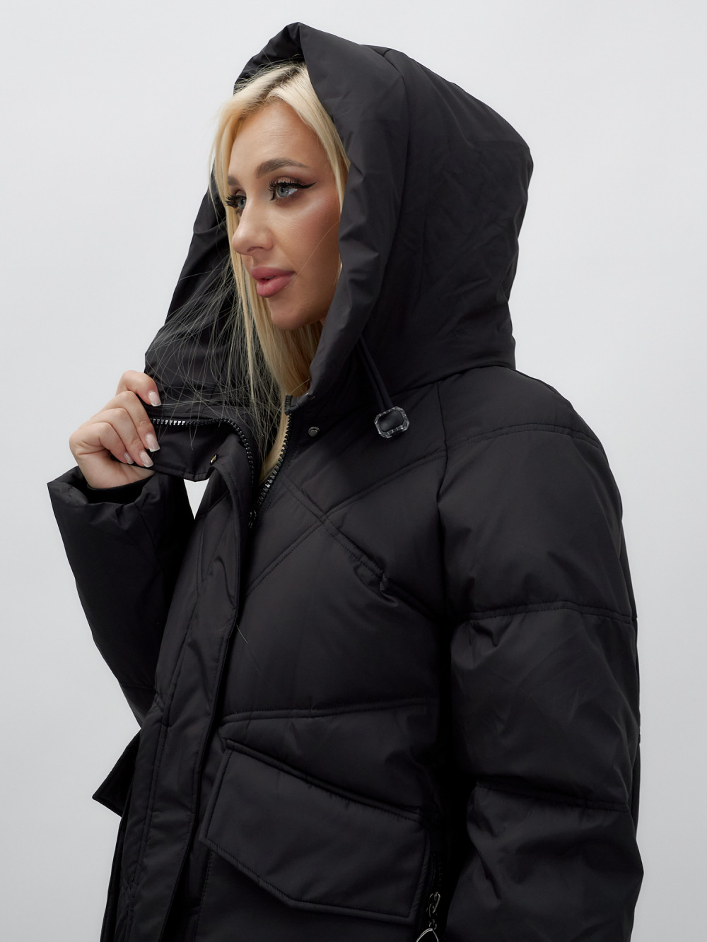 Куртка летучая мышь женская с капюшоном зимняя черного цвета 9617Ch — MTFORCE