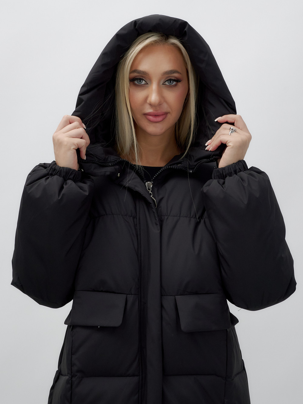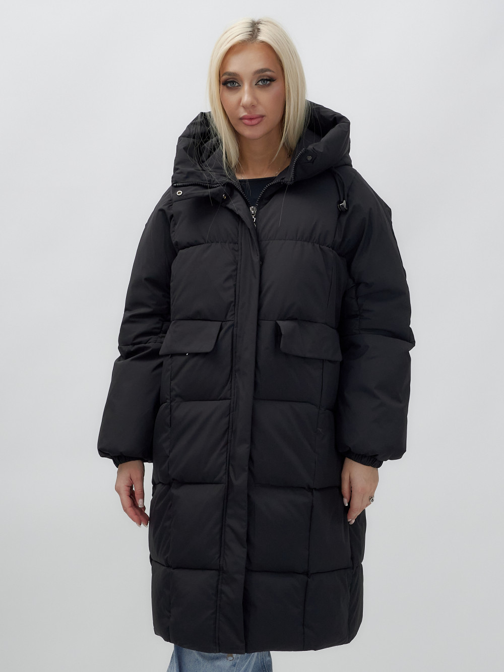 Куртка летучая мышь женская с капюшоном зимняя черного цвета 9621Ch — MTFORCE