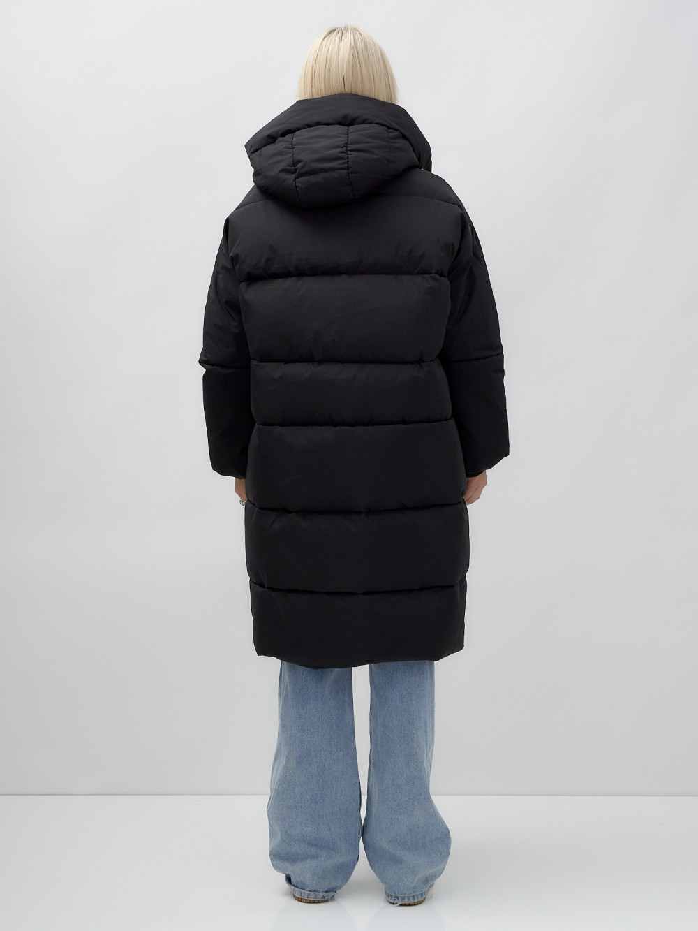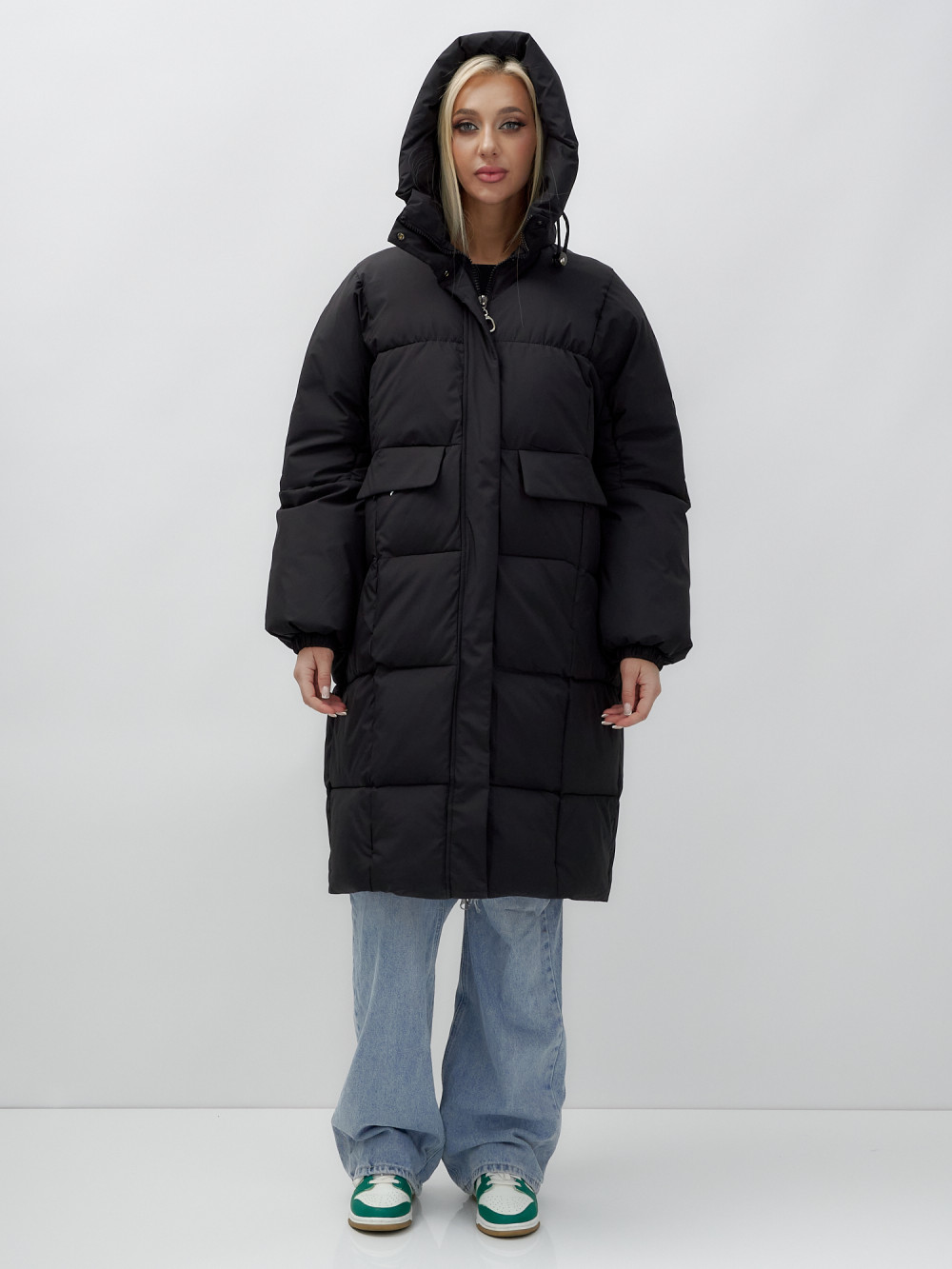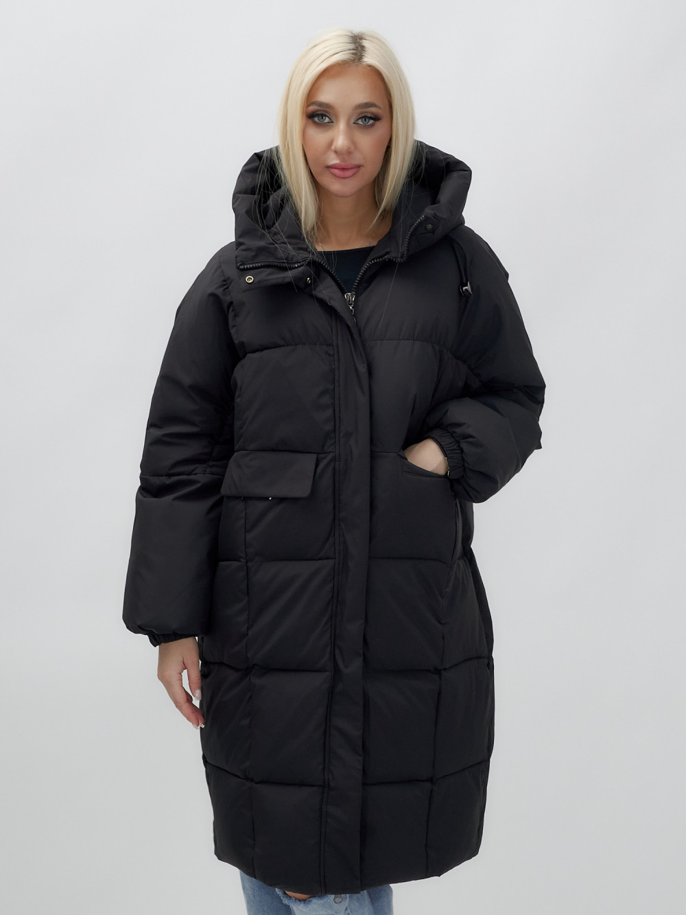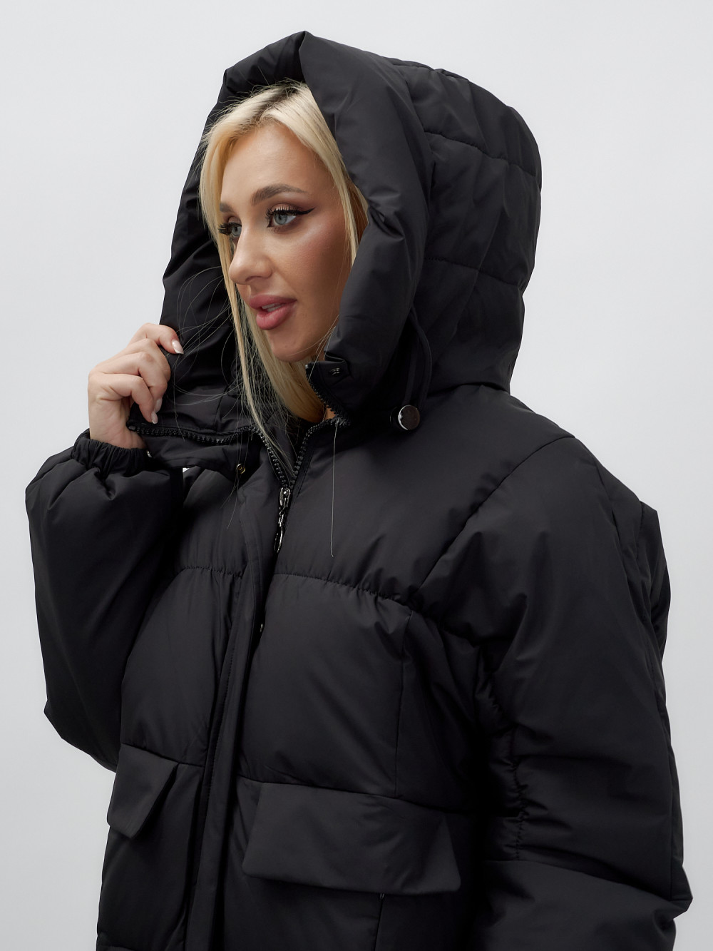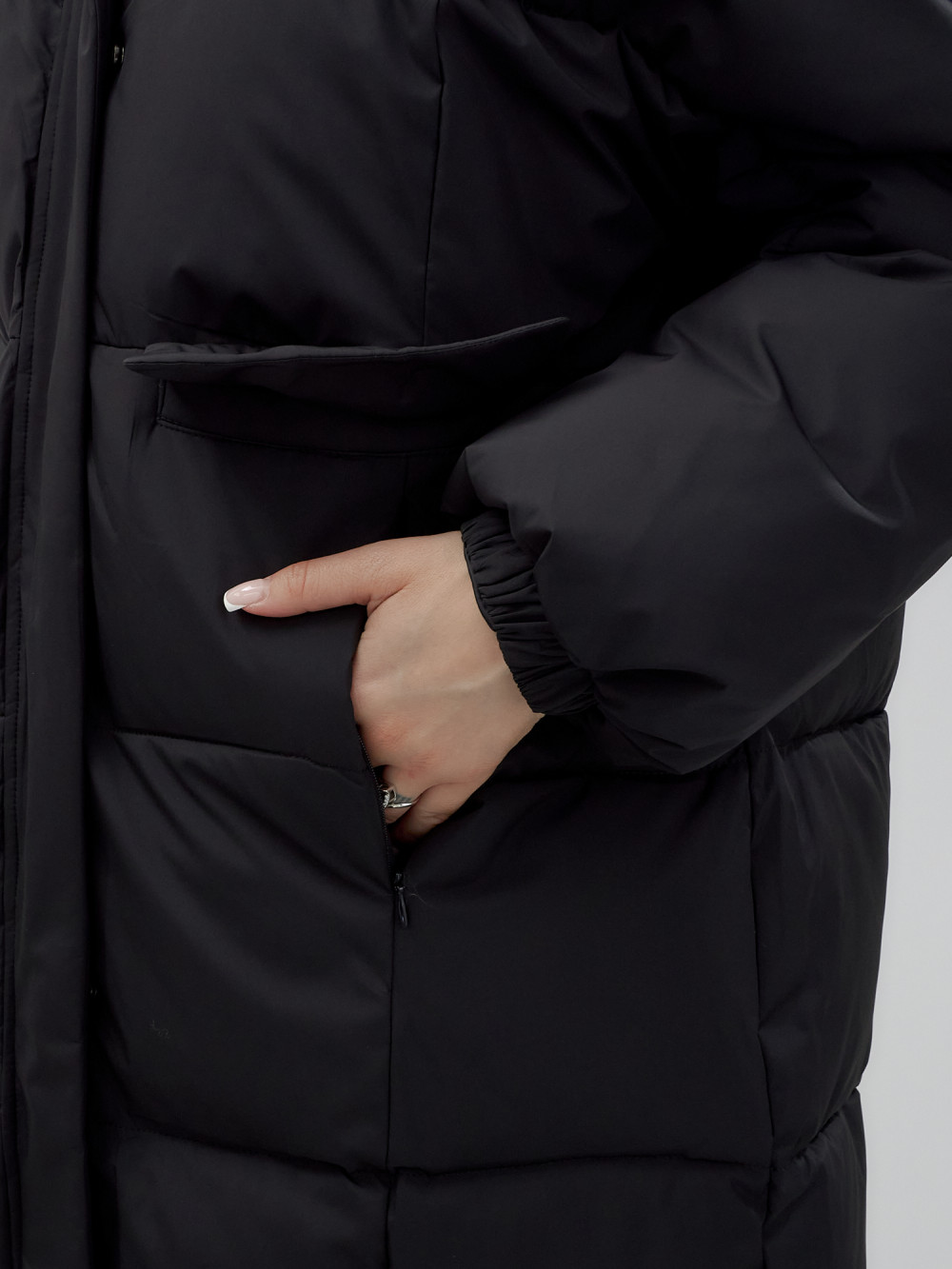 Куртка летучая мышь женская с капюшоном зимняя черного цвета 9621Ch
