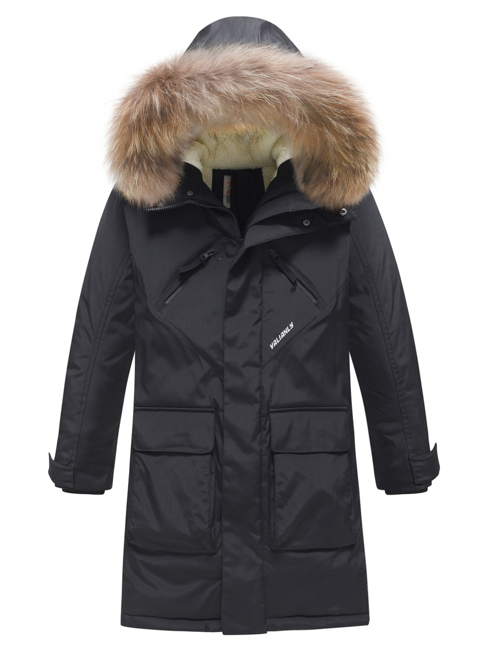 Куртка парка зимняя подростковая для мальчика с капюшоном и мехом черного цвета 9447Ch — VALIANLY