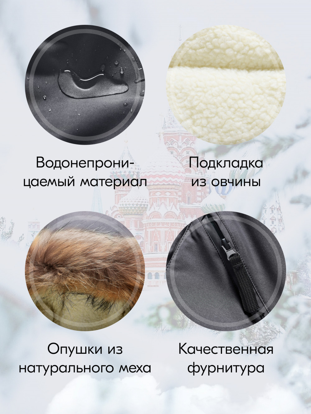 — Съемная меховая опушка: Из натурального меха, добавляет стильный акцент и дополнительное тепло.