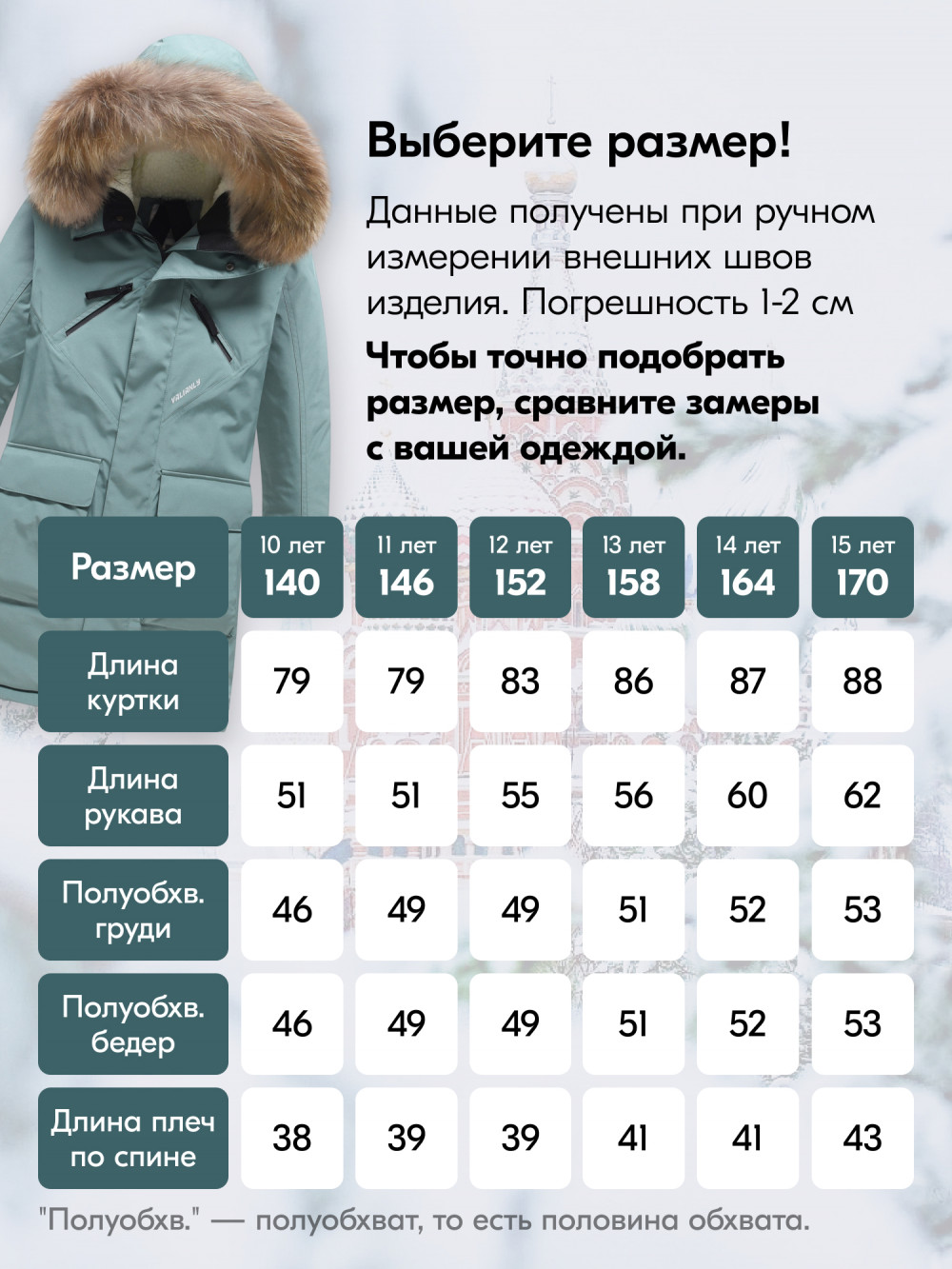| Размер | 140 (10 лет), 146 (11 лет), 152 (12 лет), 158 (13 лет), 164 (14 лет), 170 (15 лет) |