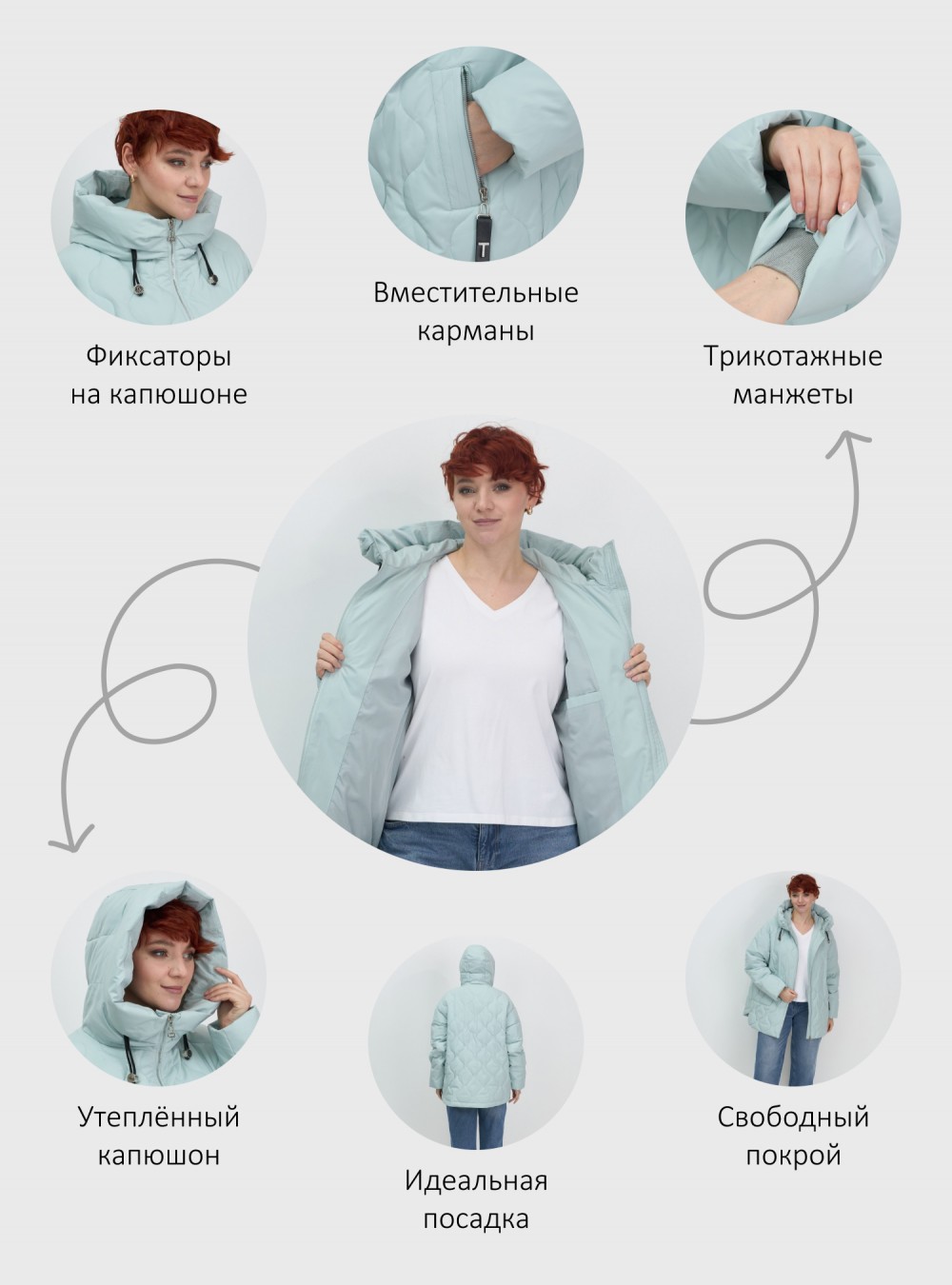 - Декоративные элементы: Капюшон, Карманы, Манжеты, Молния