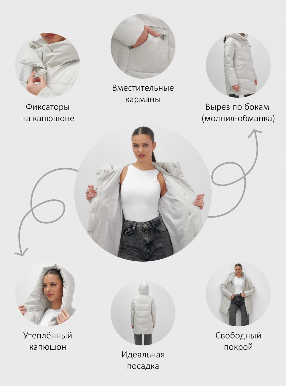 - Декоративные элементы: Капюшон, Карманы, Манжеты, Молния