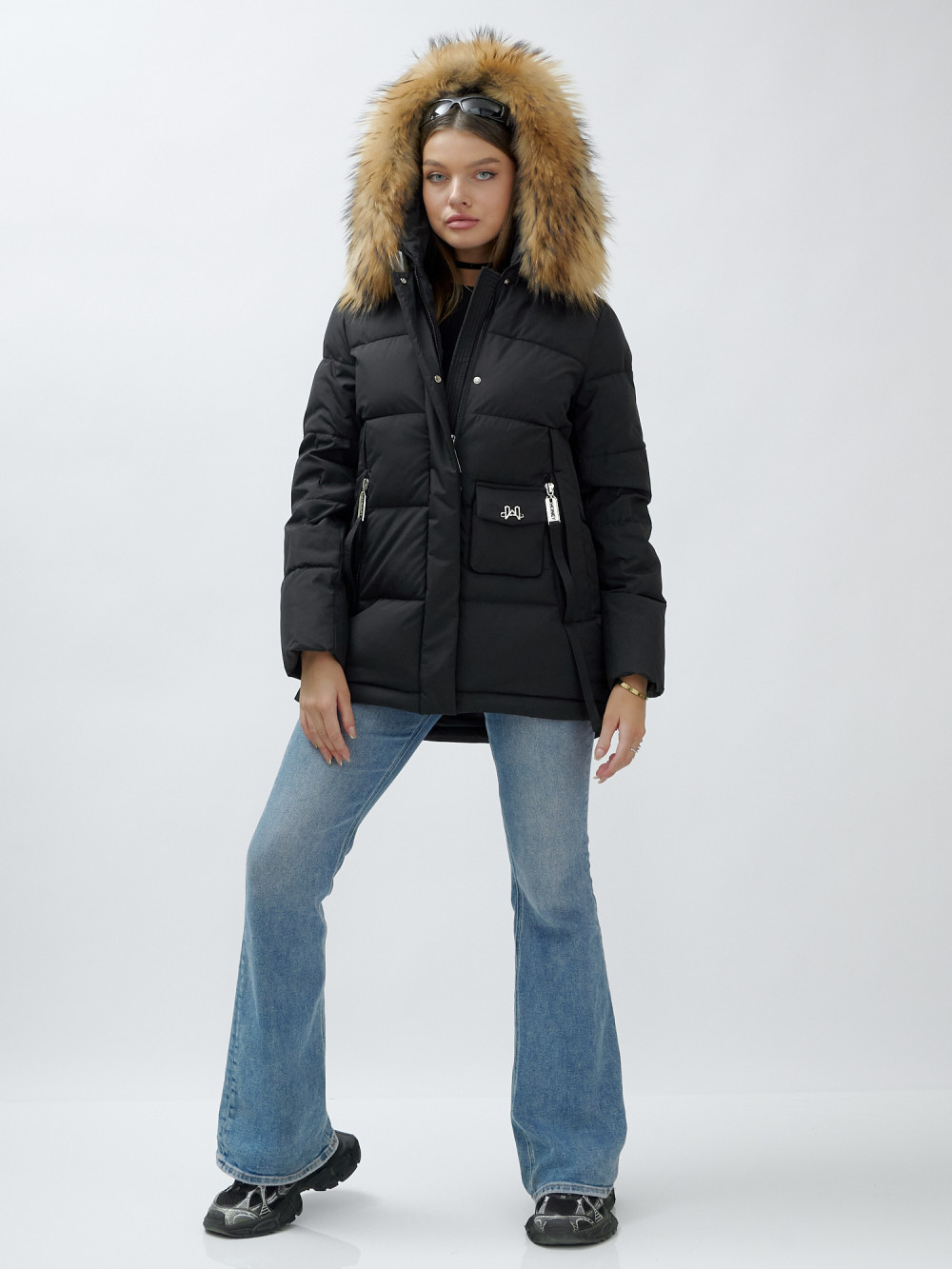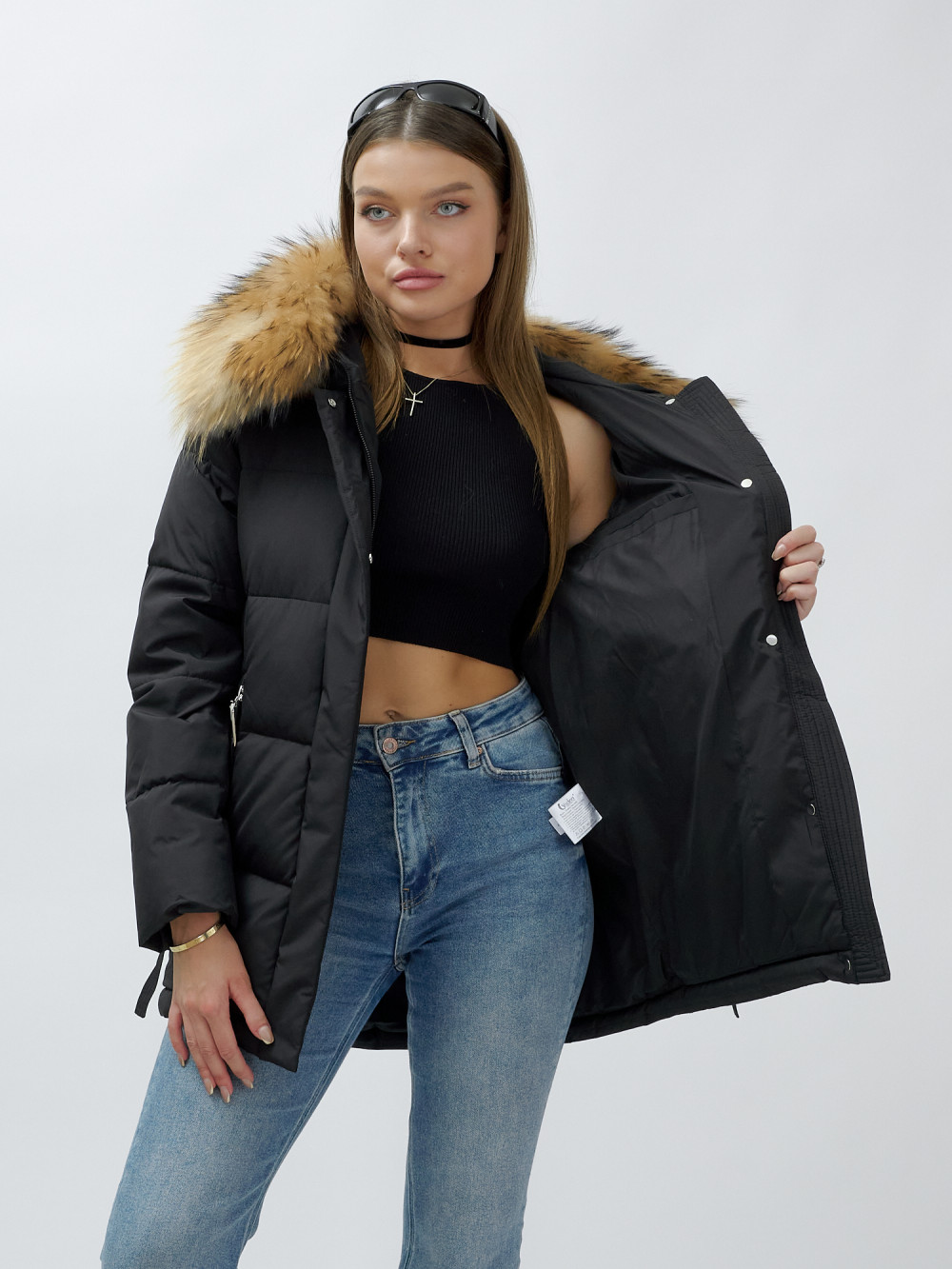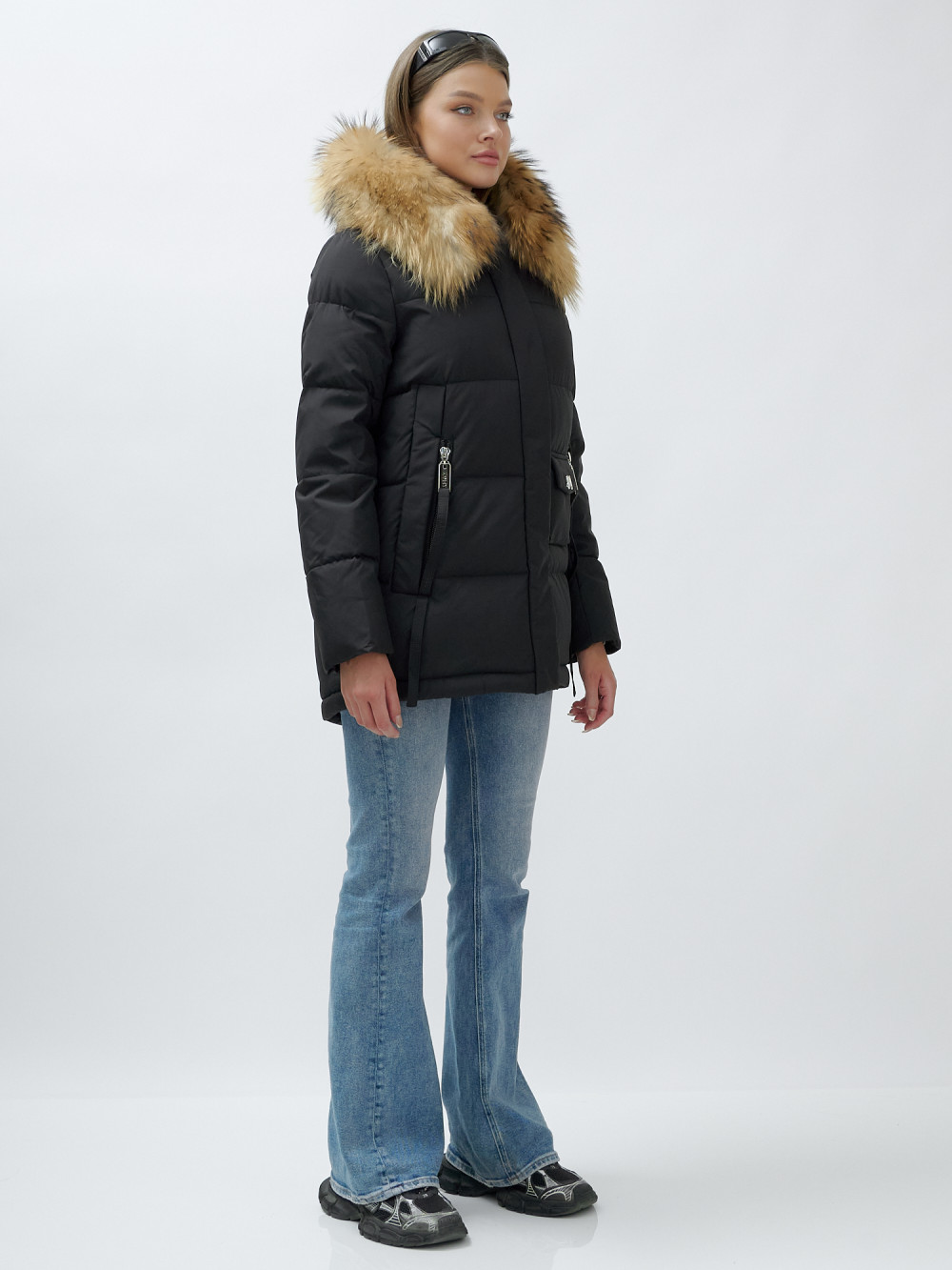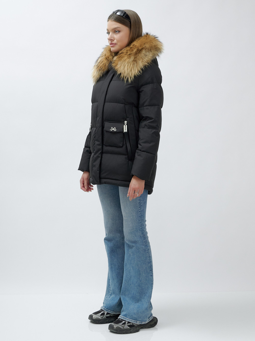 Куртка женская зимняя с мехом енот премиум класса черного цвета 3215Ch