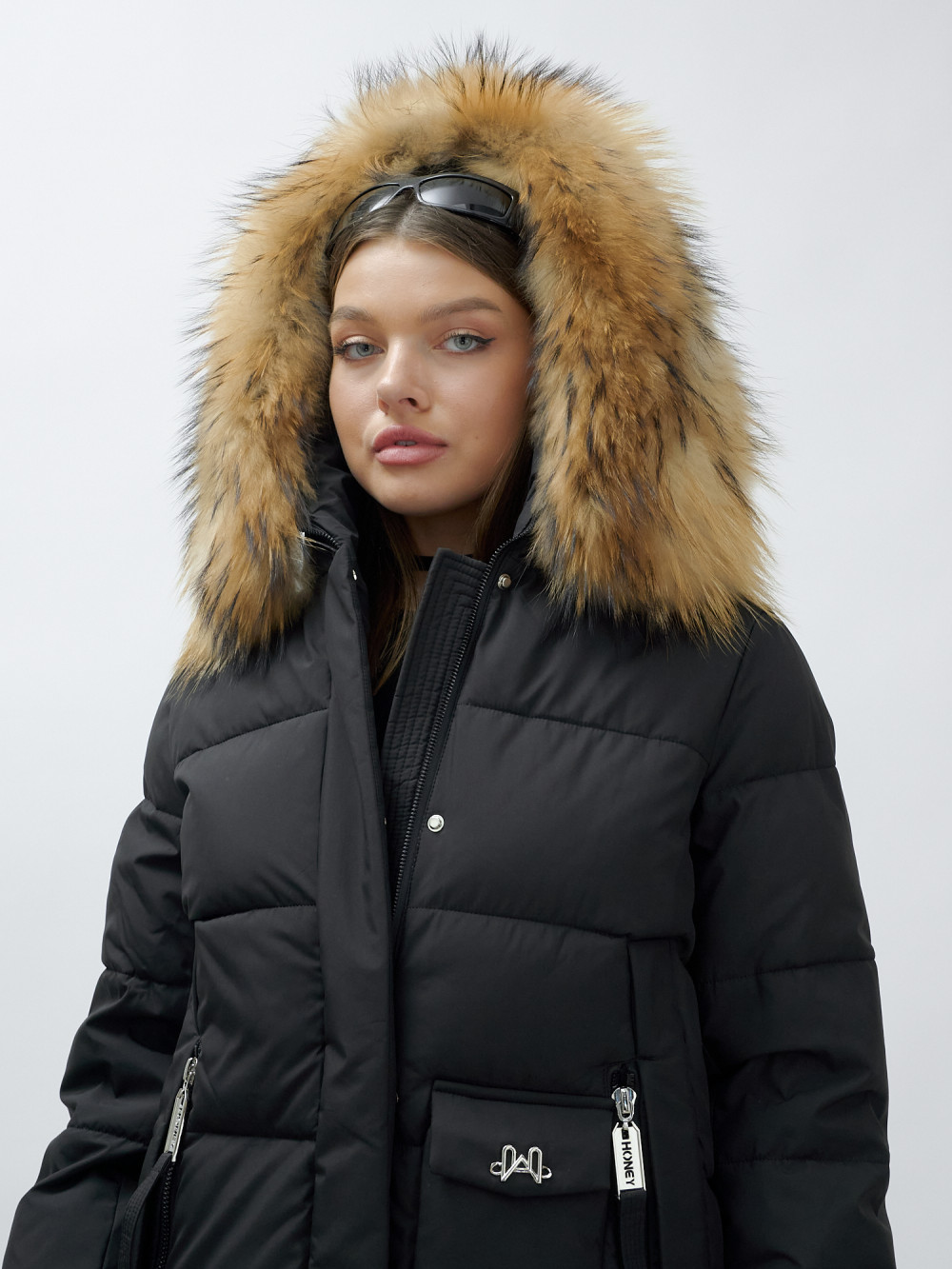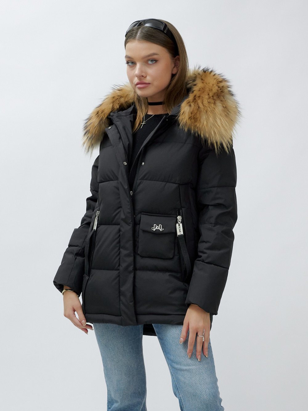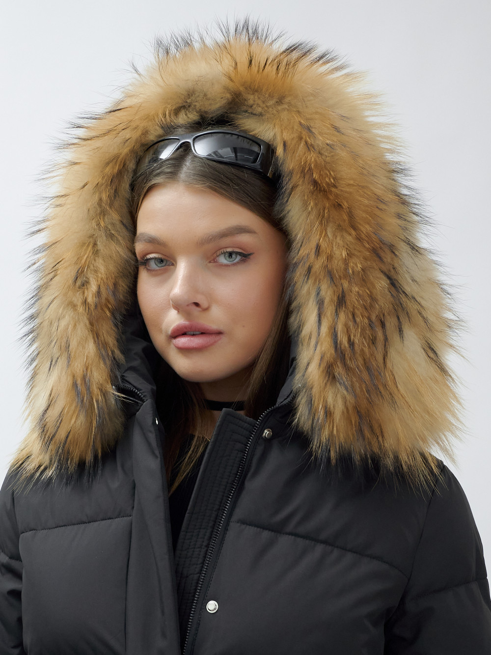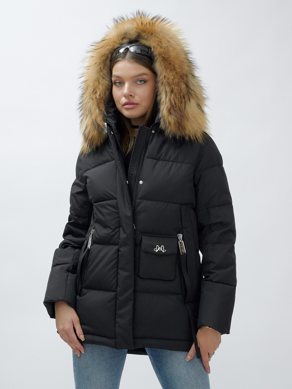Куртка женская зимняя с мехом енот премиум класса черного цвета 3215Ch