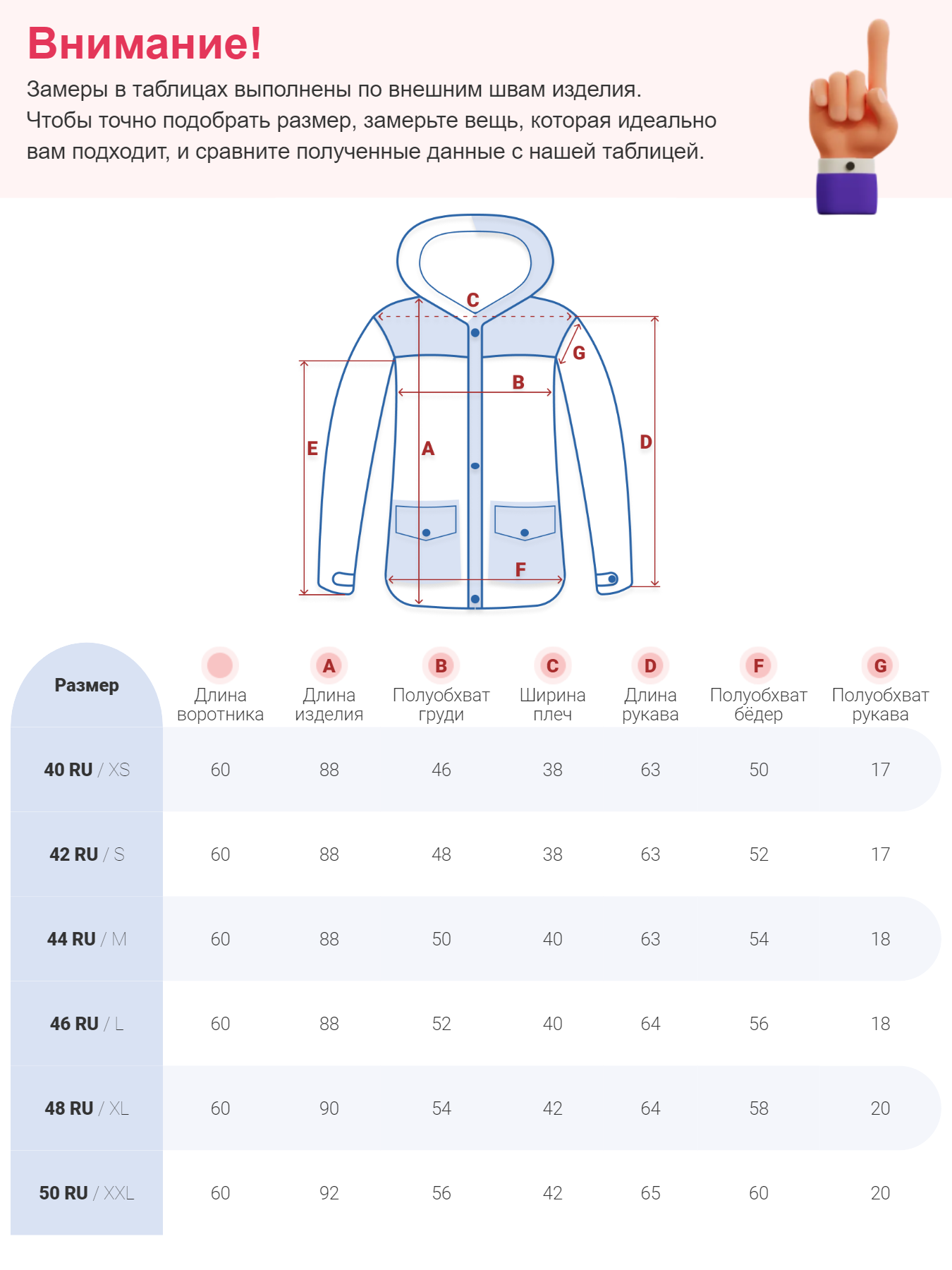- Декоративные элементы: Капюшон, Кнопки, Манжеты, Мех