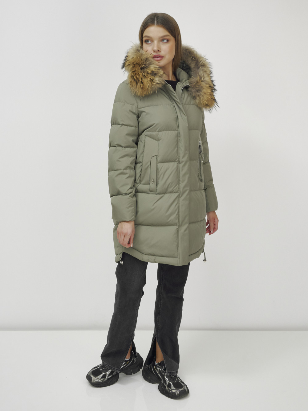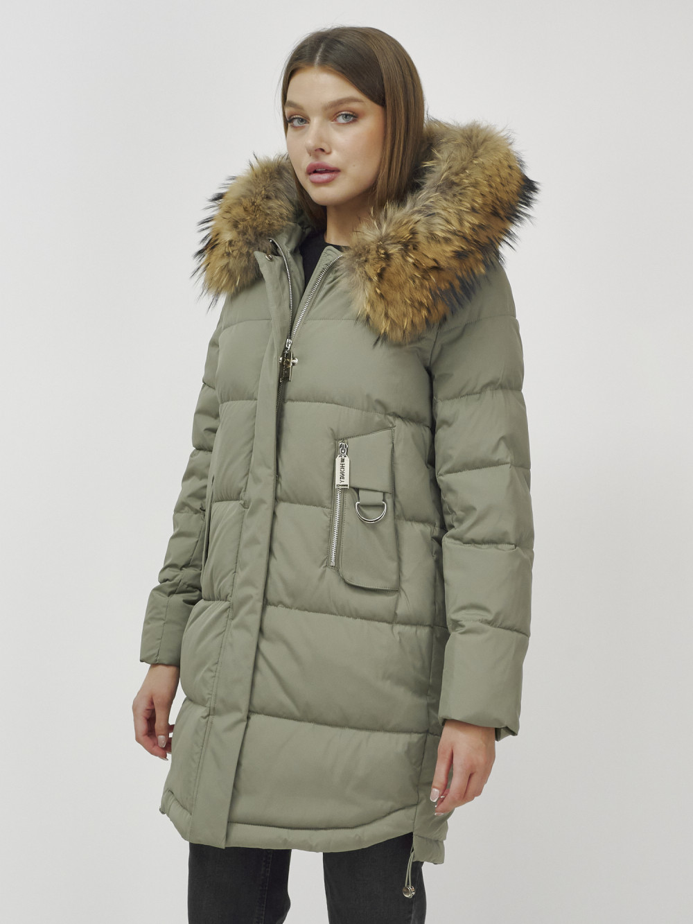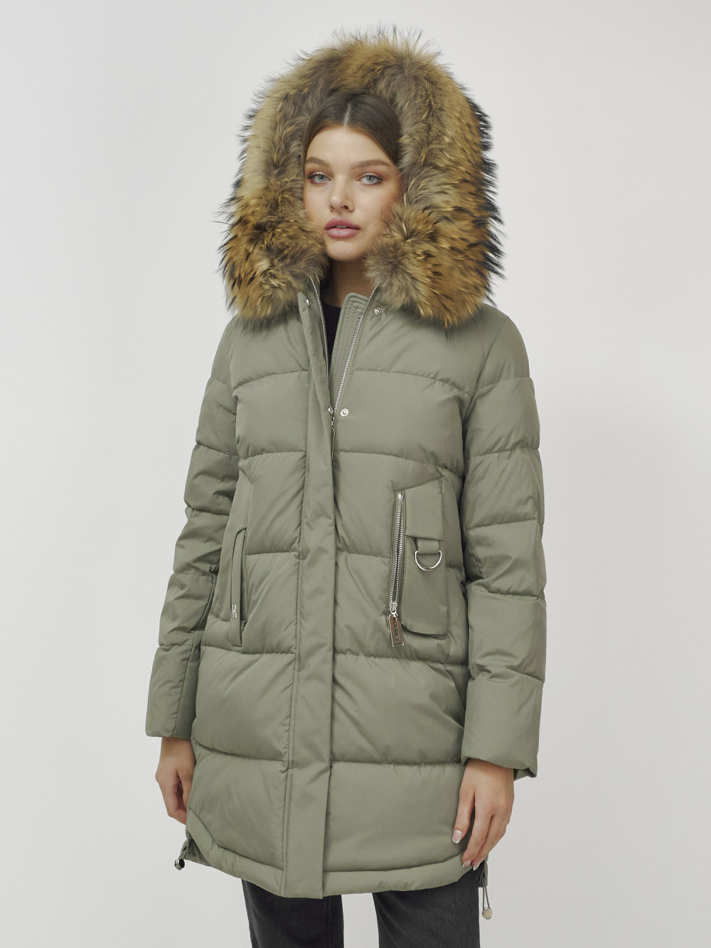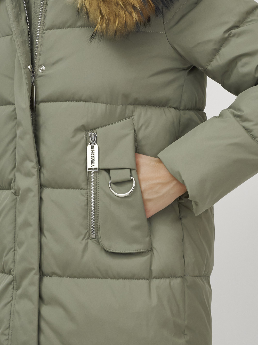 Куртка женская зимняя с мехом енот премиум класса цвета хаки 386Kh — Visdeer