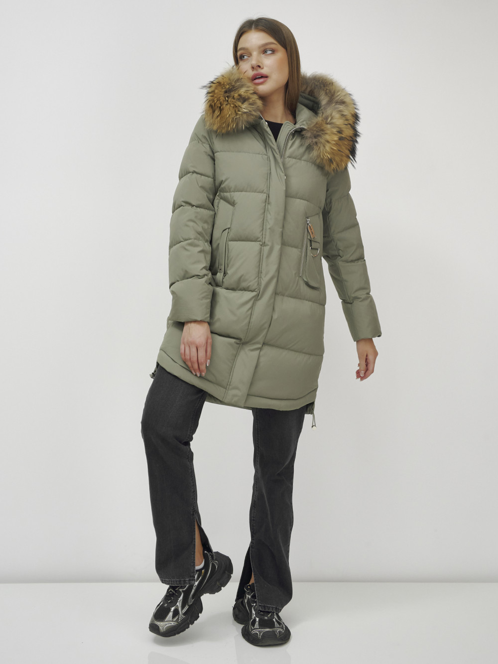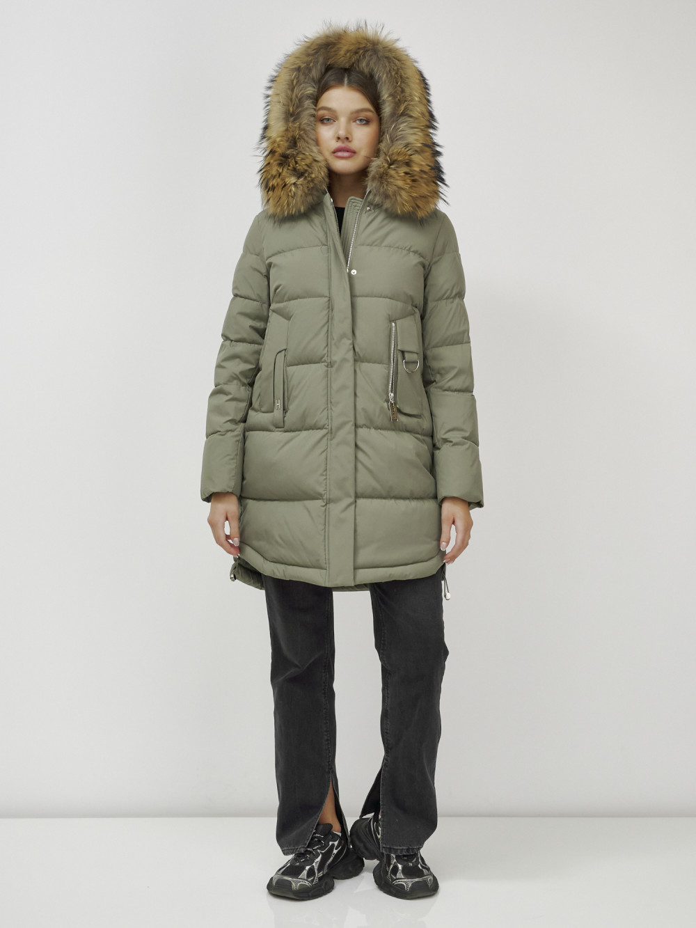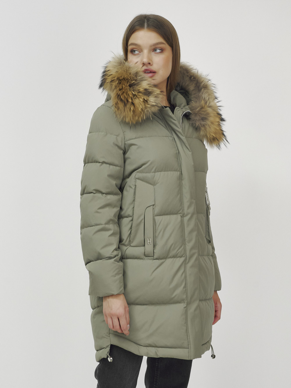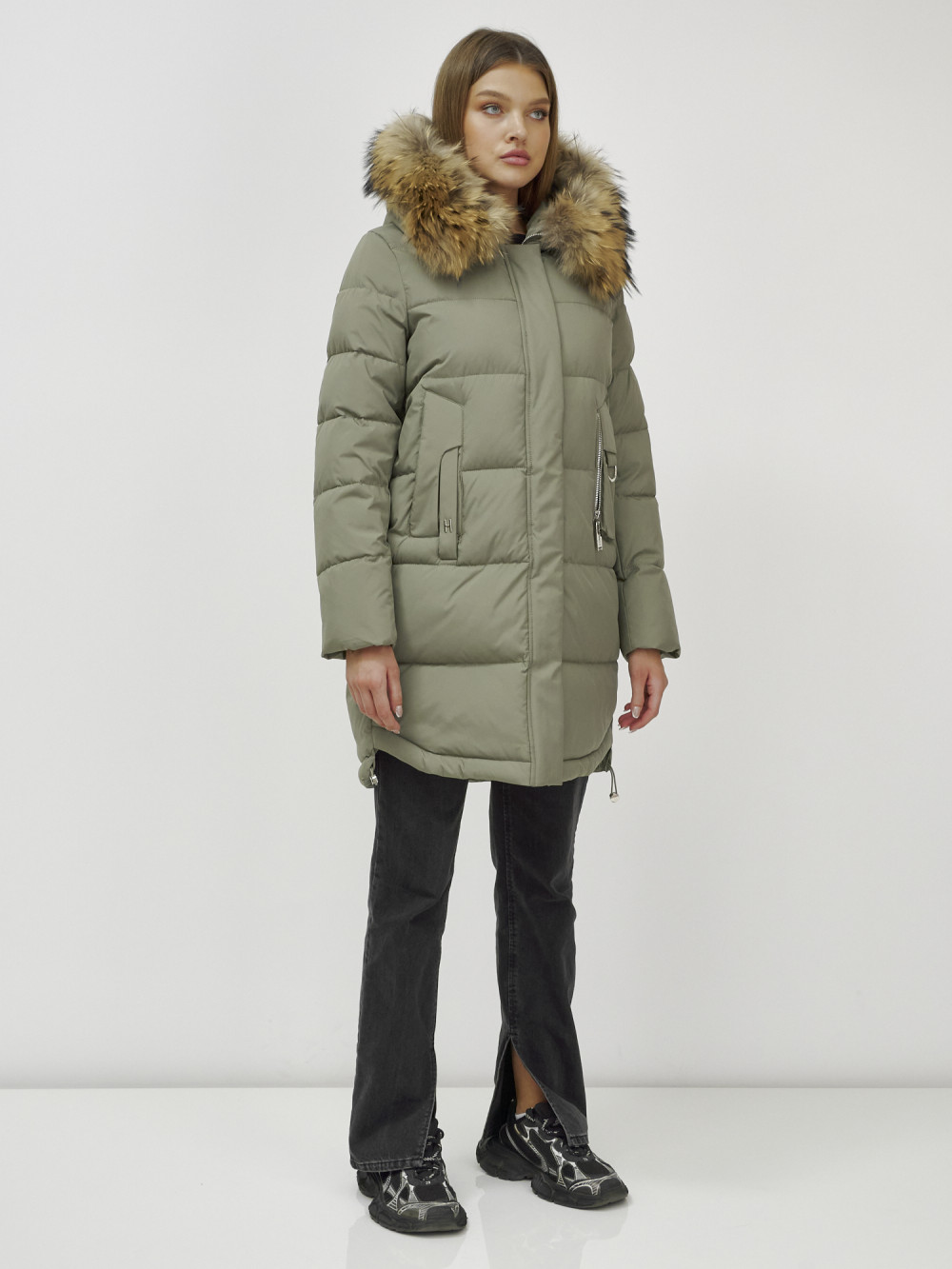 Куртка женская зимняя с мехом енот премиум класса цвета хаки 386Kh — Visdeer