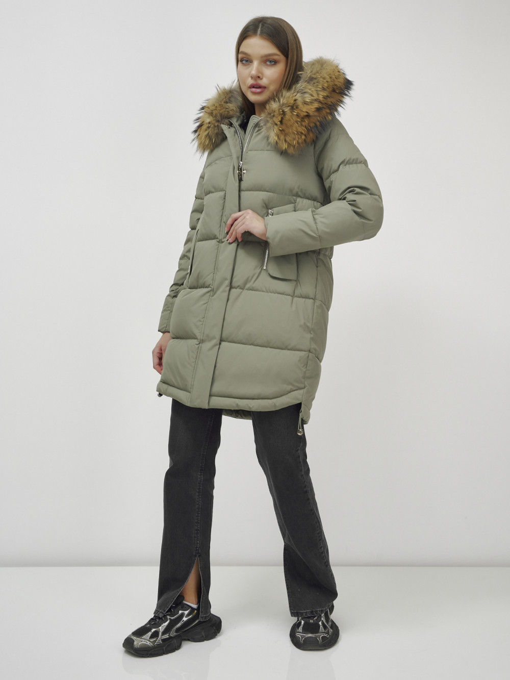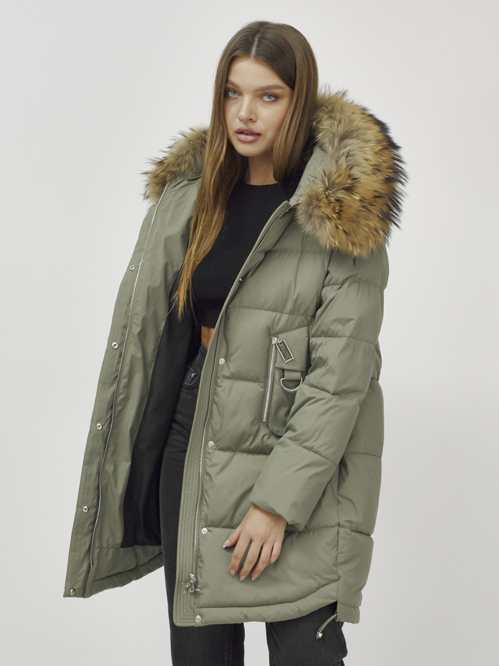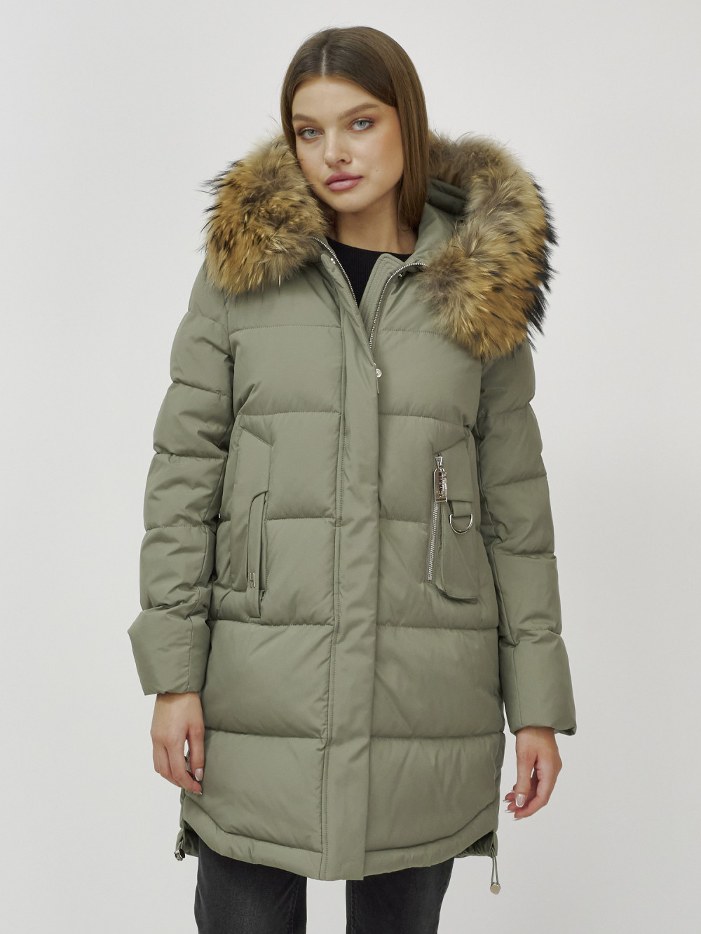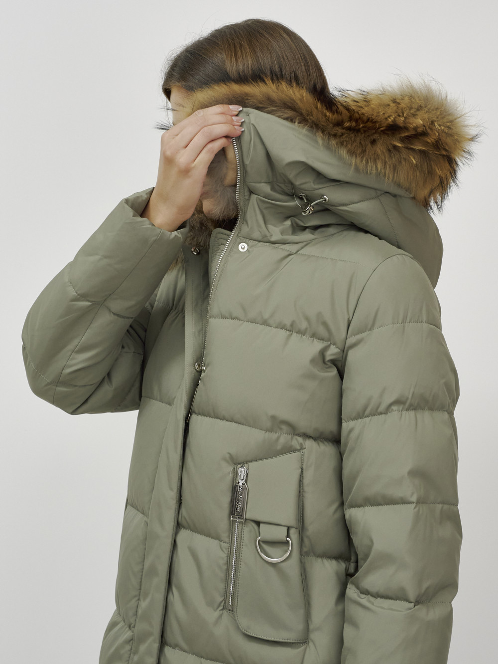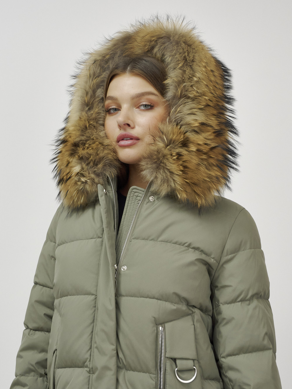 Куртка женская зимняя с мехом енот премиум класса цвета хаки 386Kh — Visdeer