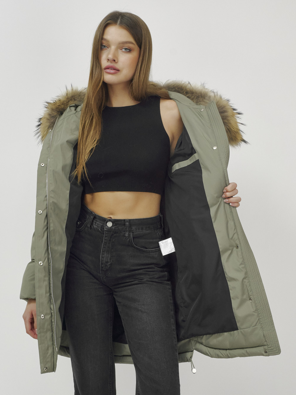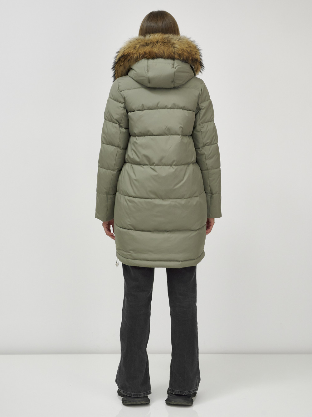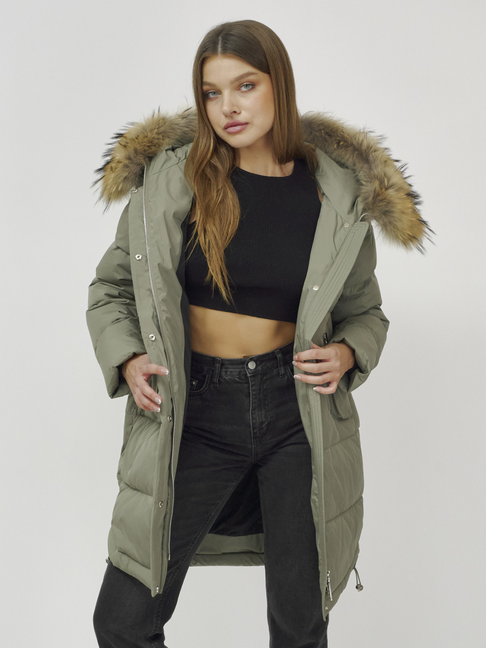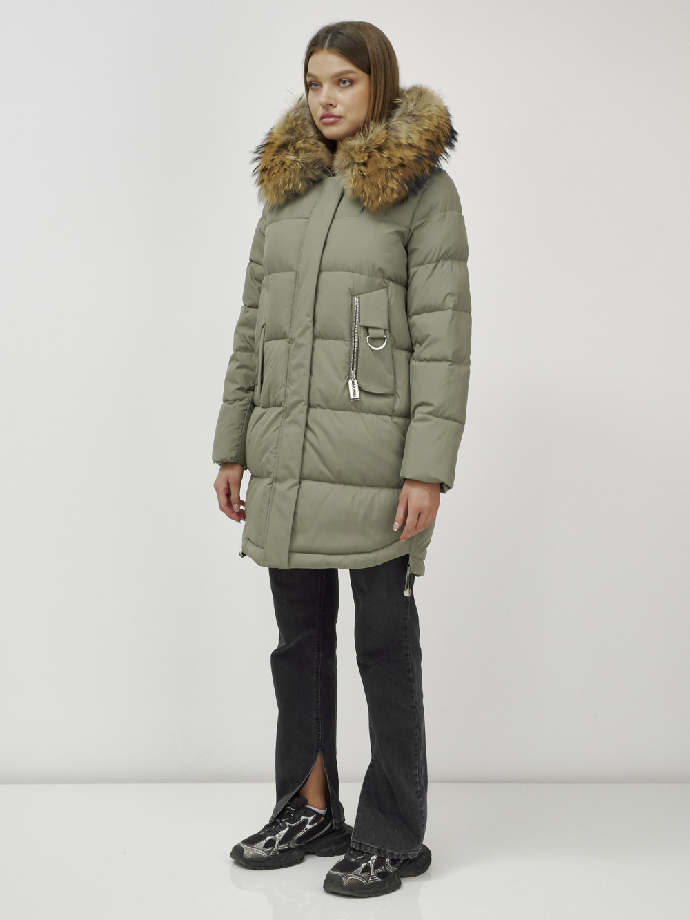Куртка женская зимняя с мехом енот премиум класса цвета хаки 386Kh — Visdeer