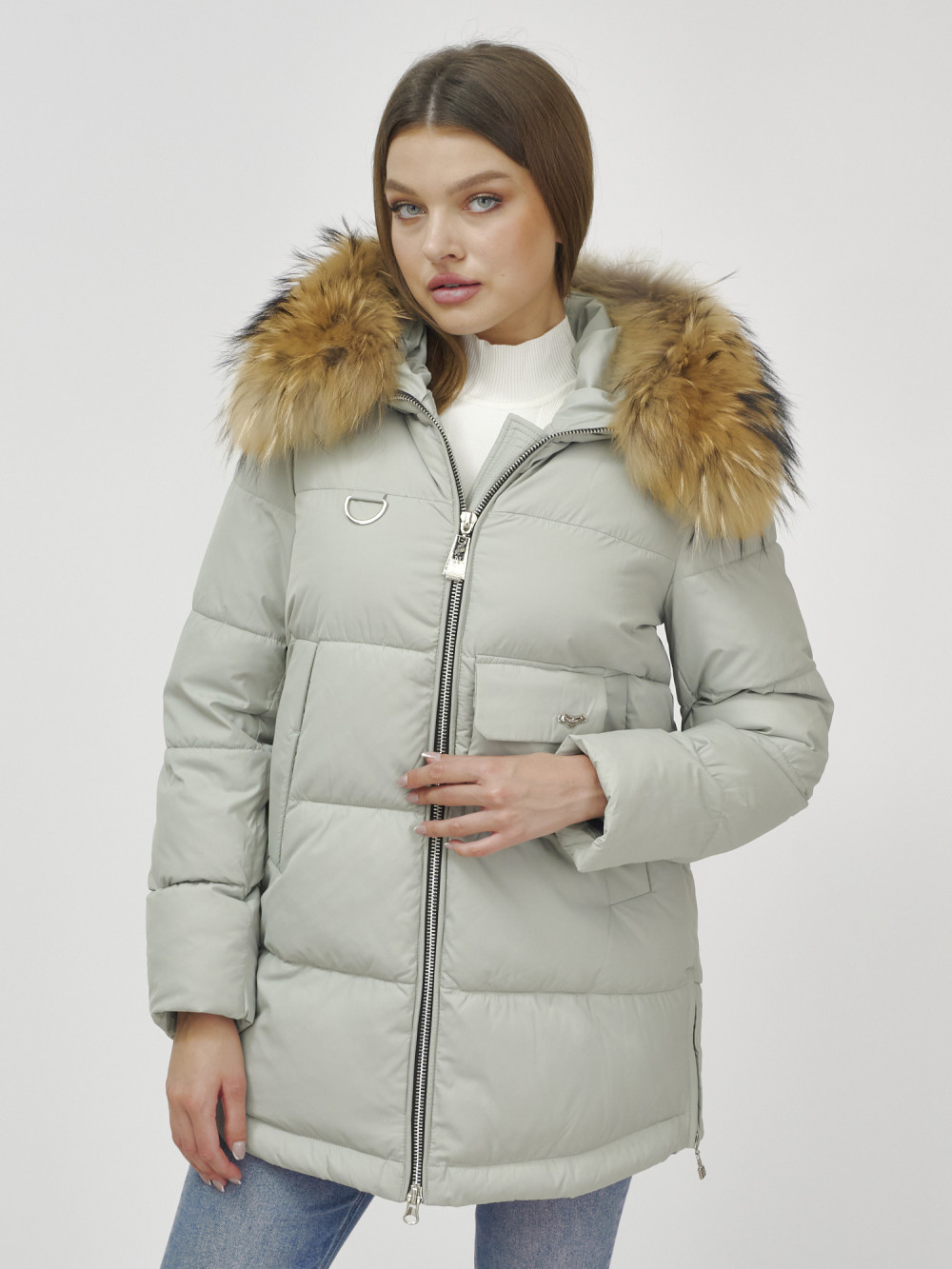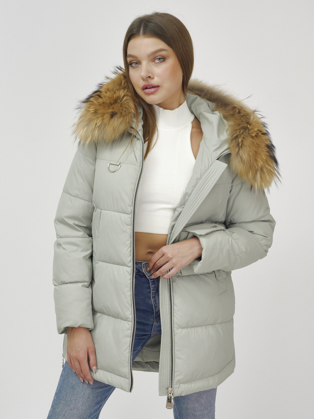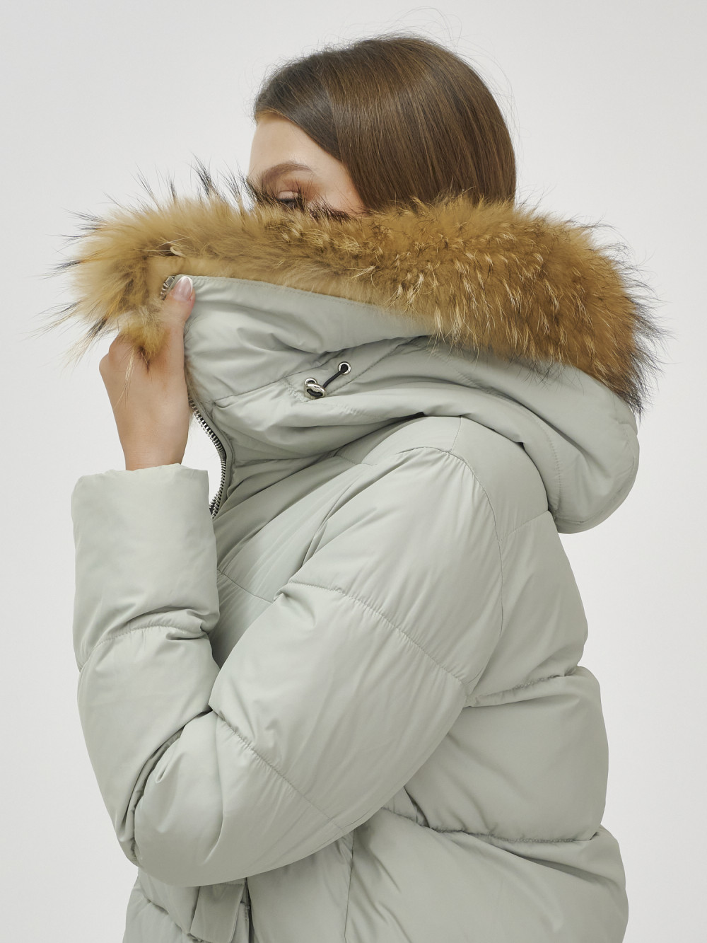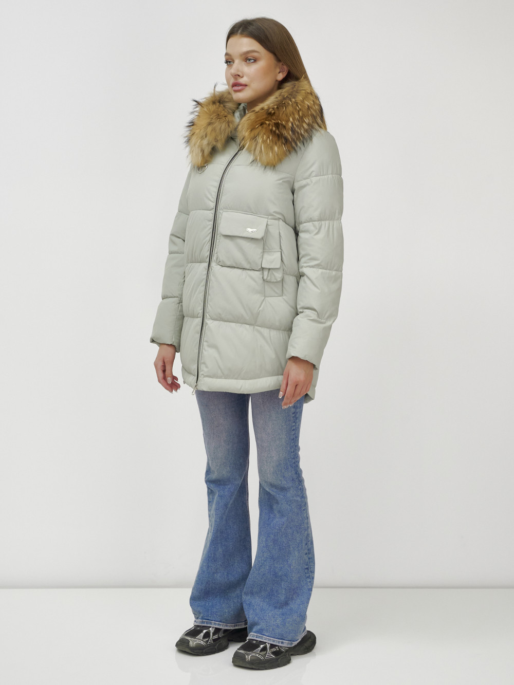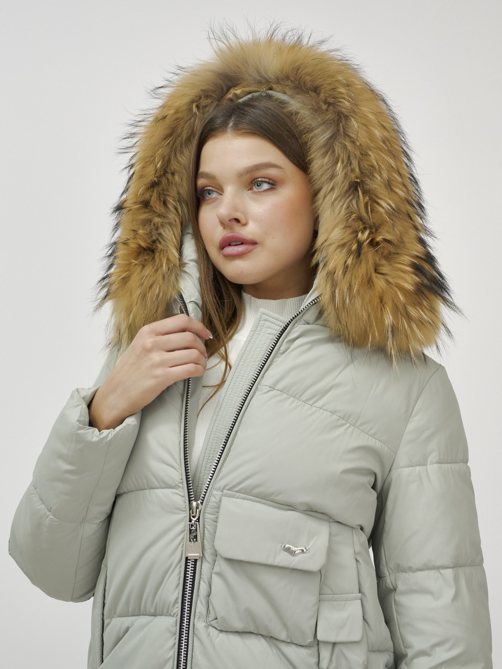 Куртка женская зимняя с мехом енот премиум класса светло-зеленого цвета 3146ZS — Visdeer