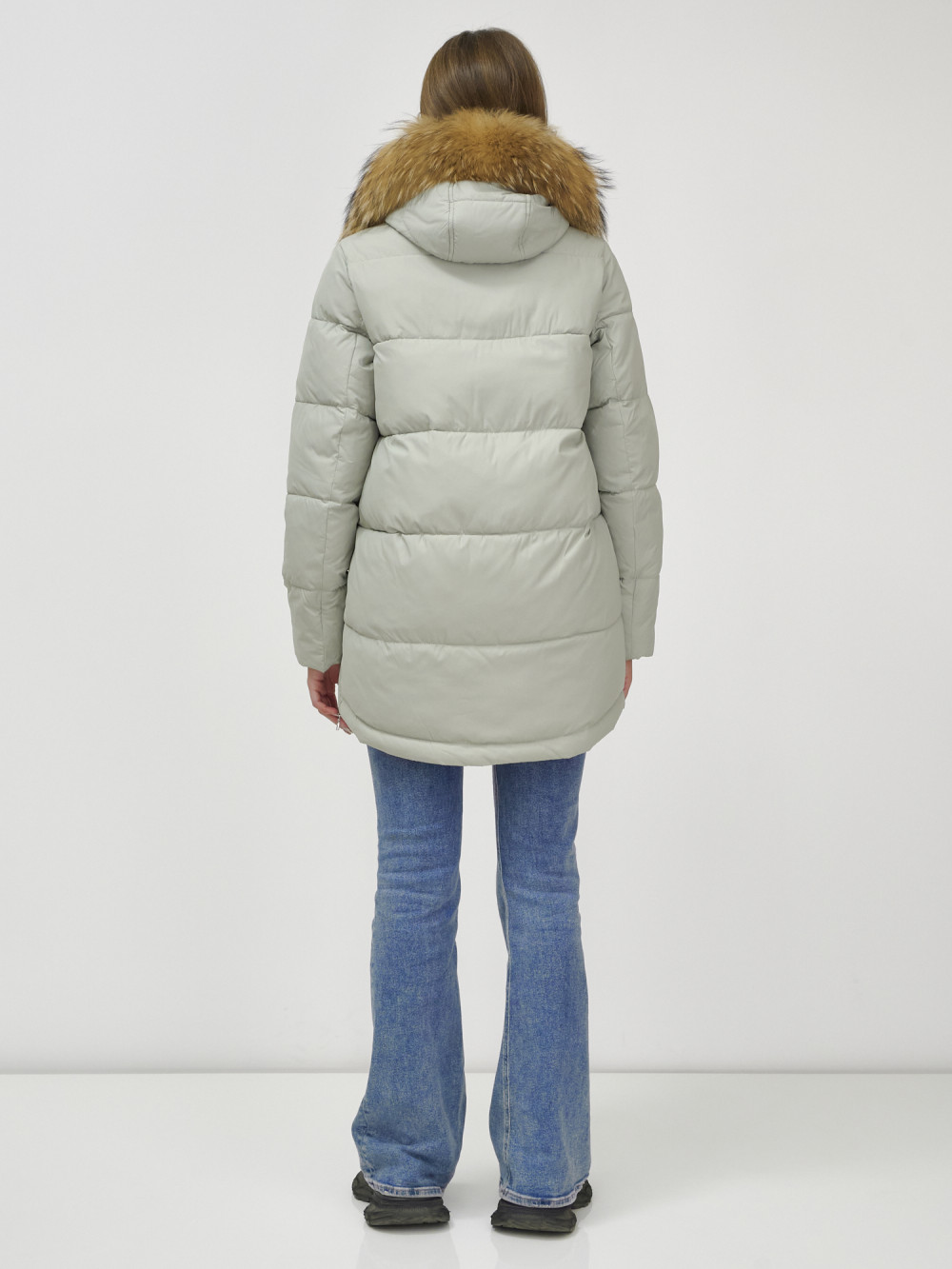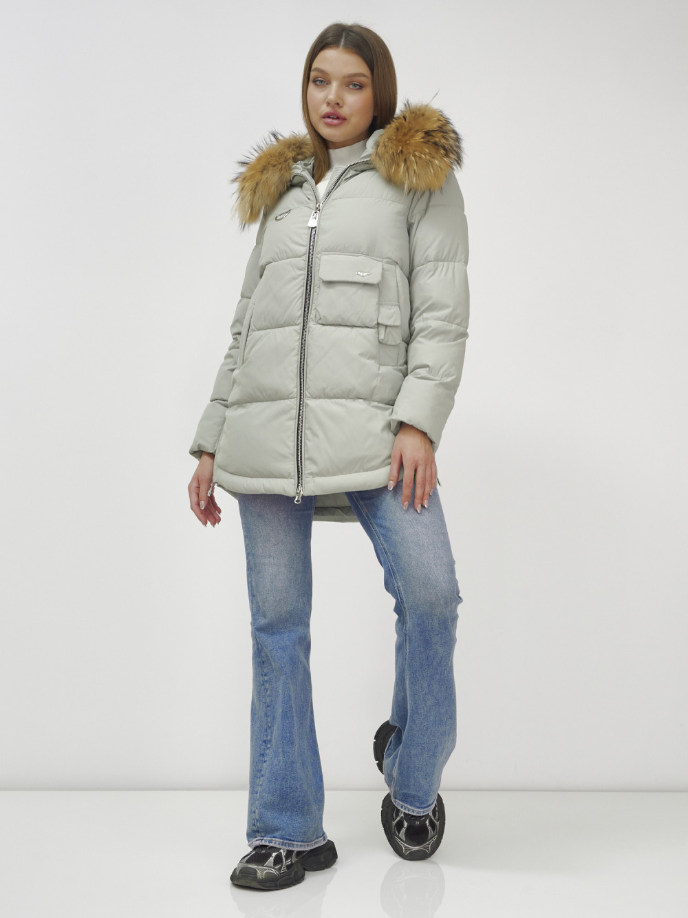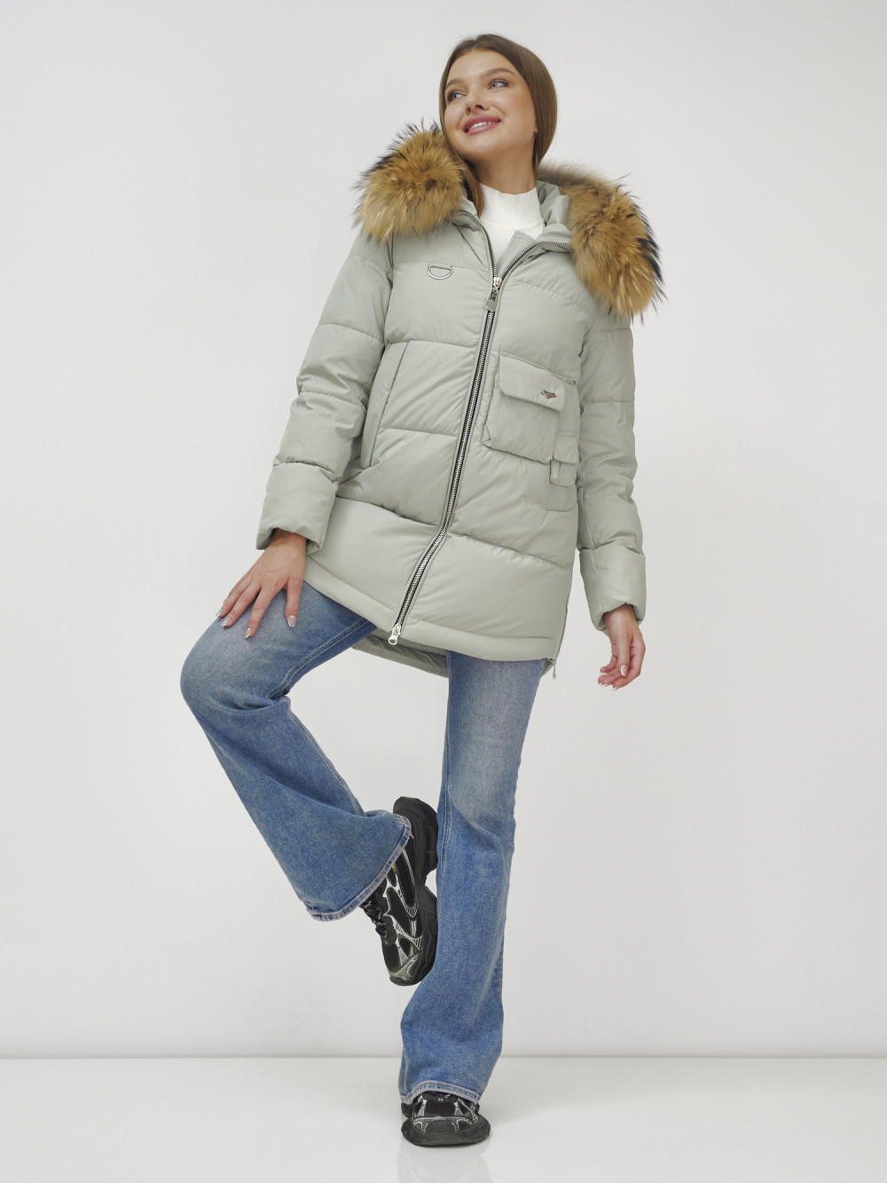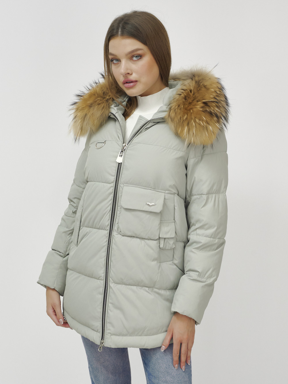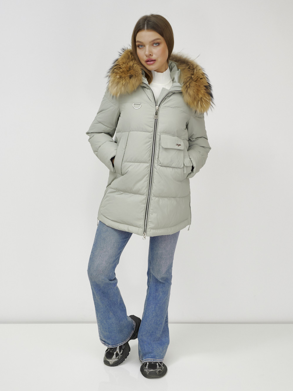 Куртка женская зимняя с мехом енот премиум класса светло-зеленого цвета 3146ZS — Visdeer