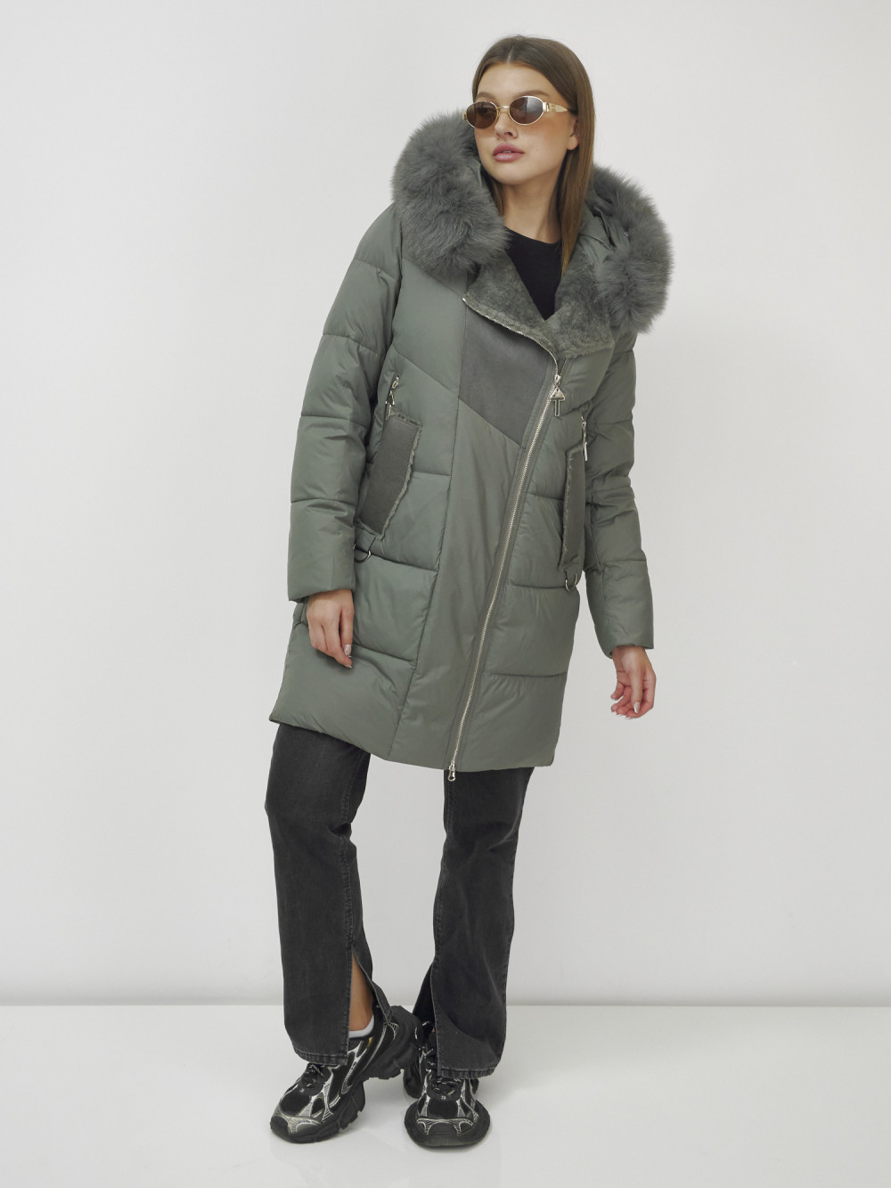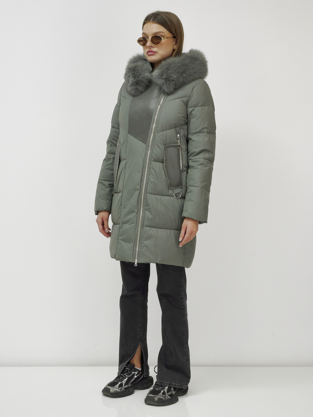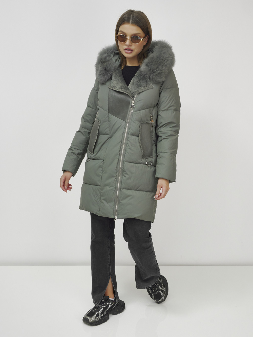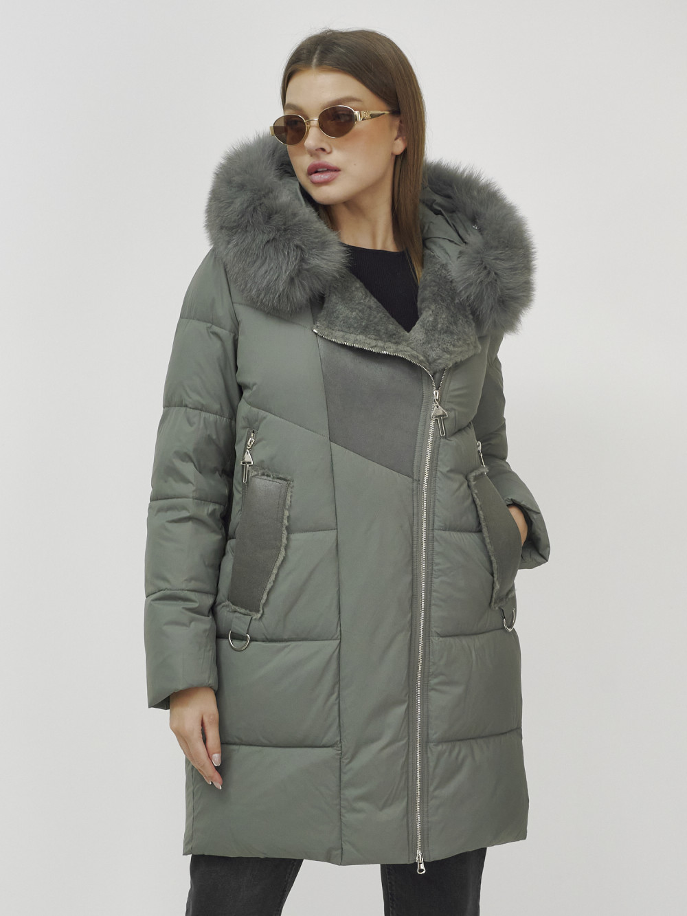 Куртка женская зимняя с мехом енот премиум класса зеленого цвета 3132Z — Visdeer