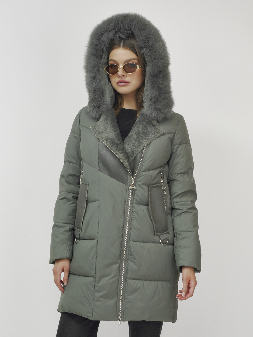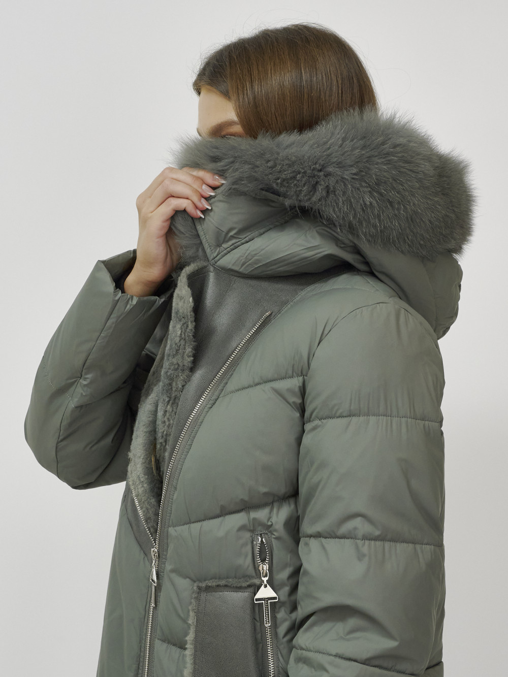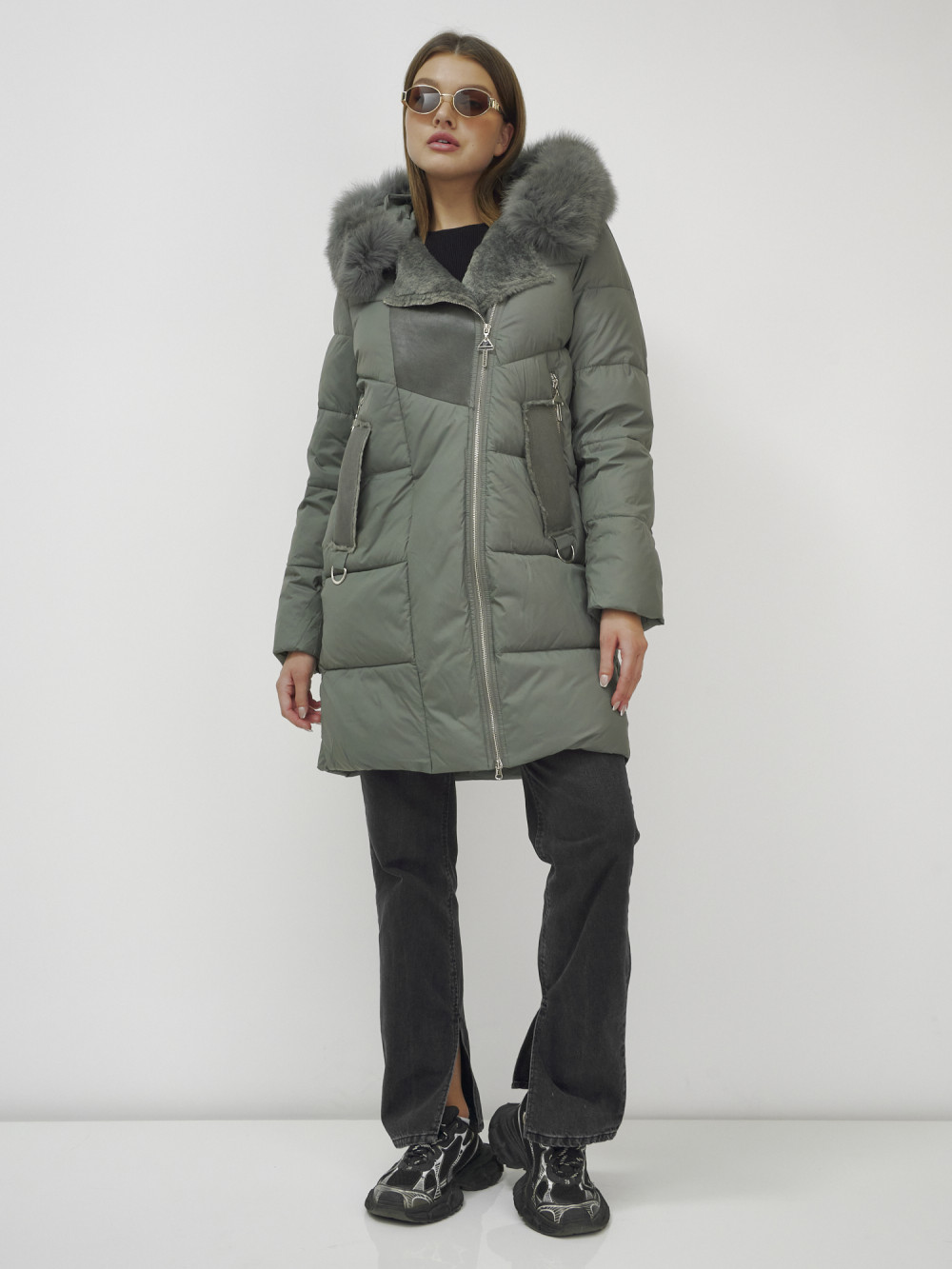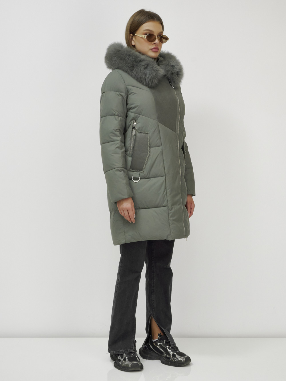 Куртка женская зимняя с мехом енот премиум класса зеленого цвета 3132Z — Visdeer