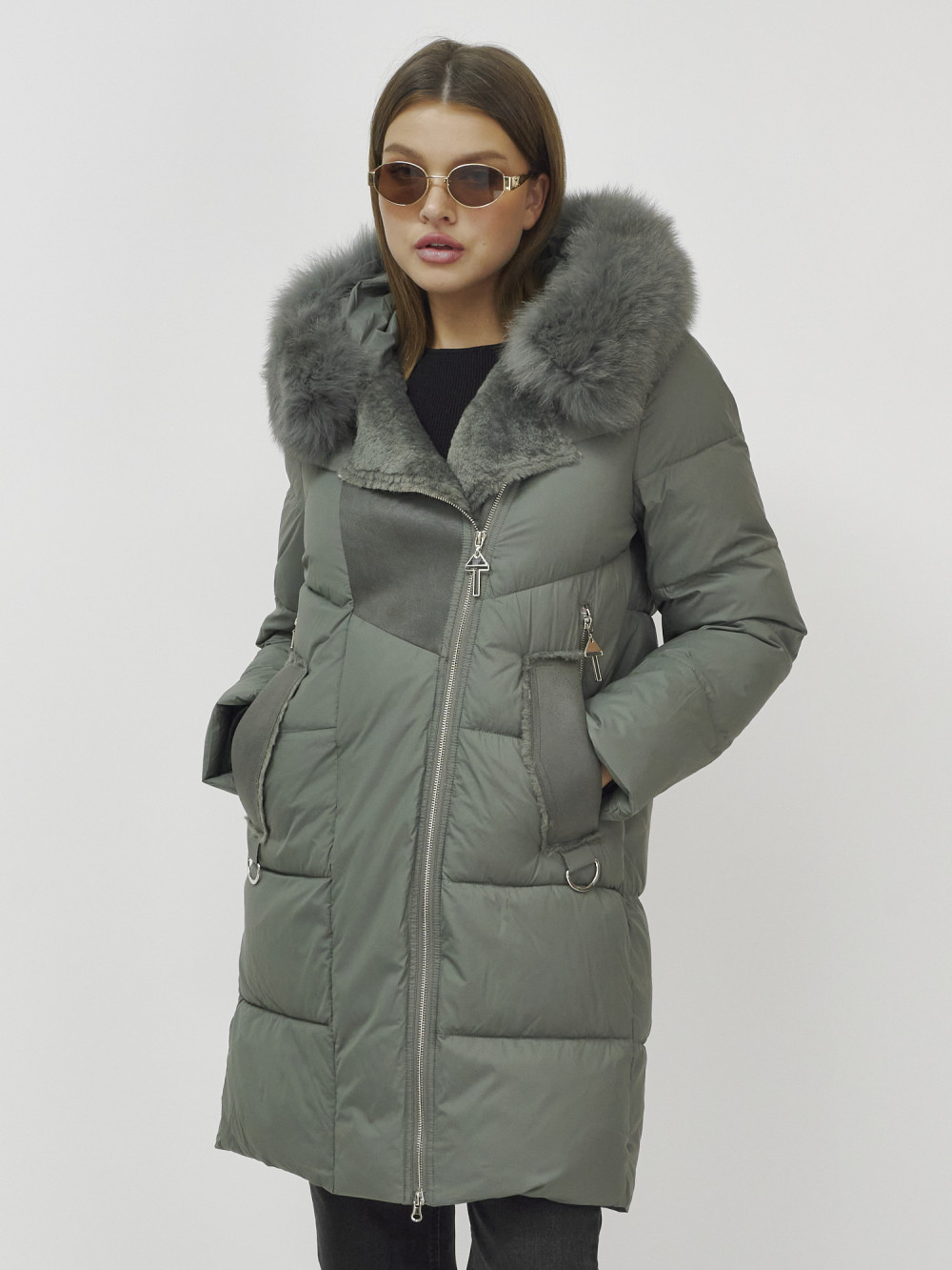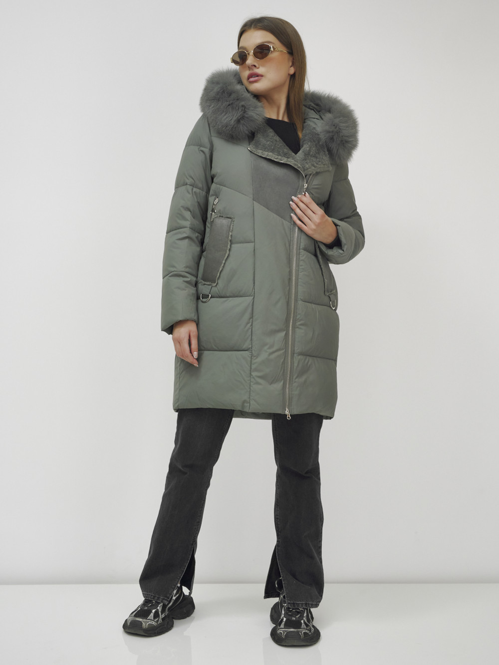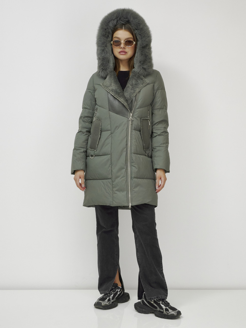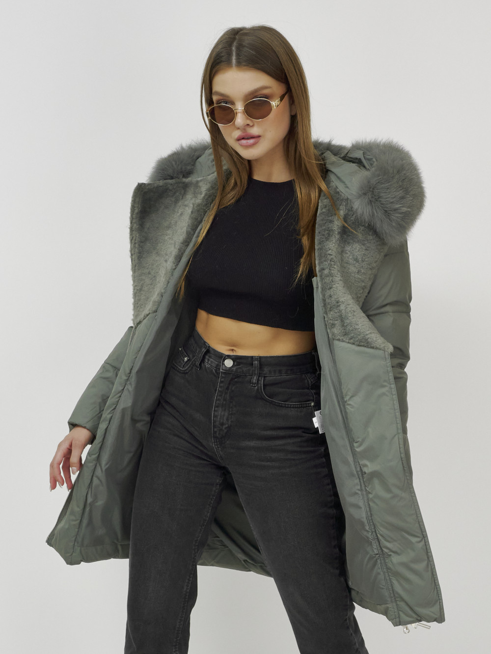Куртка женская зимняя с мехом енот премиум класса зеленого цвета 3132Z — Visdeer
