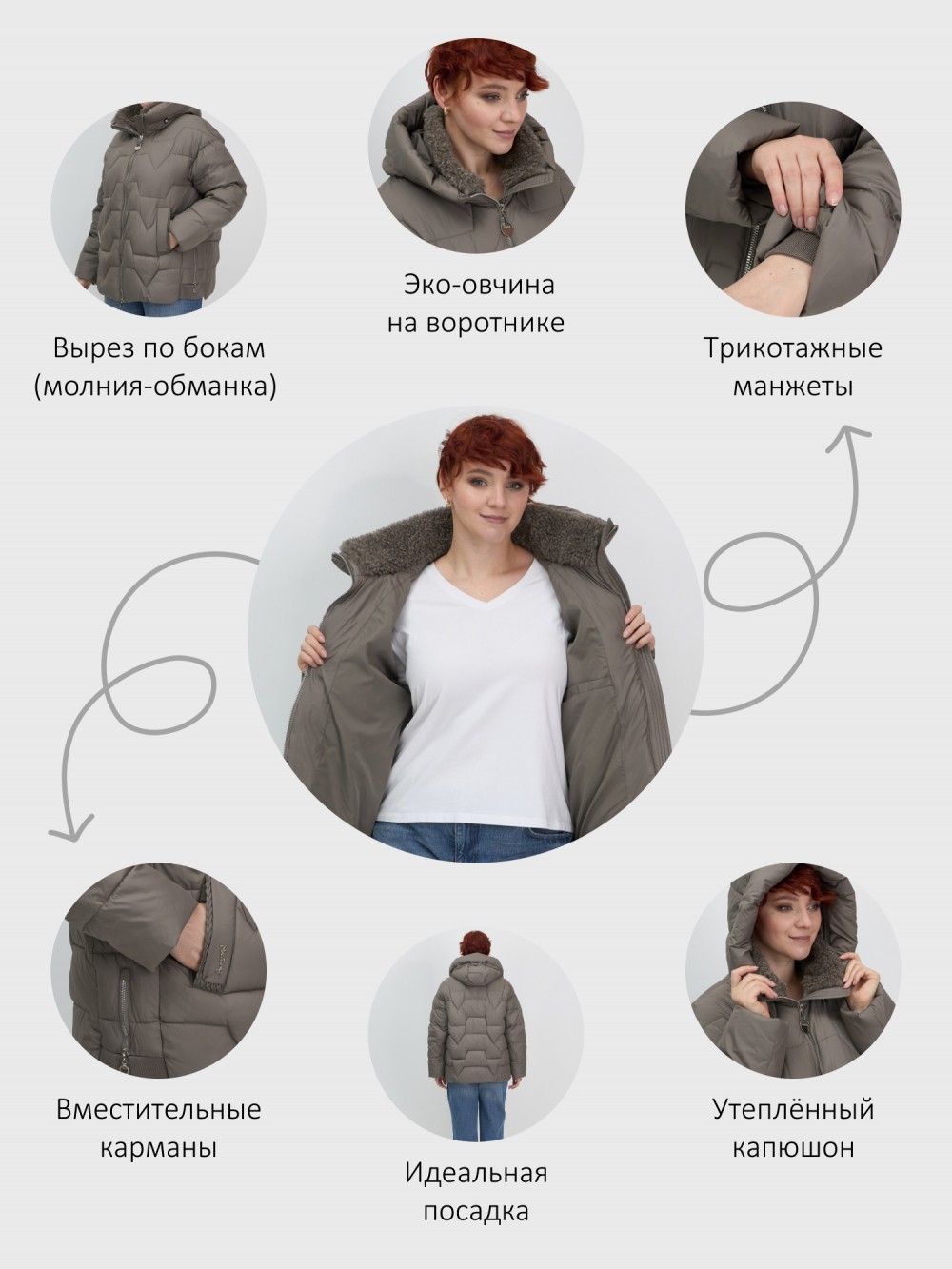 - Декоративные элементы: Вышивка, Декоративные пуговицы, Манжеты, Мех