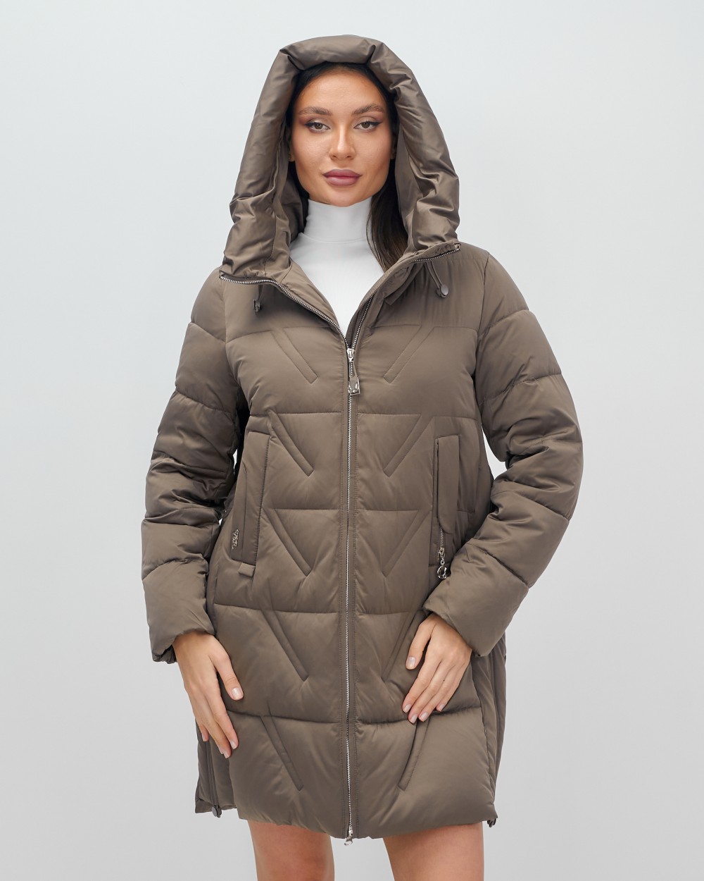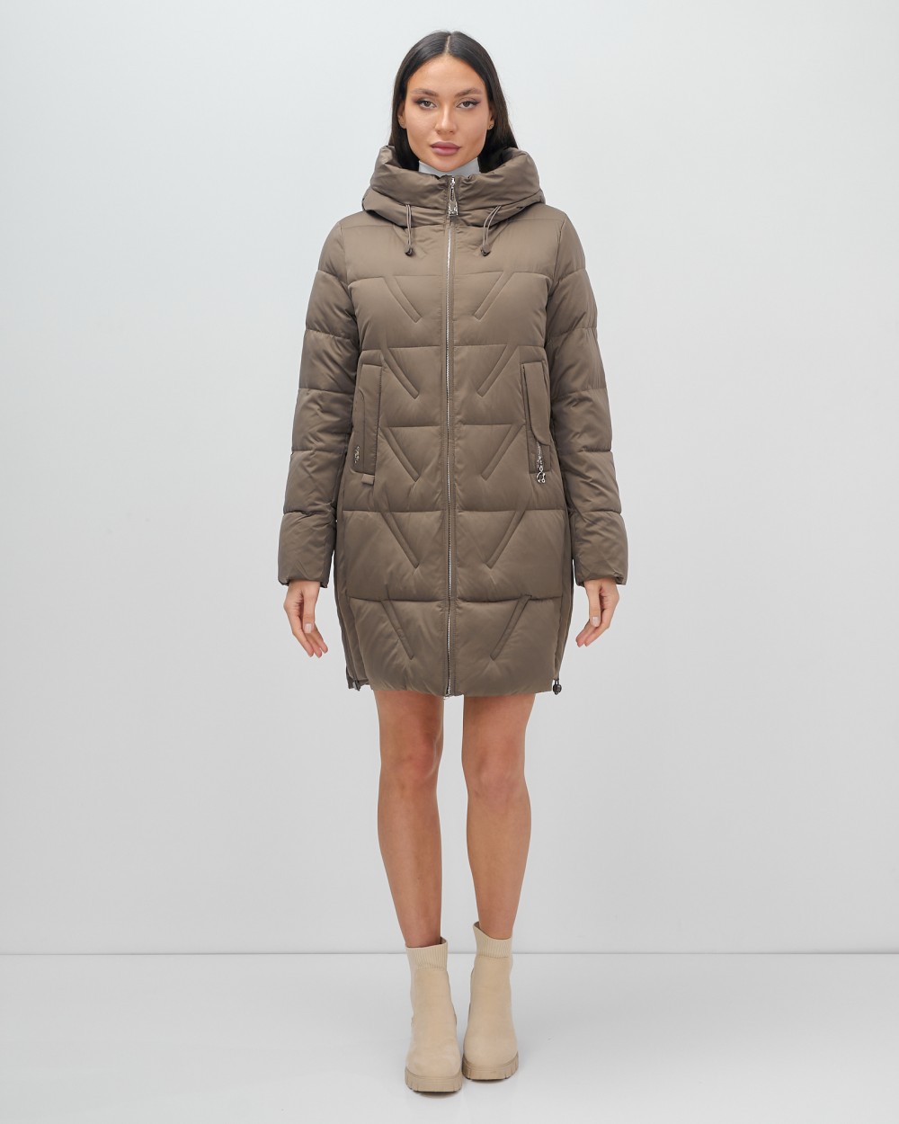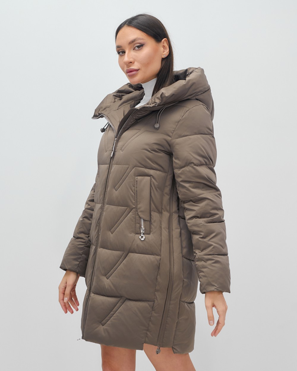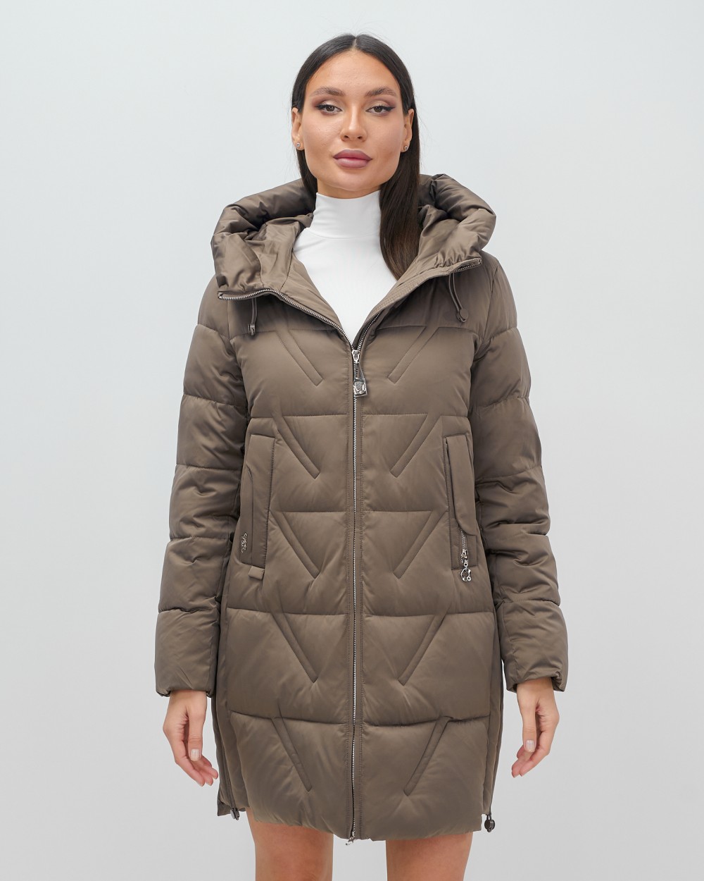 Куртка зимняя женская классическая с капюшоном коричневого цвета 7671K — Visdeer