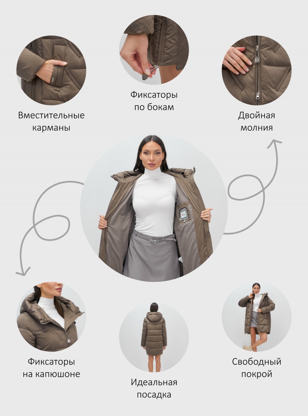 Эта модель выполнена в элегантном, офисном/школьном и повседневном стилях, идеально подходит для различных ситуаций. Декоративные элементы, такие как капюшон и молния, придают куртке современный вид. Доступна в пяти цветах: черный, темно-серый, бежевый, коричневый и светло-коричневый.