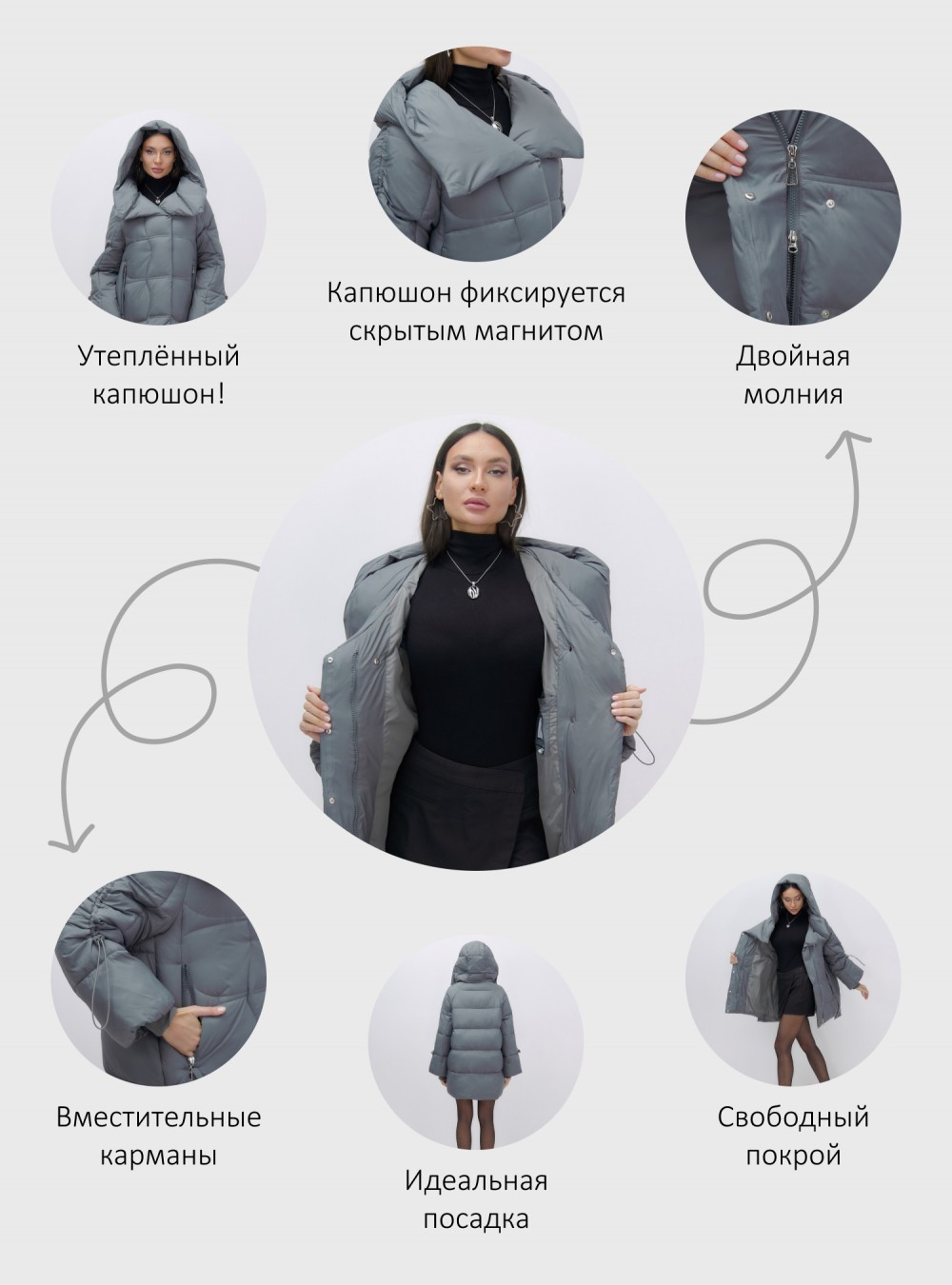 - Декоративные элементы: Капюшон, Карманы, Манжеты, Молния