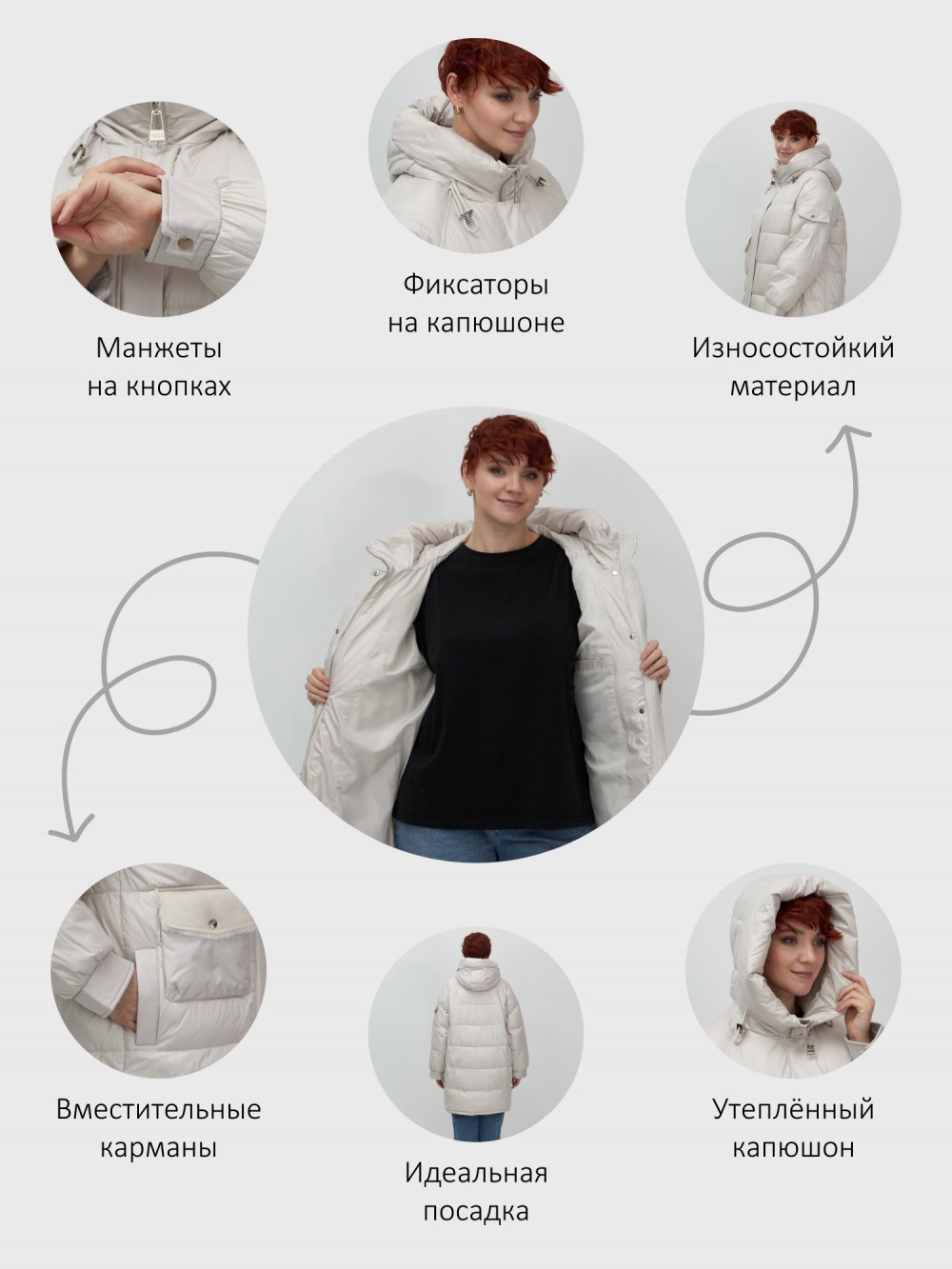 - Фиксаторы: На капюшоне/по низу