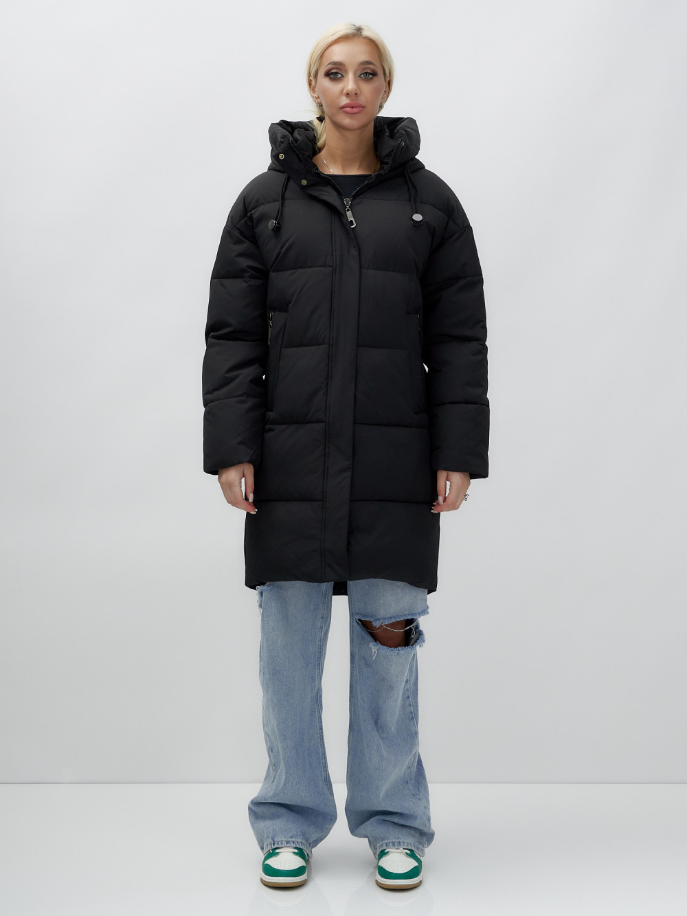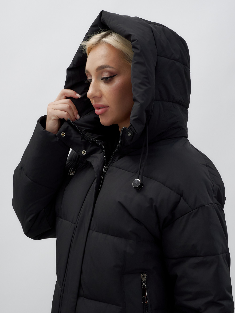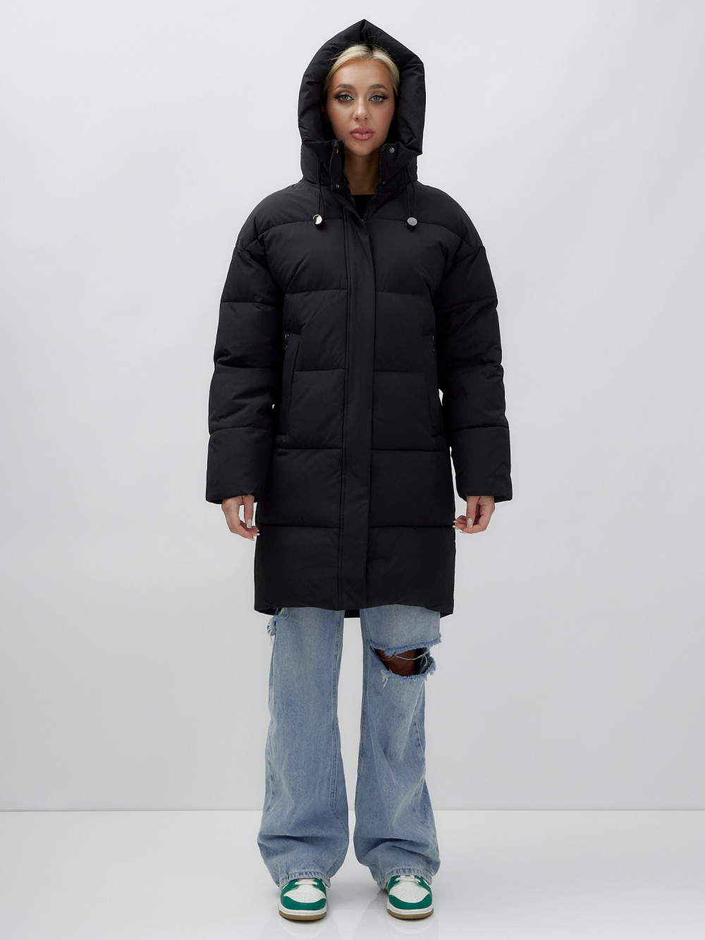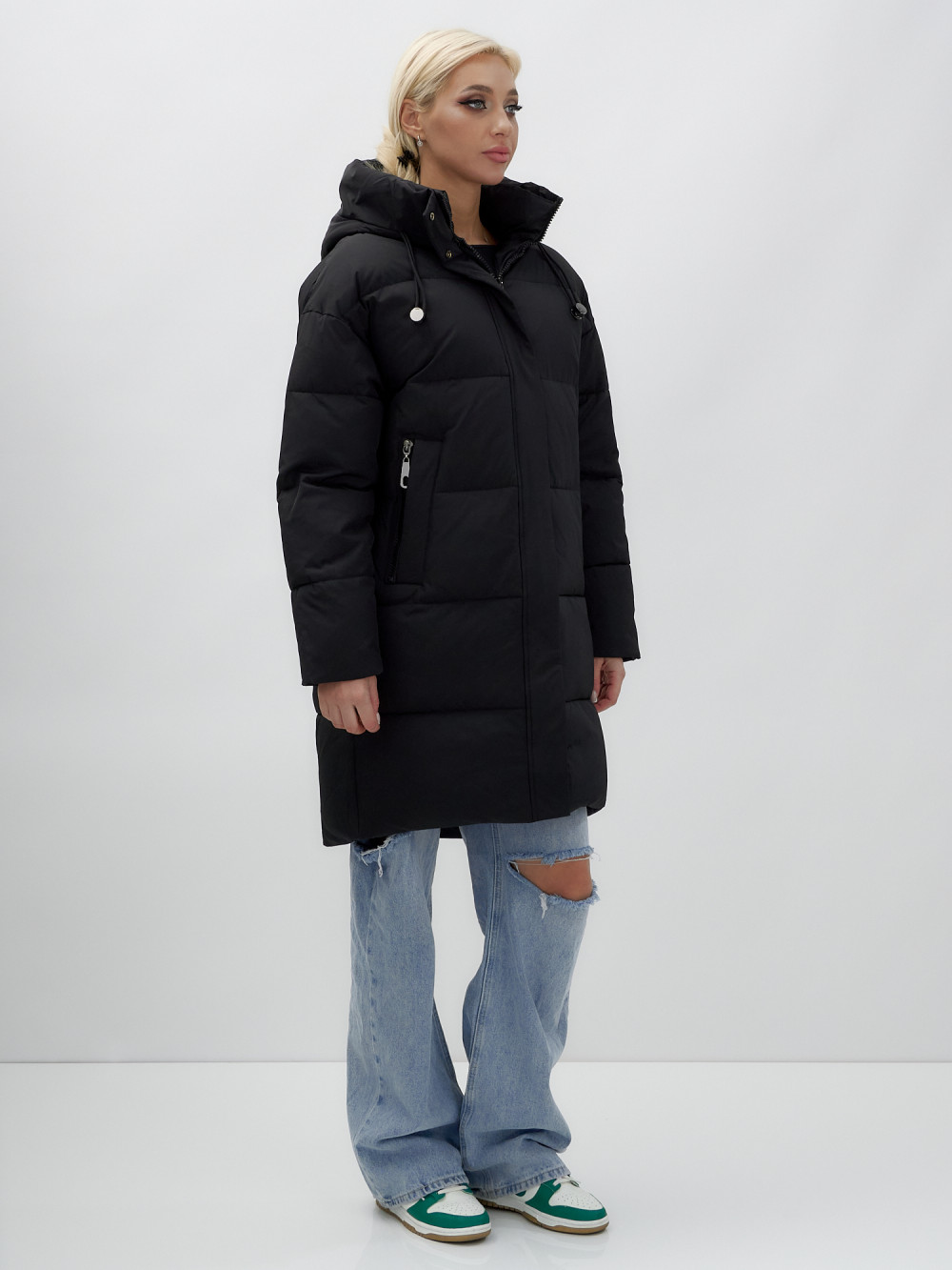 Куртка зимняя женская с капюшоном удлиненная стеганная черного цвета 9638Ch — MTFORCE
