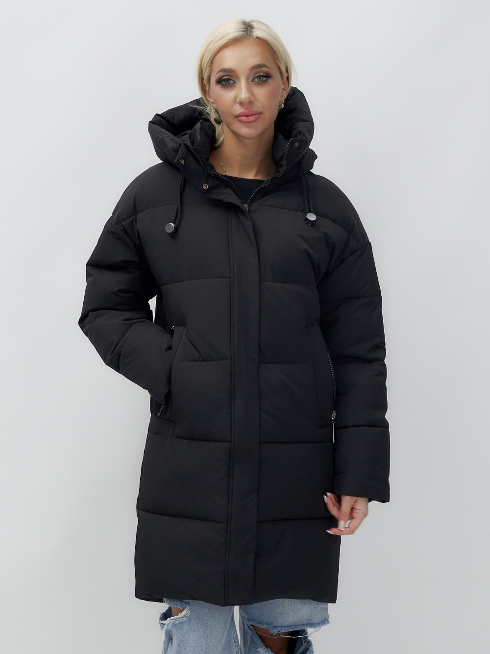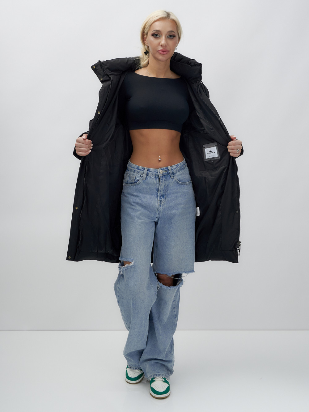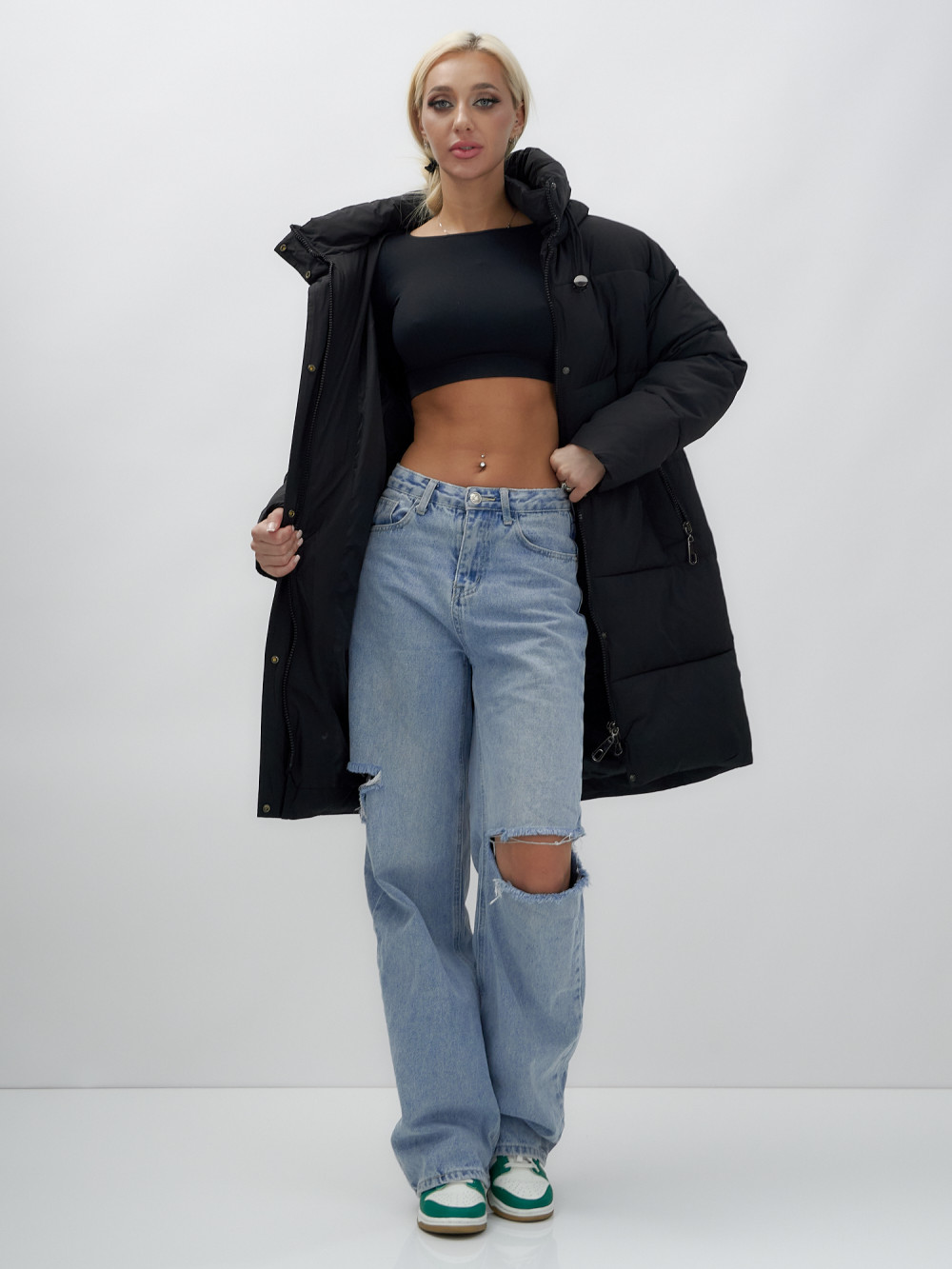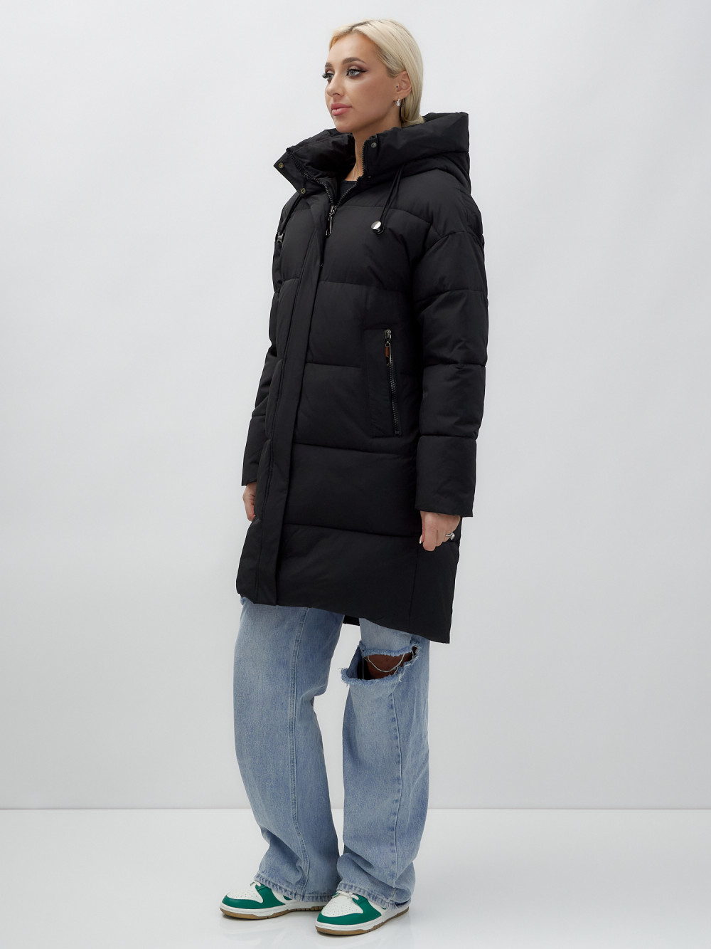 Куртка зимняя женская с капюшоном удлиненная стеганная черного цвета 9638Ch — MTFORCE