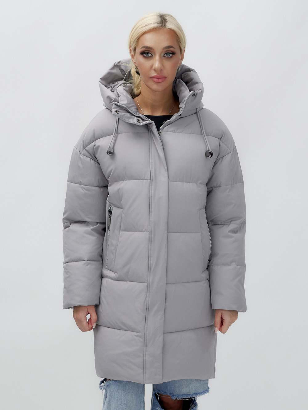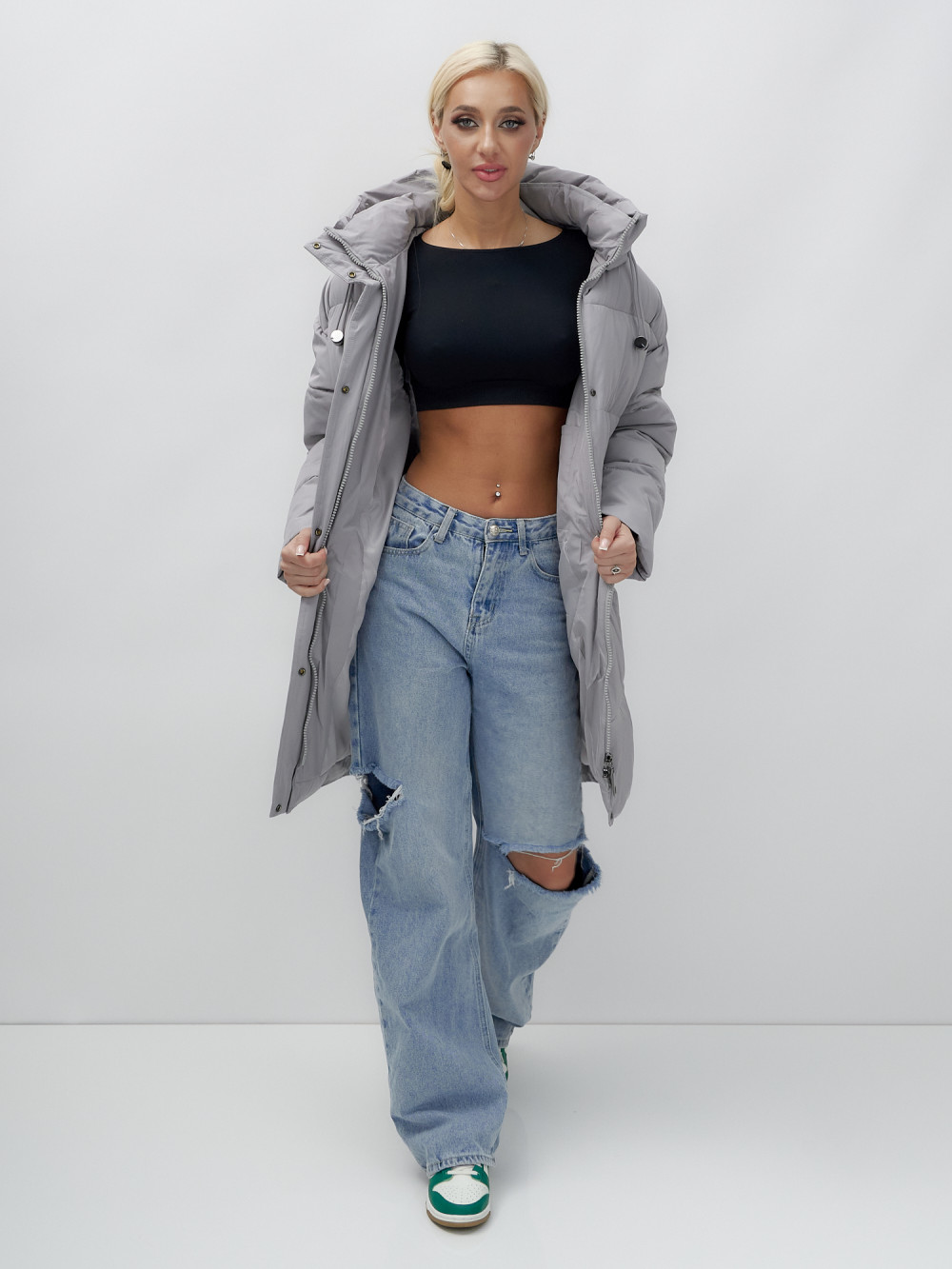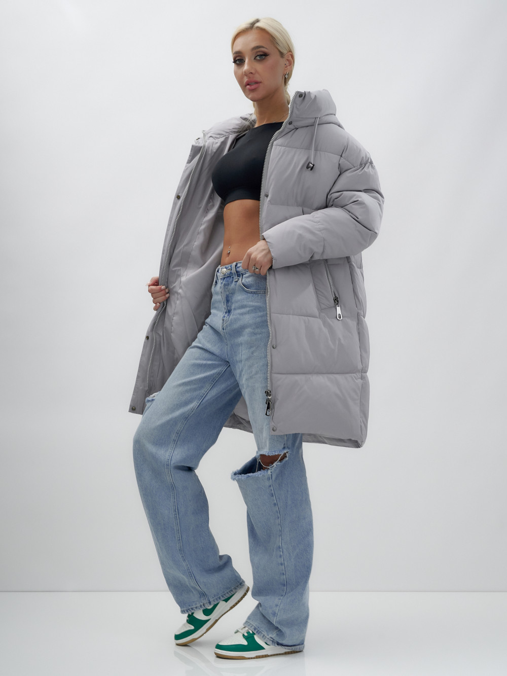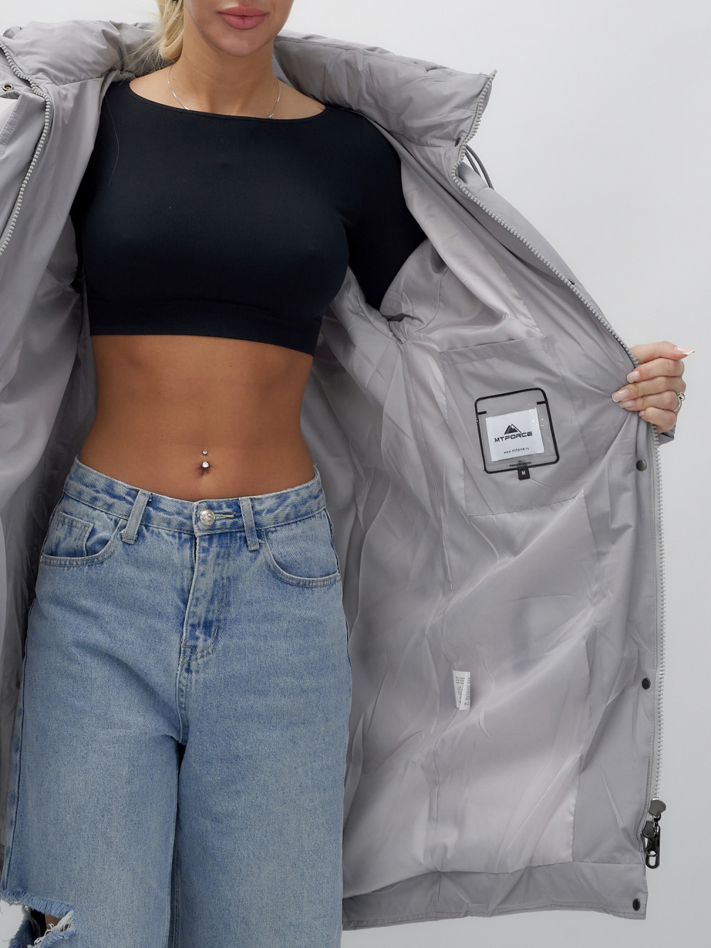 Куртка зимняя женская с капюшоном удлиненная стеганная серого цвета 9638Sr — MTFORCE