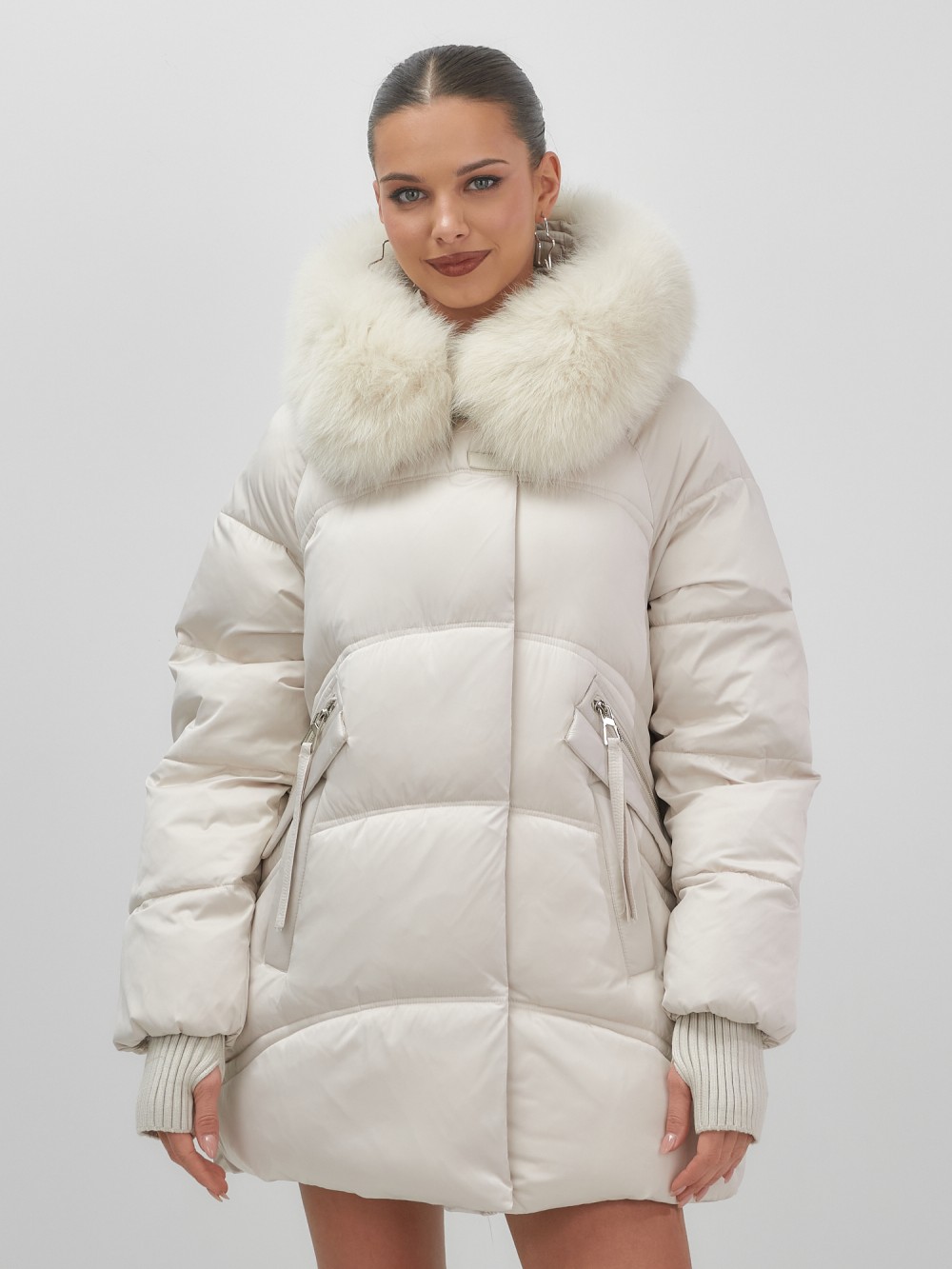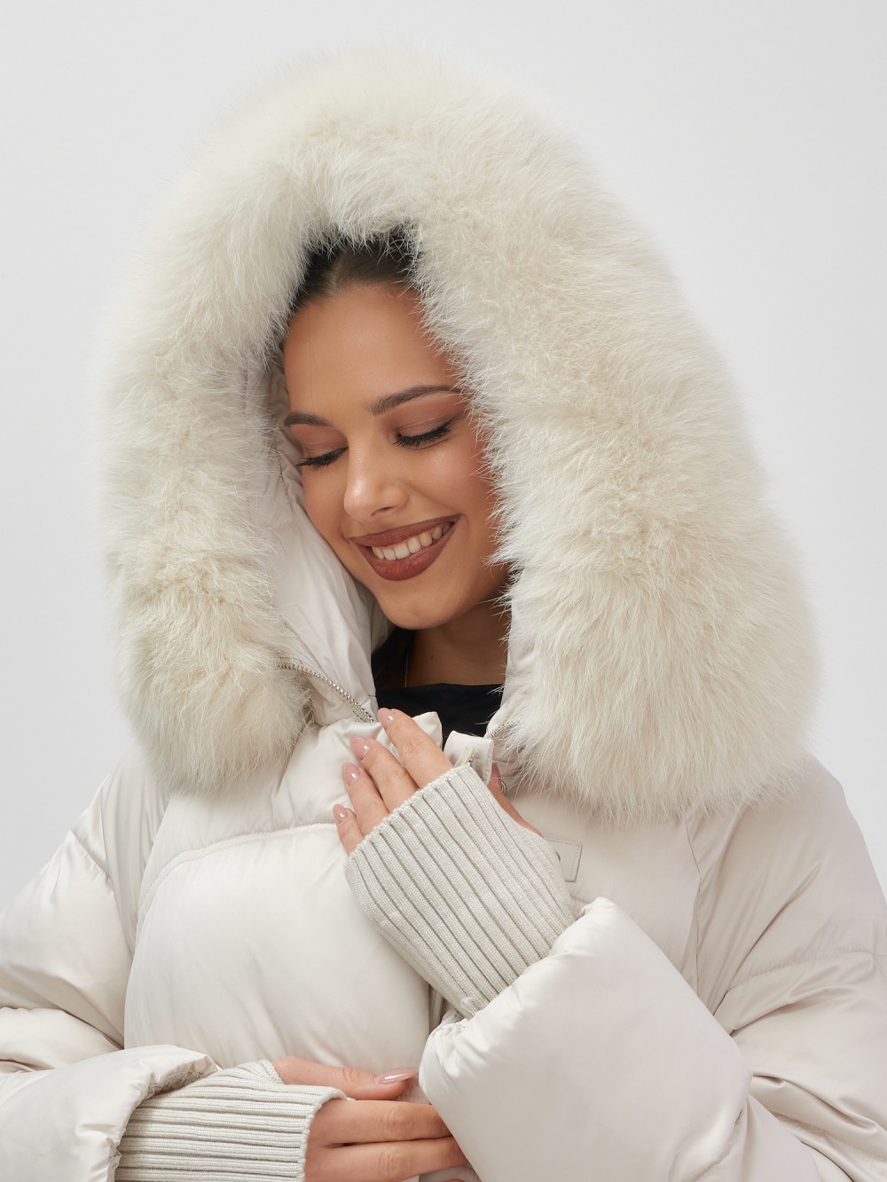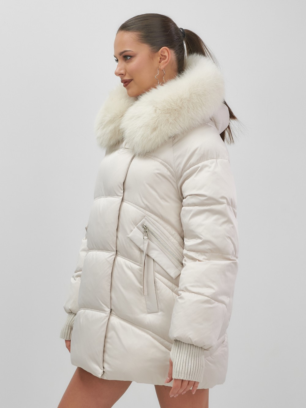 Куртка зимняя женская с мехом и капюшоном тренд бежевого цвета 7737B