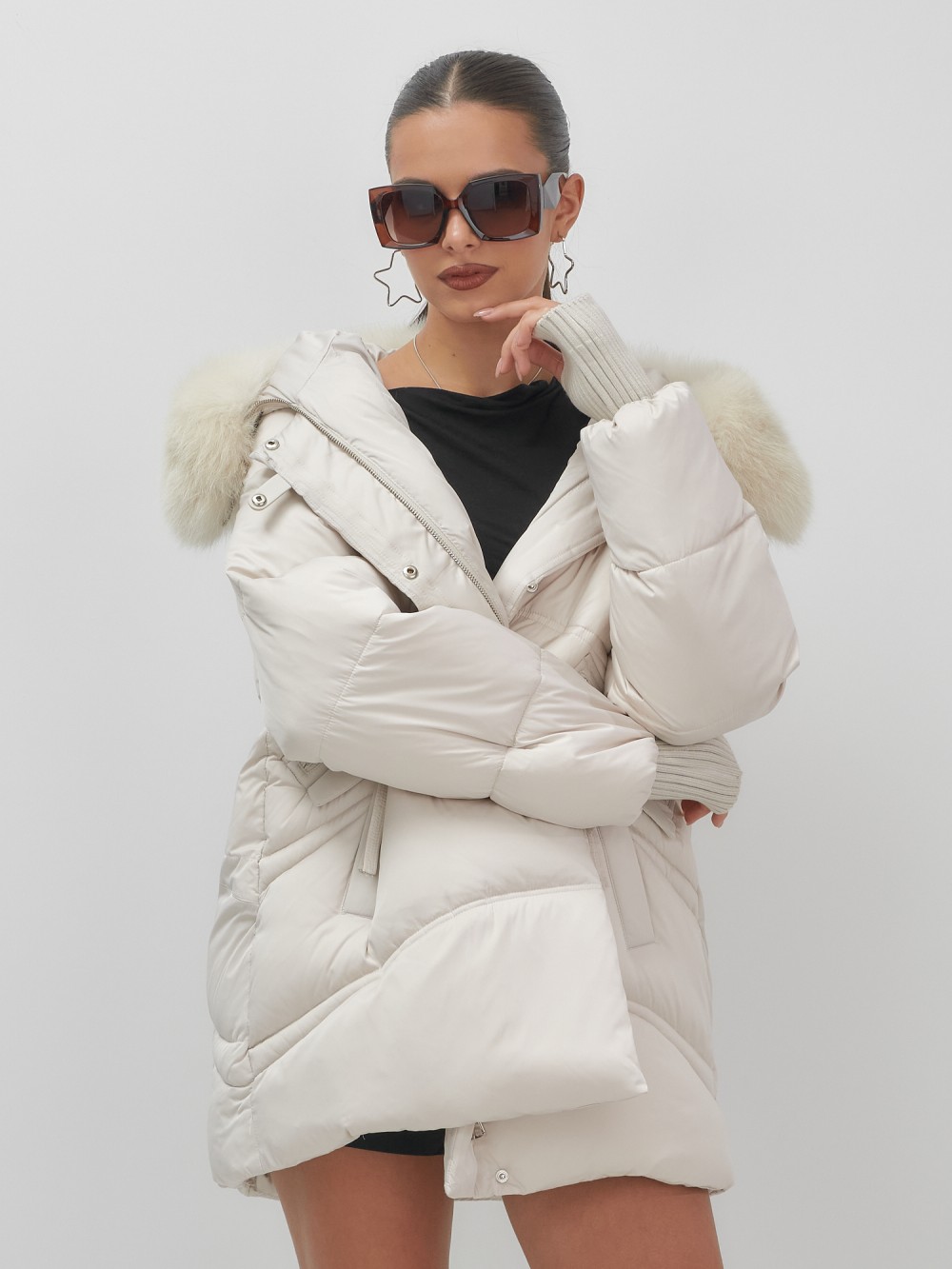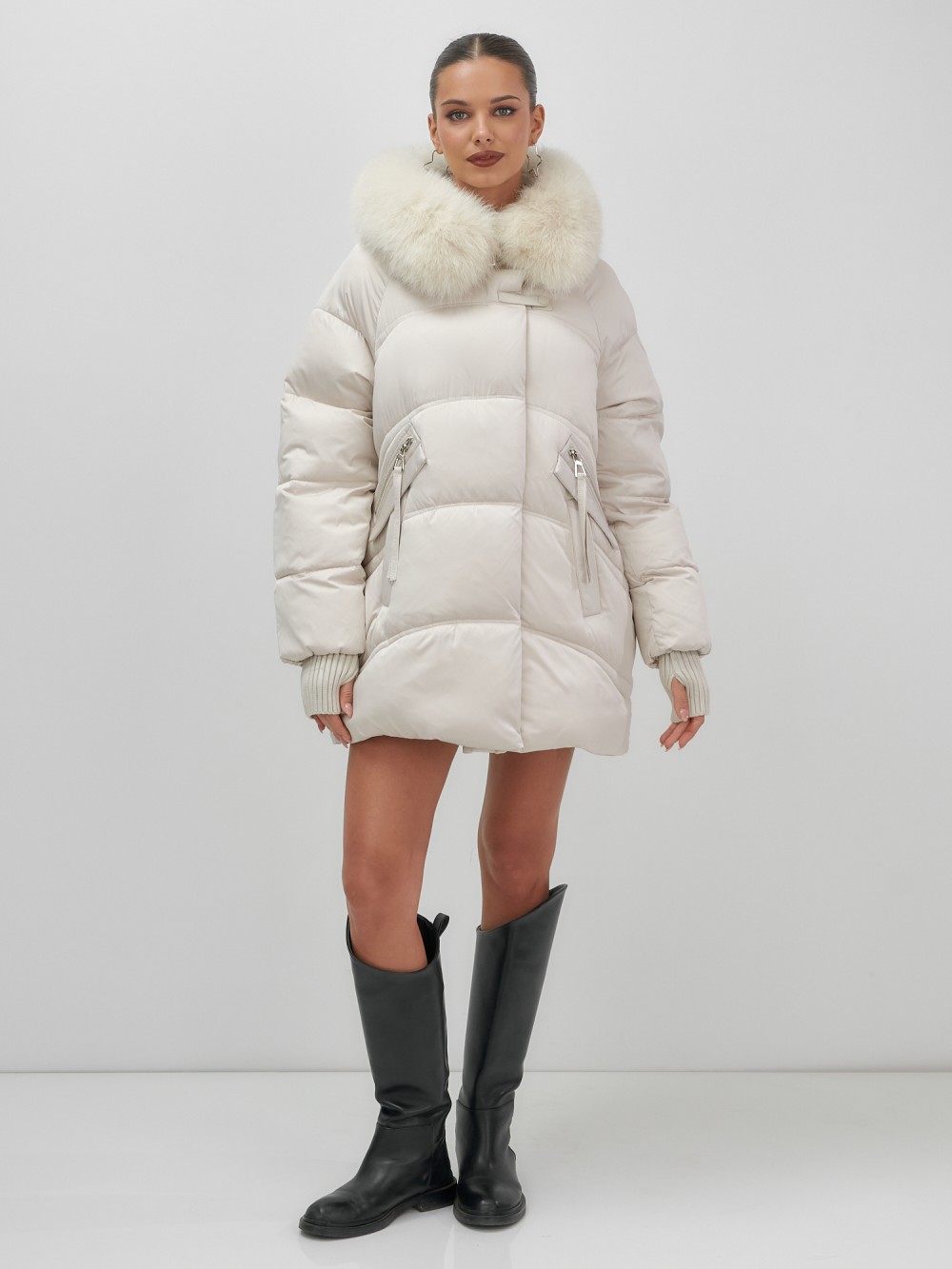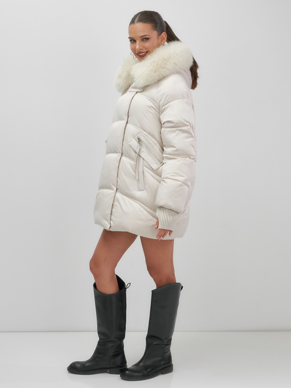 Куртка зимняя женская с мехом и капюшоном тренд бежевого цвета 7737B