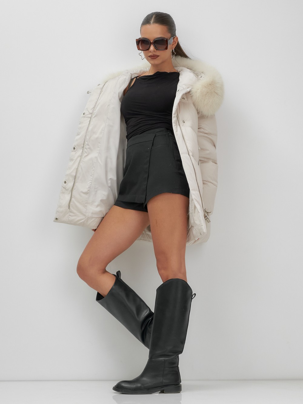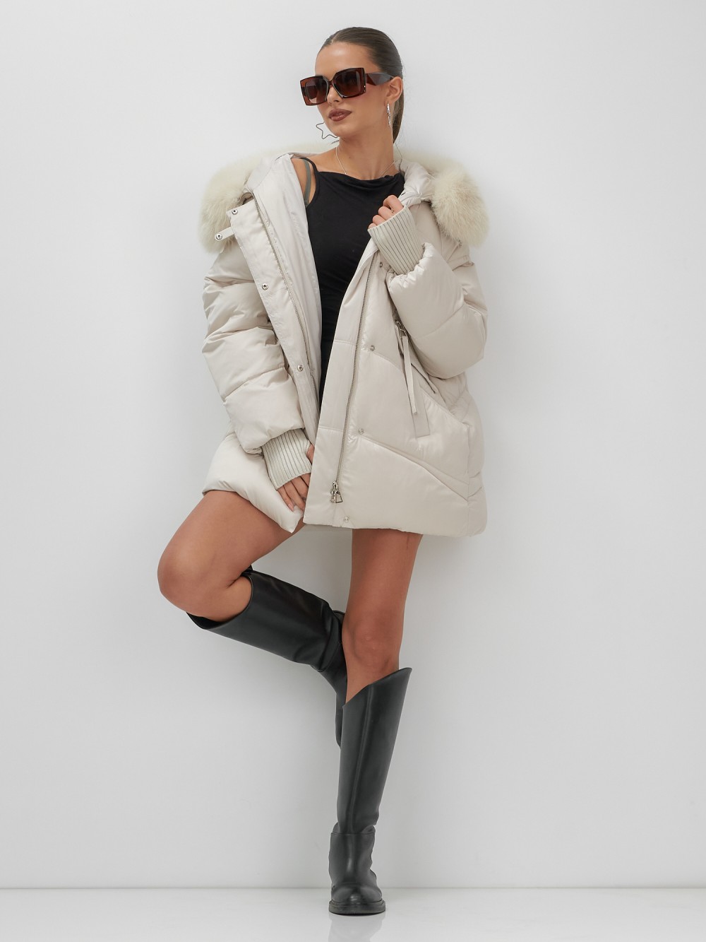 Пять трендовых оттенков сезона осень-зима 2025 – глубокий черный, благородный коричневый, нежный светло-коричневый, изысканный темно-зеленый и элегантный бежевый – идеально сочетаются с роскошным мехом песца. Удлиненный силуэт до колена и свободный крой создают идеальные пропорции для размеров 46-54.