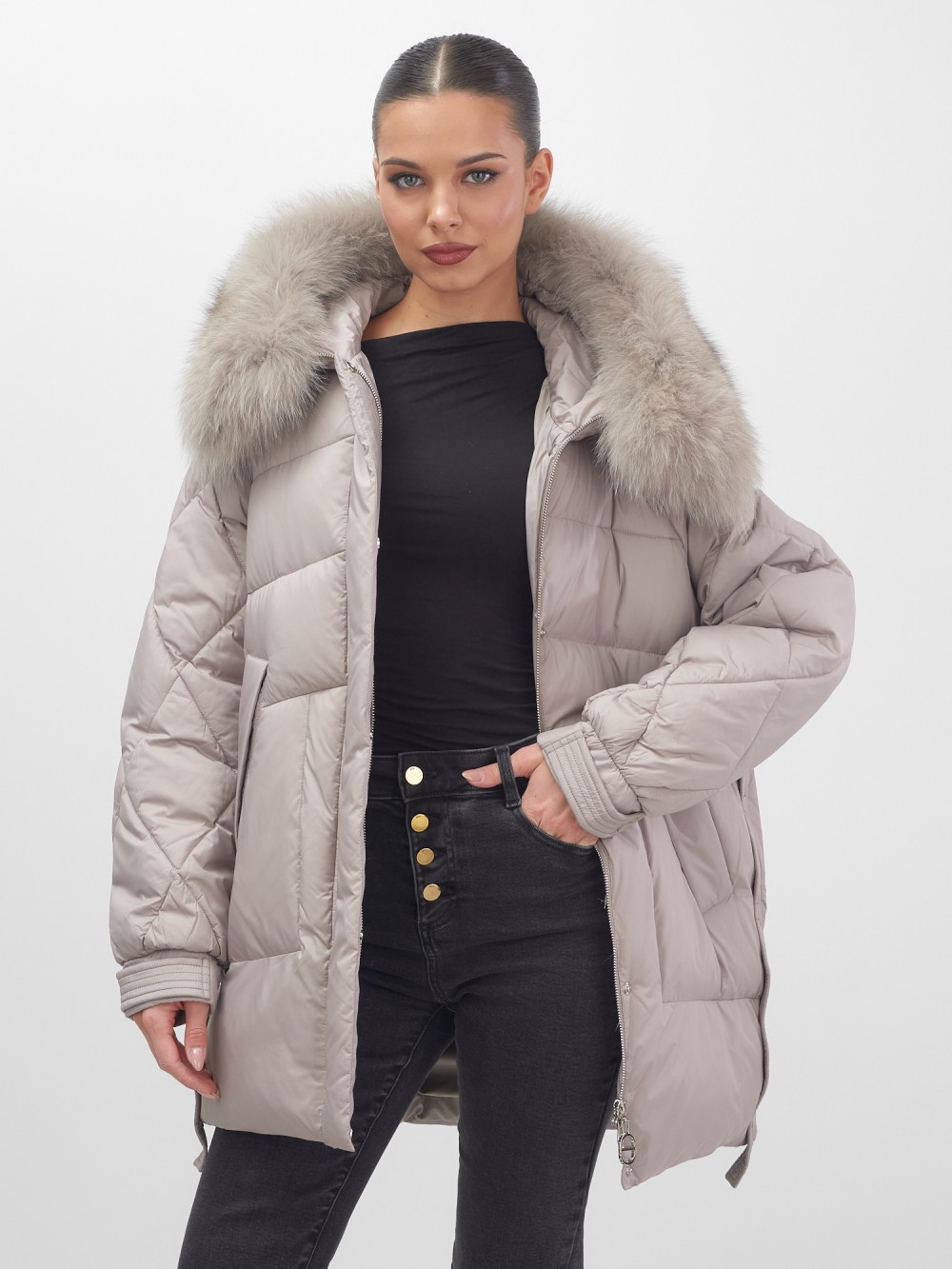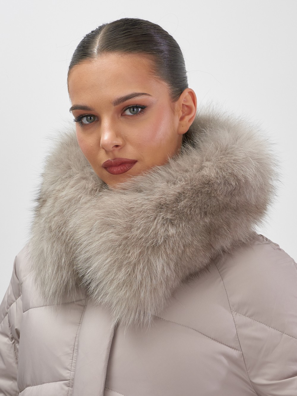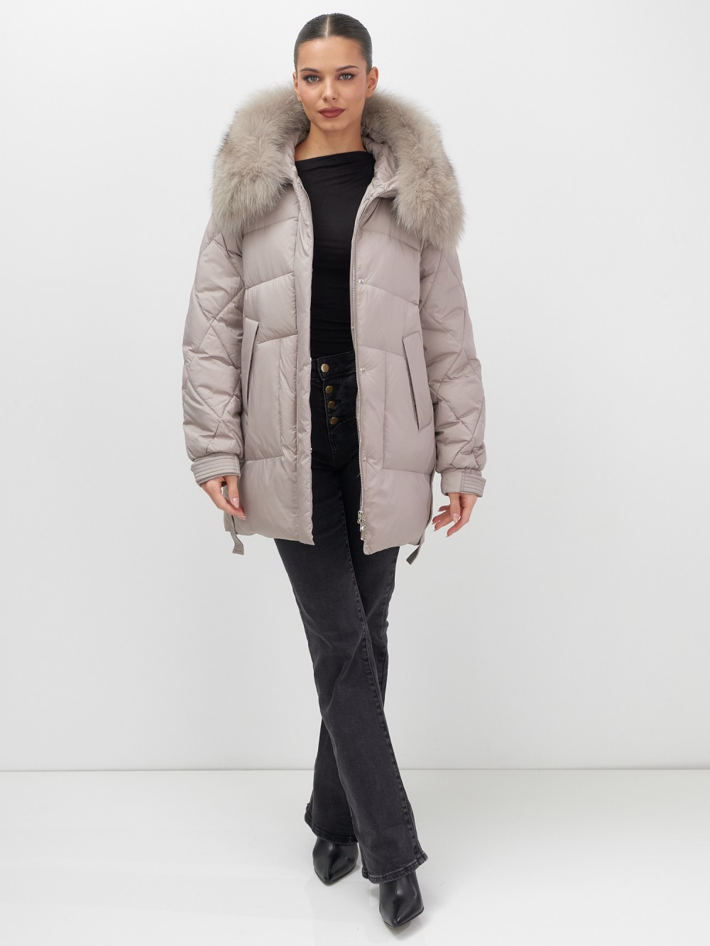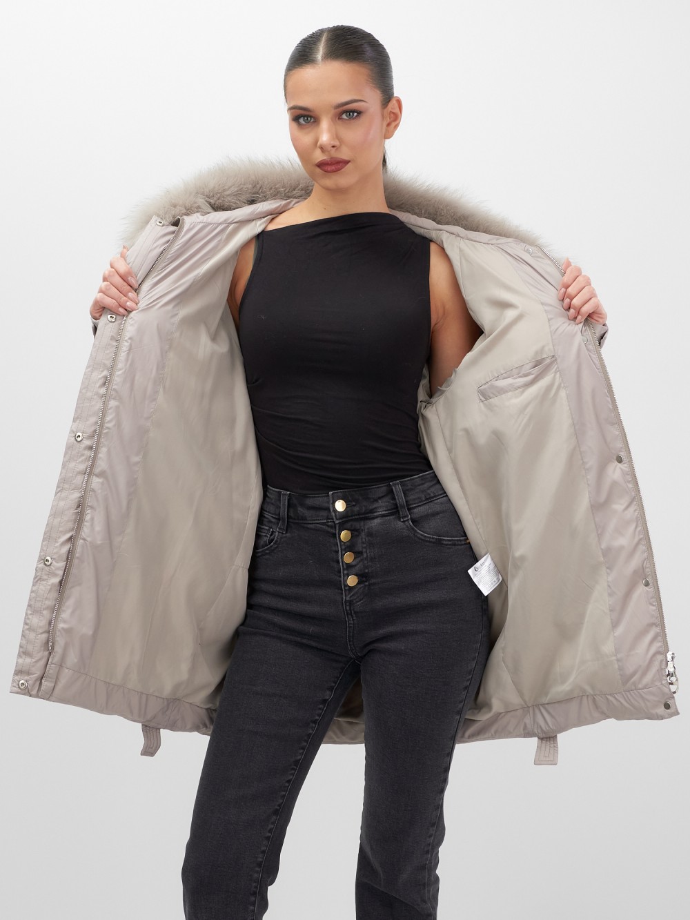 Четыре благородных оттенка – черный, бежевый, коричневый и светло-коричневый – идеально гармонируют с роскошным мехом песца, позволяя создавать элегантные образы для любого случая. Удлиненный силуэт до колена в сочетании с натуральным мехом песца делает фигуру более стройной и грациозной.