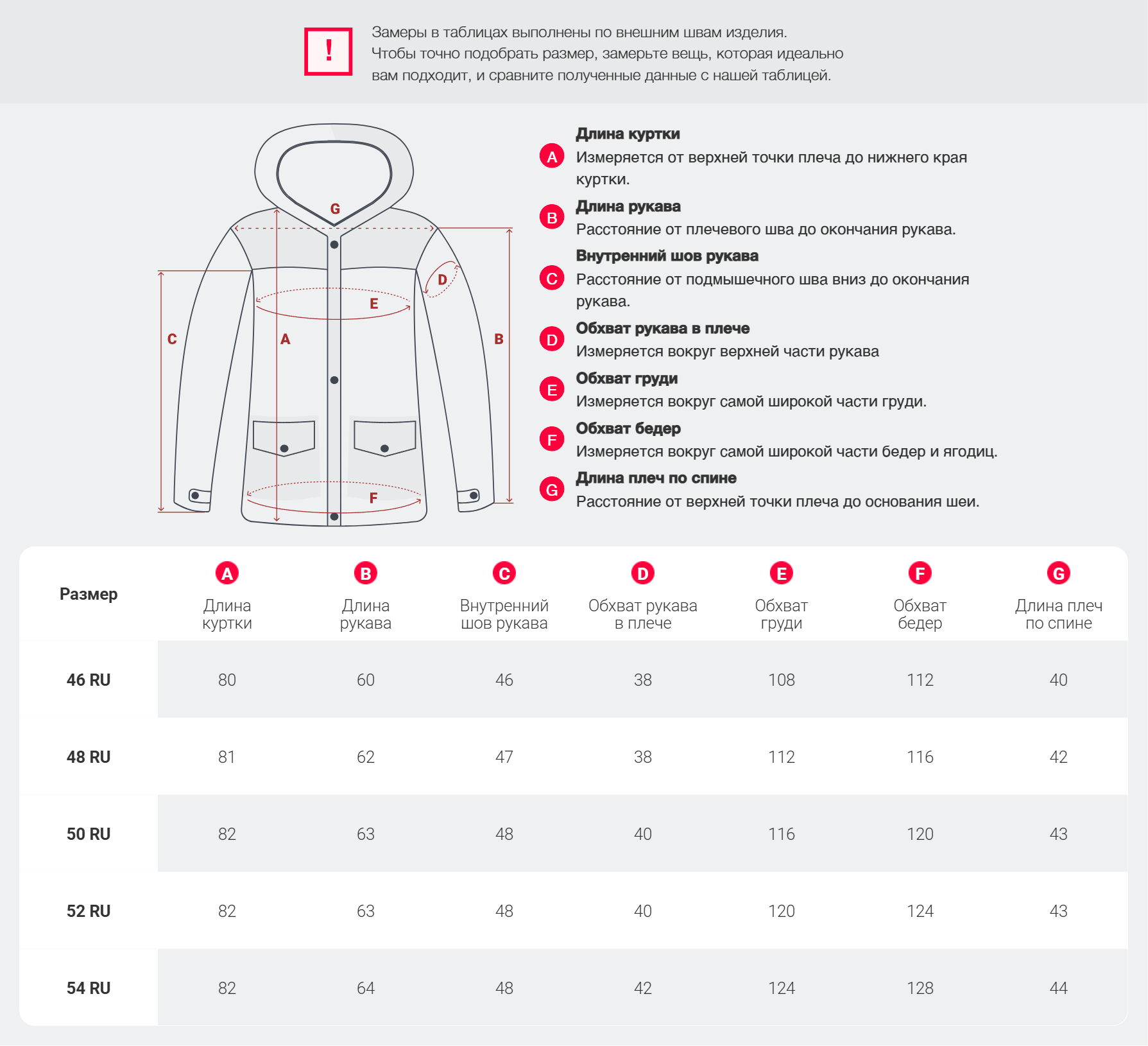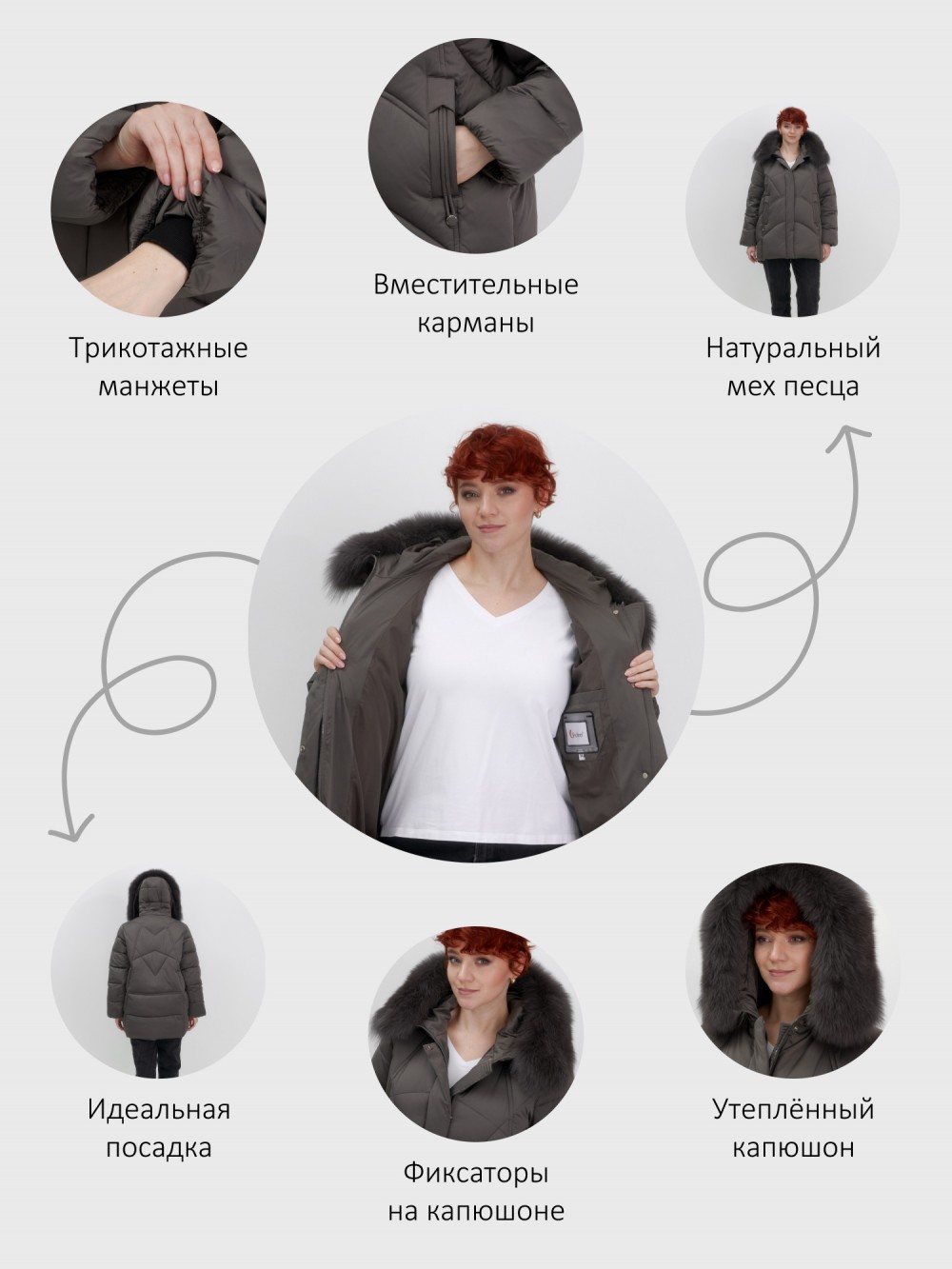 - Декоративные элементы: Капюшон, Манжеты, Карманы, Мех