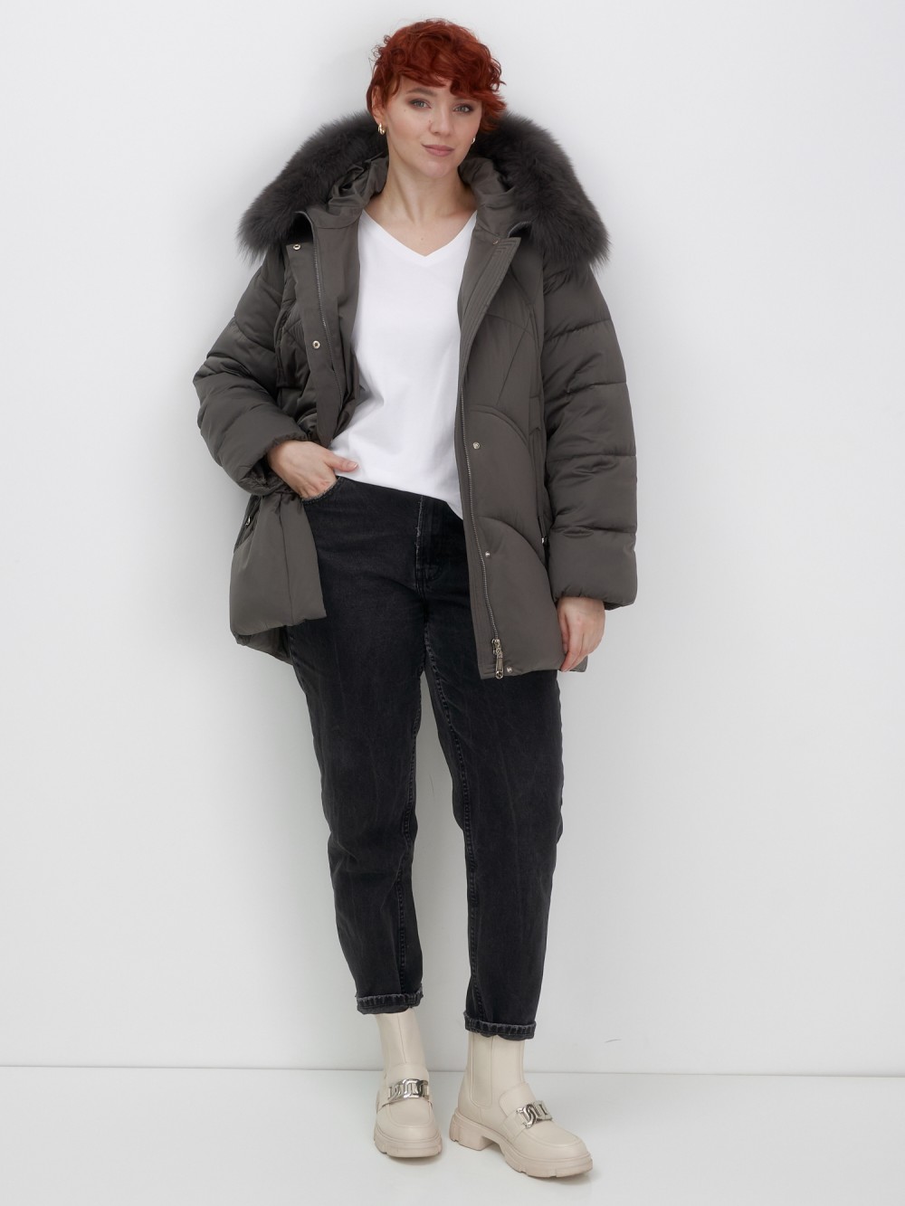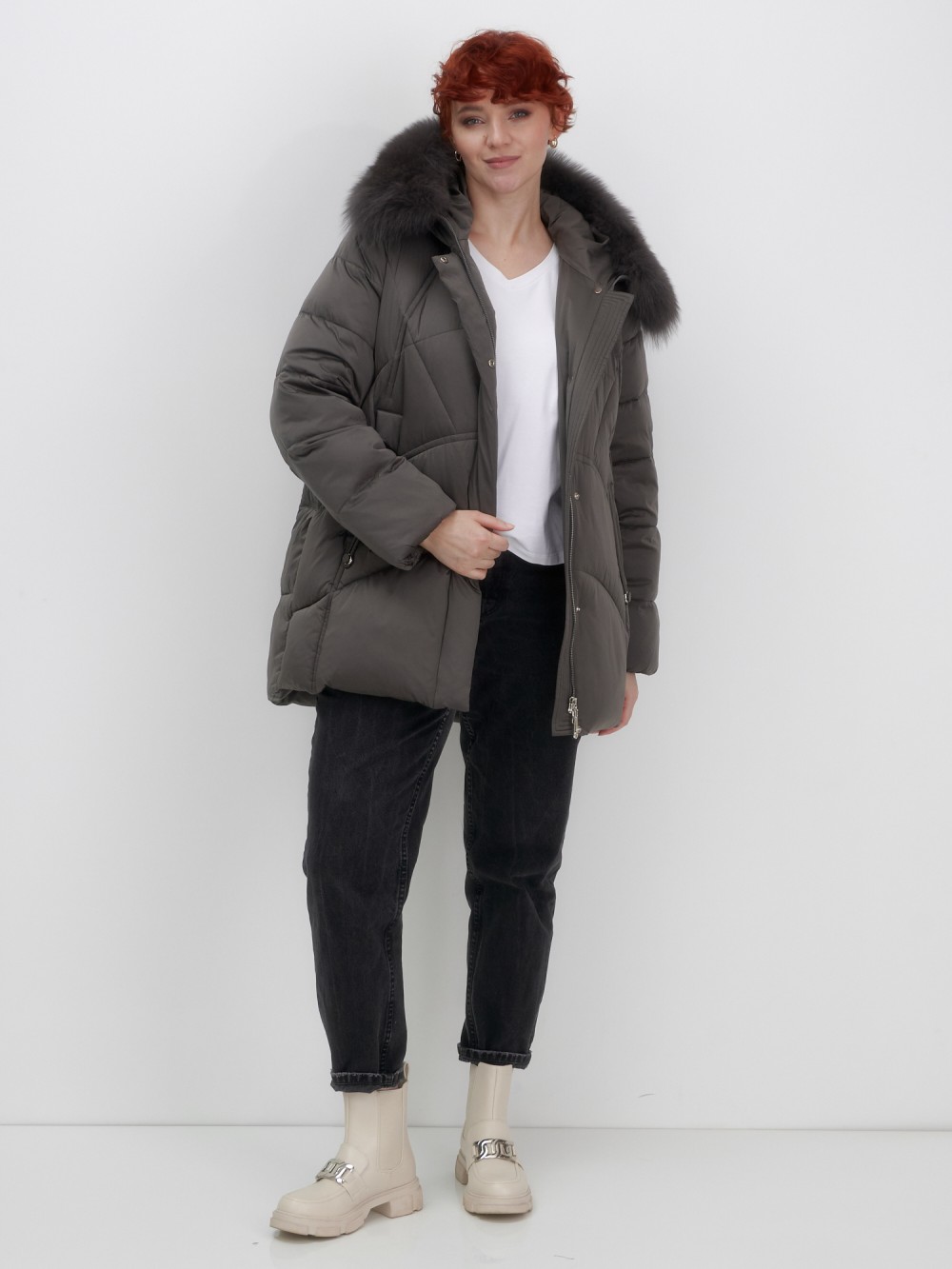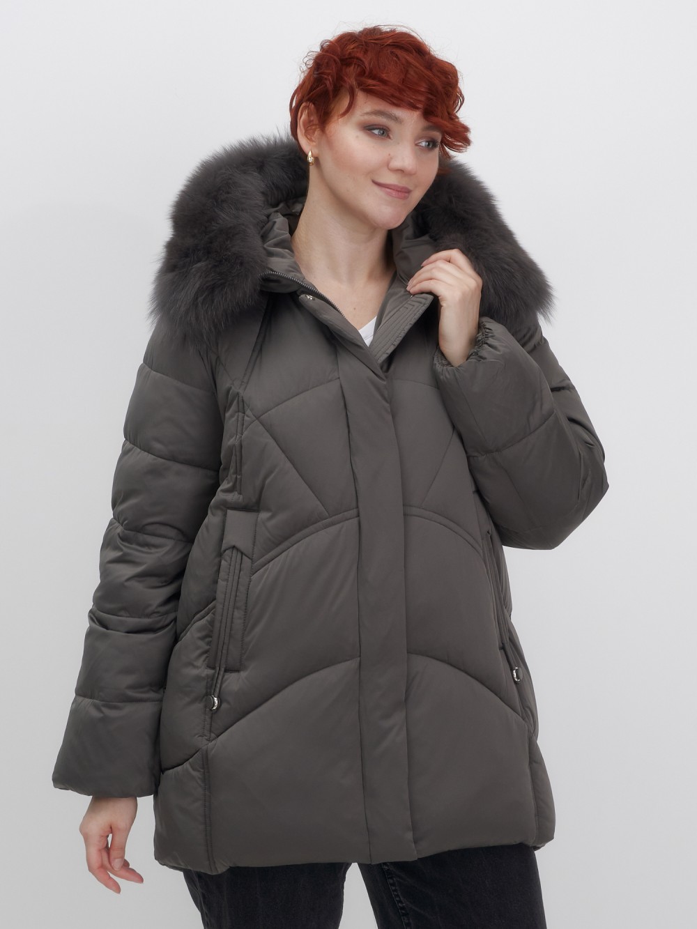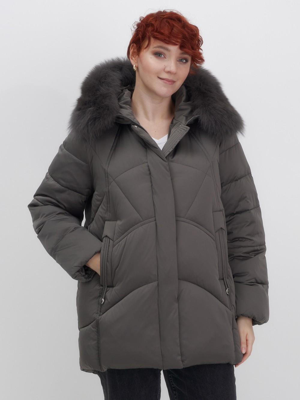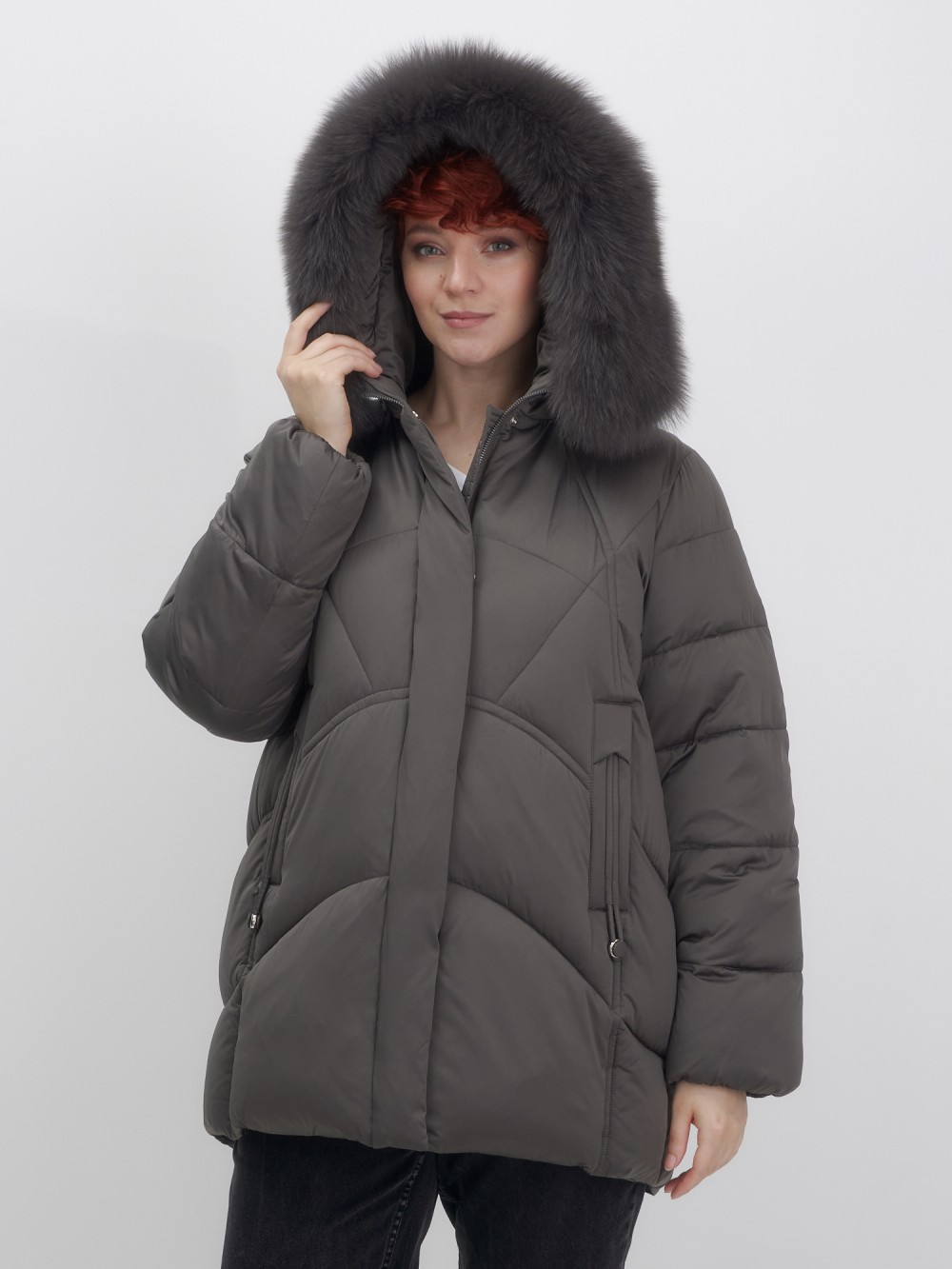 Куртка зимняя женская с мехом и капюшоном тренд темно-серого цвета 7656TC — Visdeer
